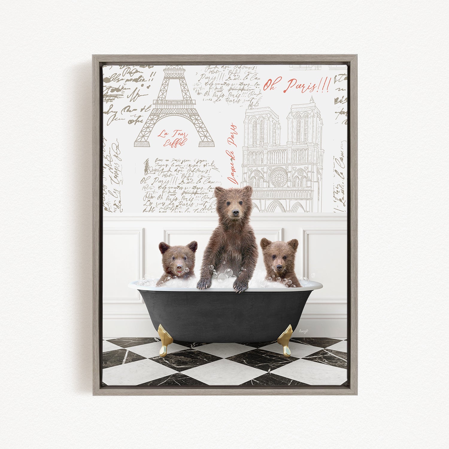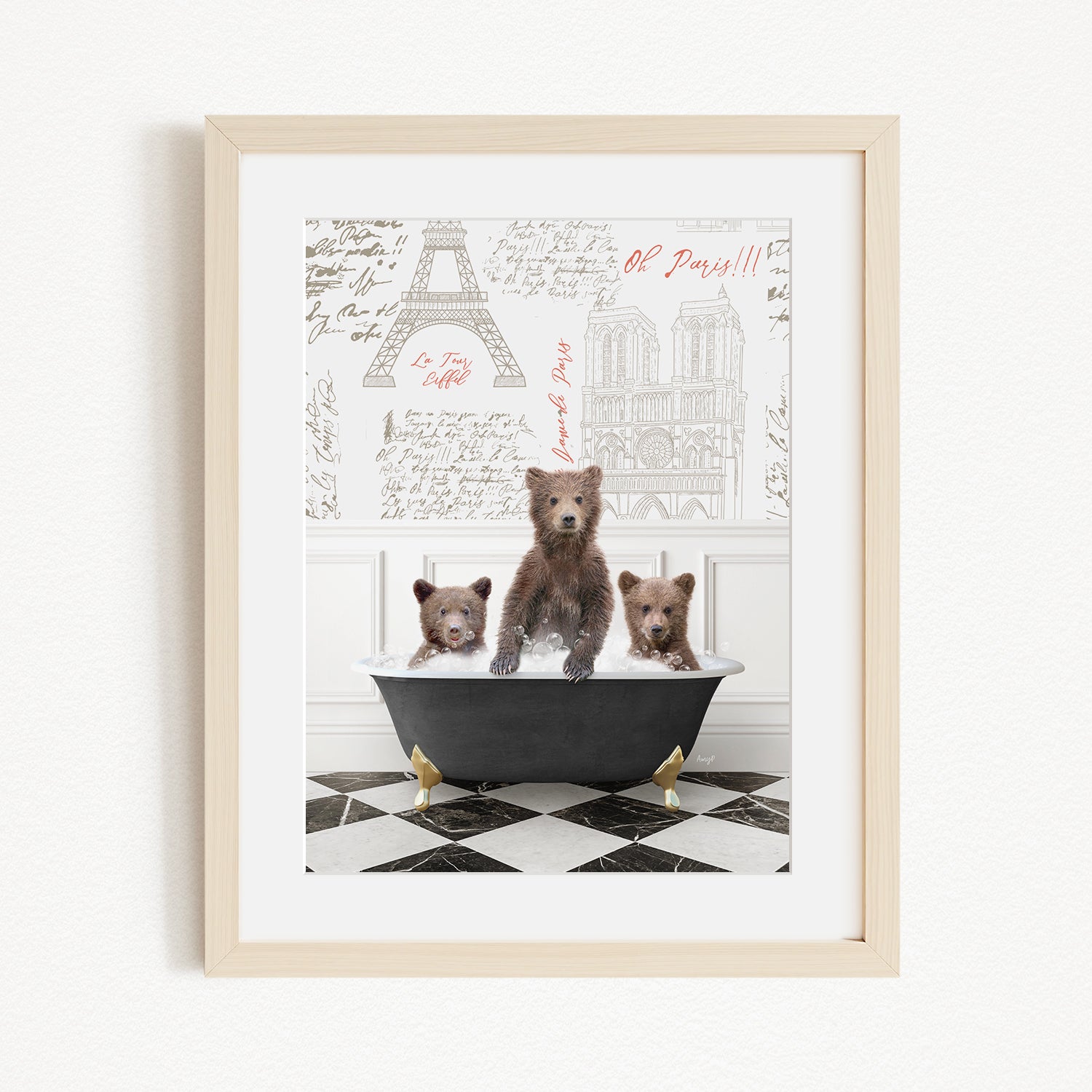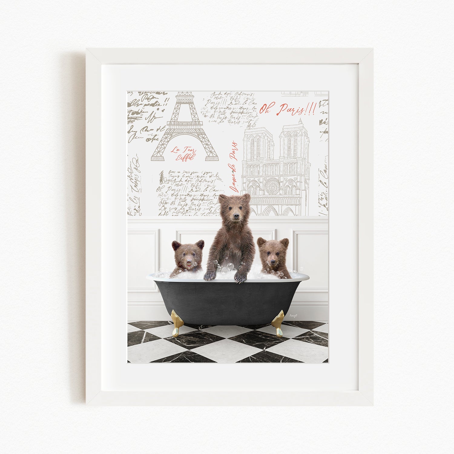 A framed image depicting three bears sitting in a bathtub, with a Paris-themed background featuring the Eiffel Tower and other Parisian landmarks.