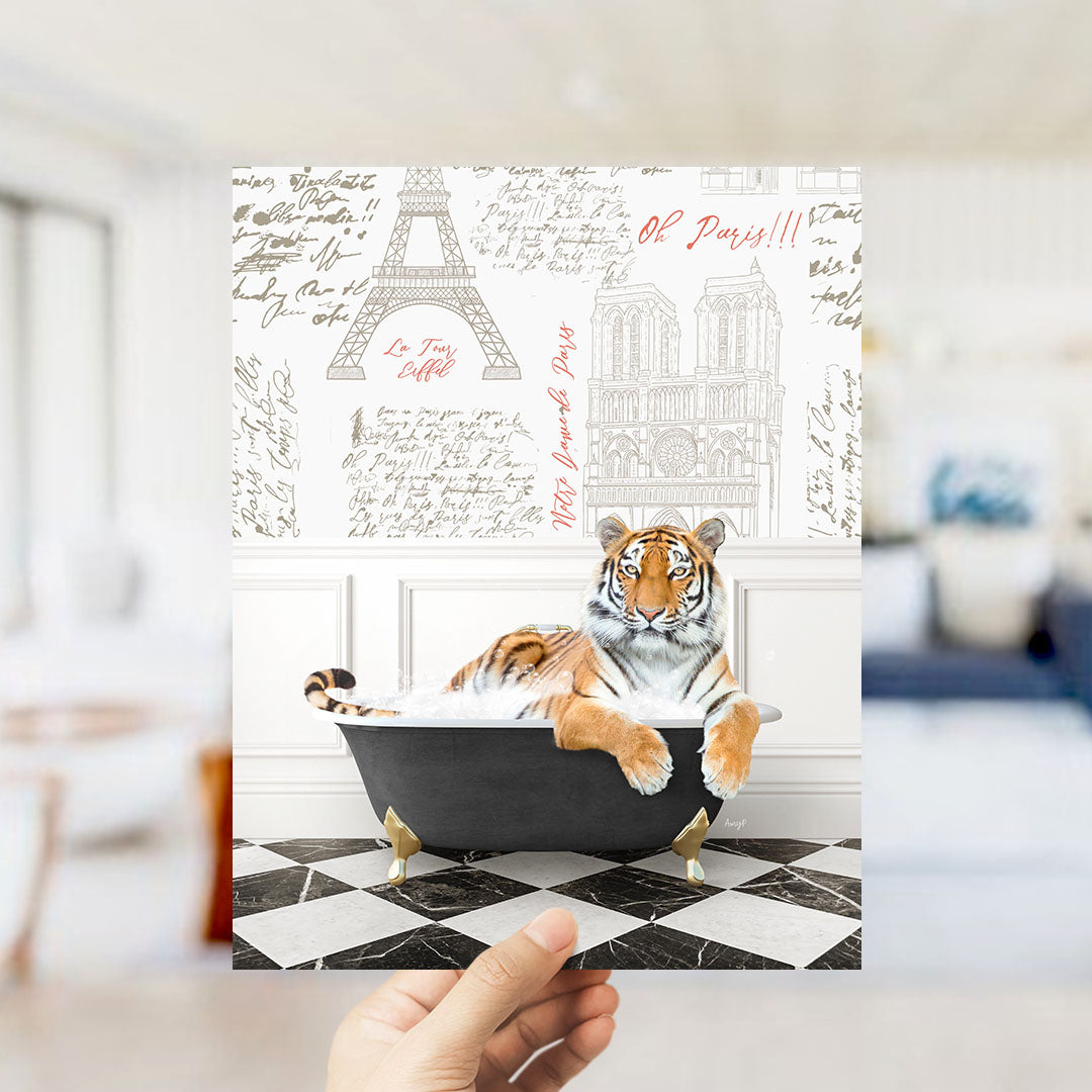 A hand is holding up a printed image featuring a tiger sitting in a bathtub, with the Eiffel Tower and other Parisian landmarks visible in the background.