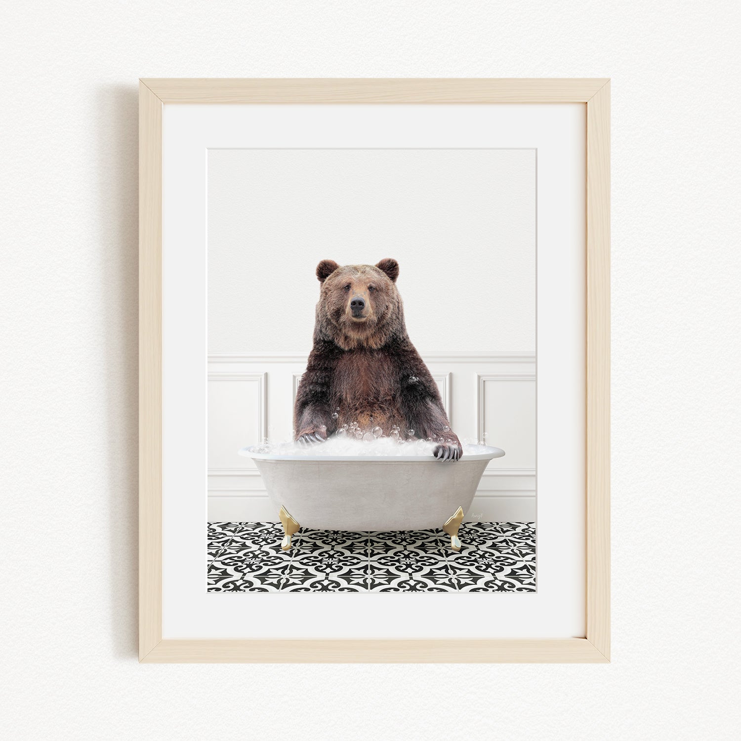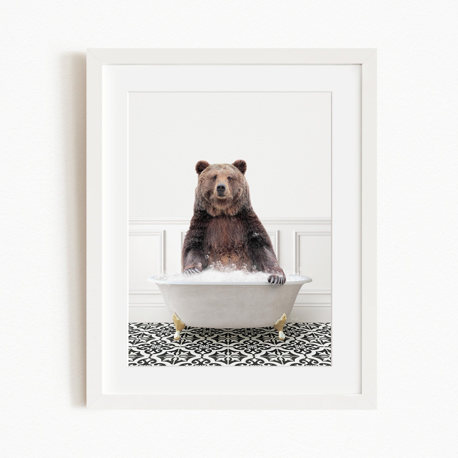 A brown bear sitting in a white bathtub filled with bubbles, with a black and white patterned floor in the background.