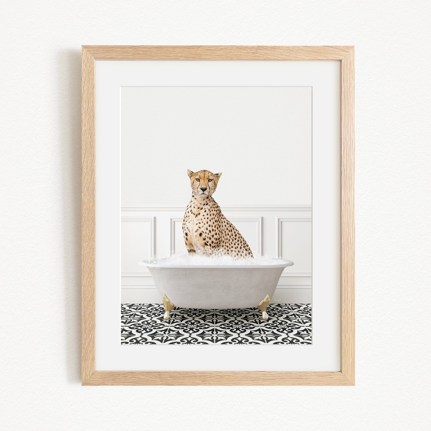 A cheetah sitting in a white bathtub filled with water, surrounded by a black and white patterned floor.