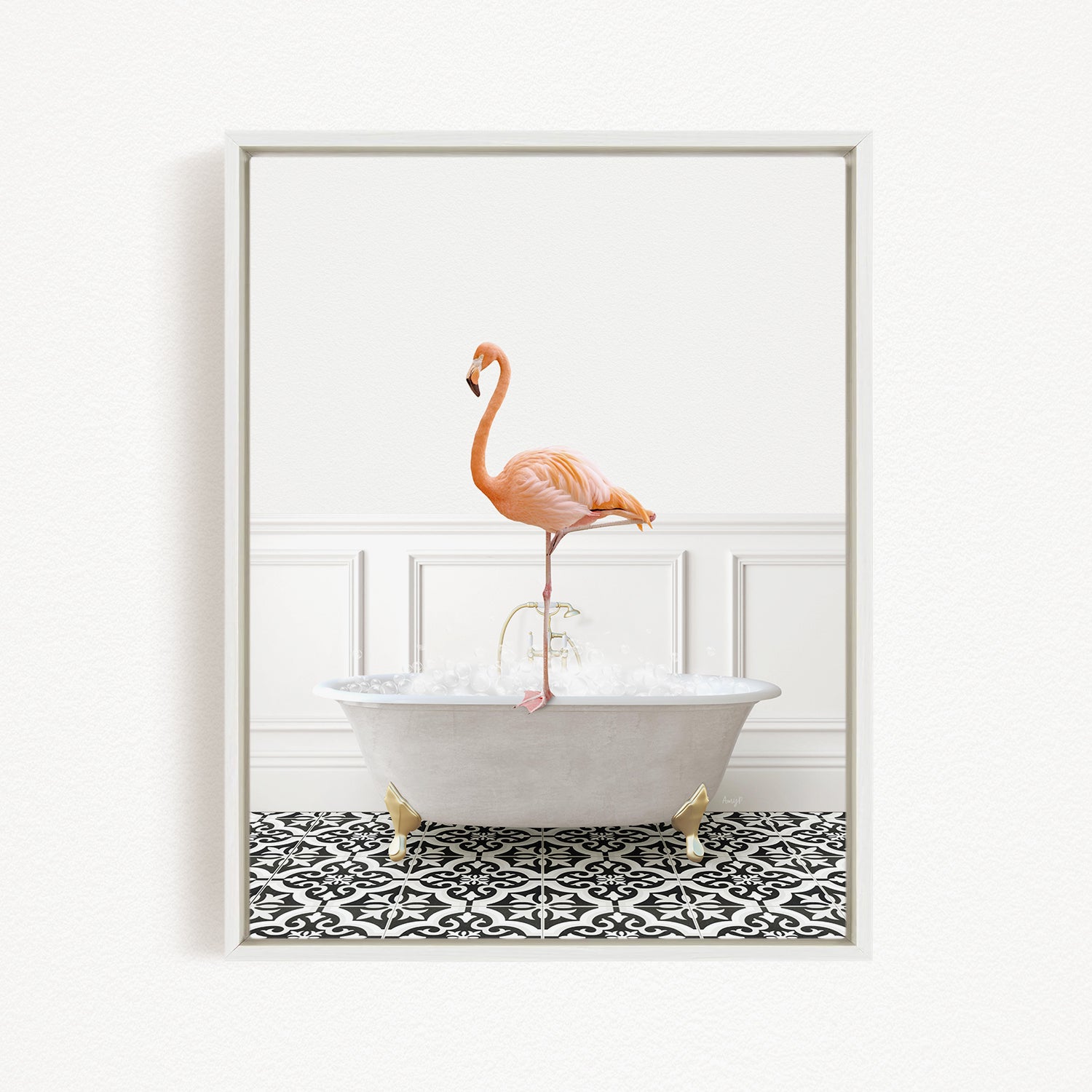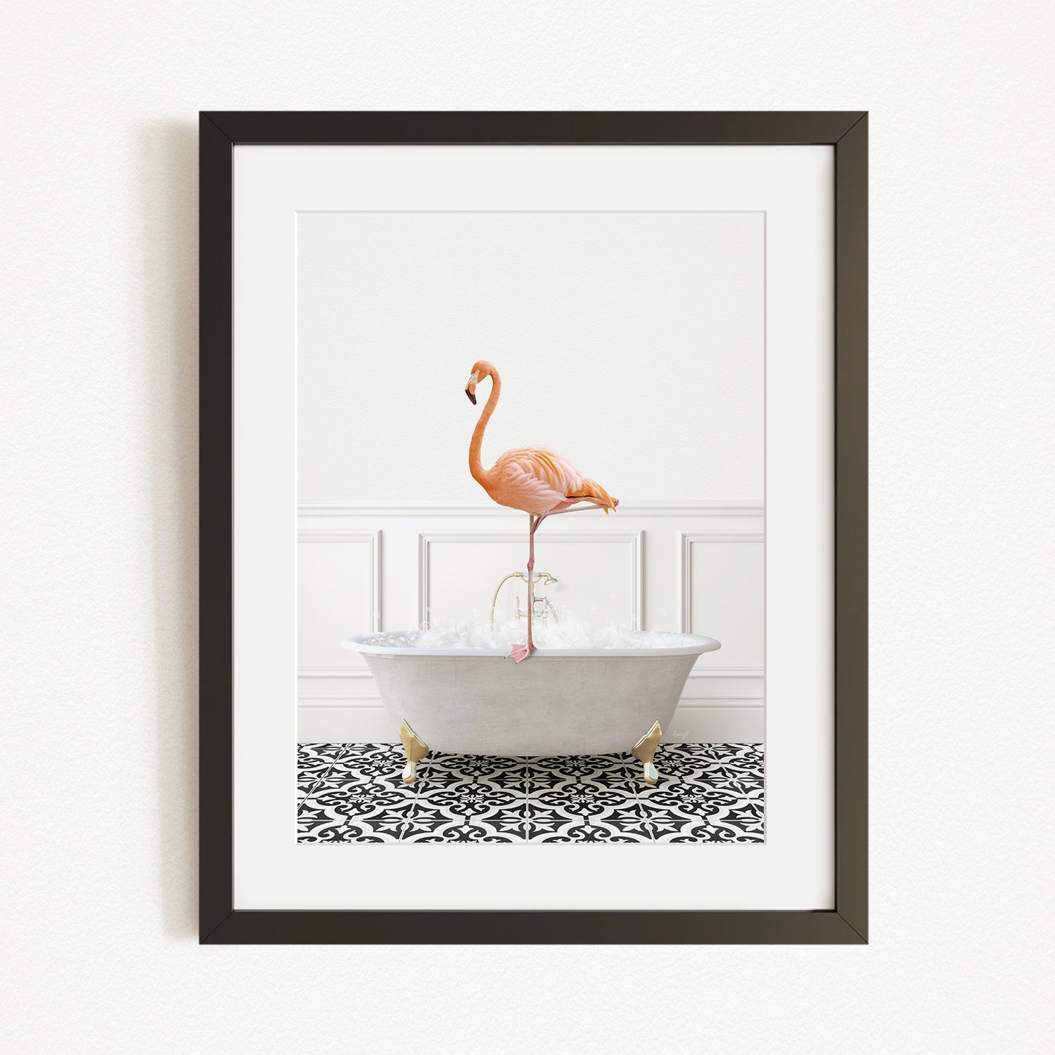 A framed image of a pink flamingo standing on a white bathtub filled with water, set against a white wall with a black and white patterned floor.