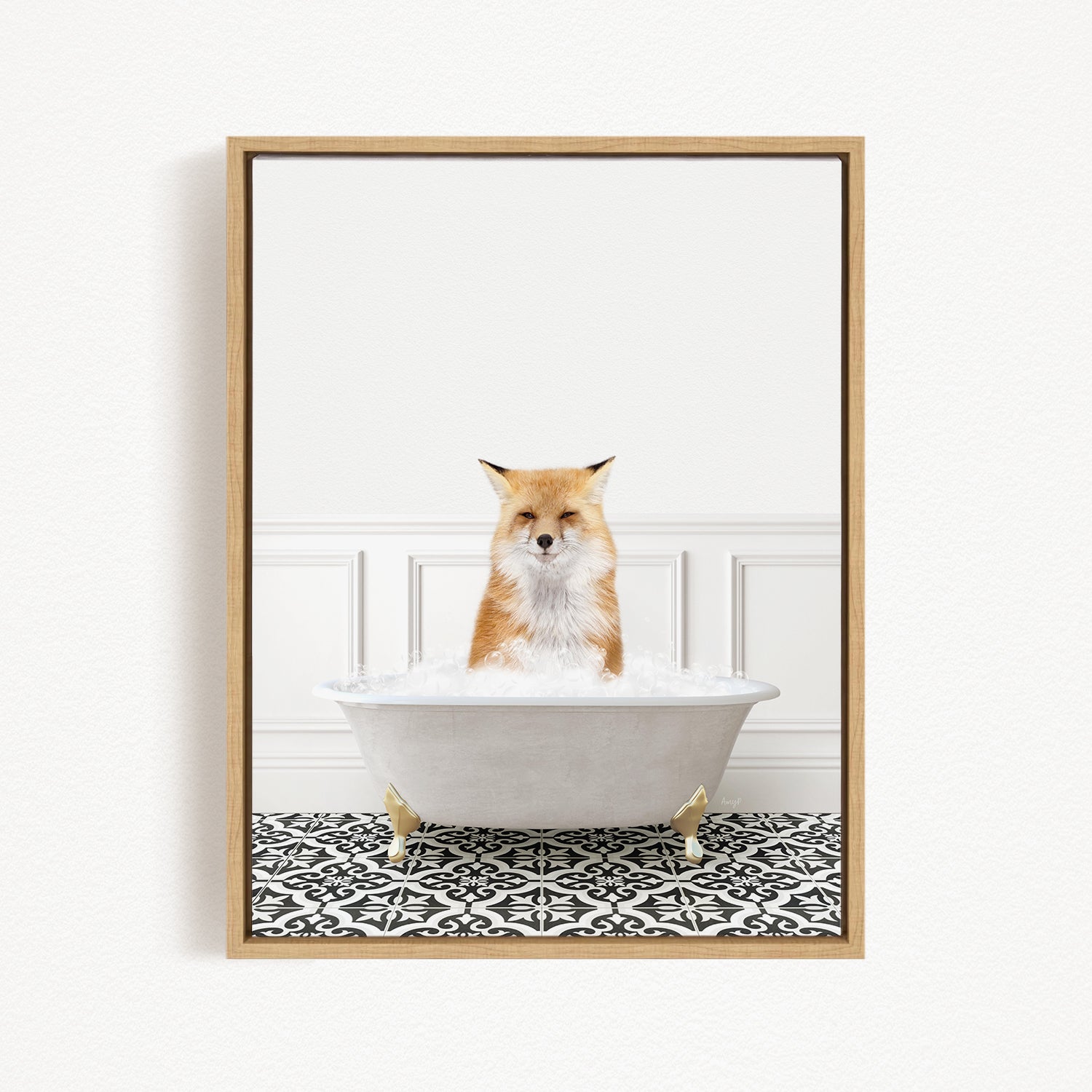 A red fox sitting in a white bathtub filled with bubbles, with a black and white patterned rug on the floor.