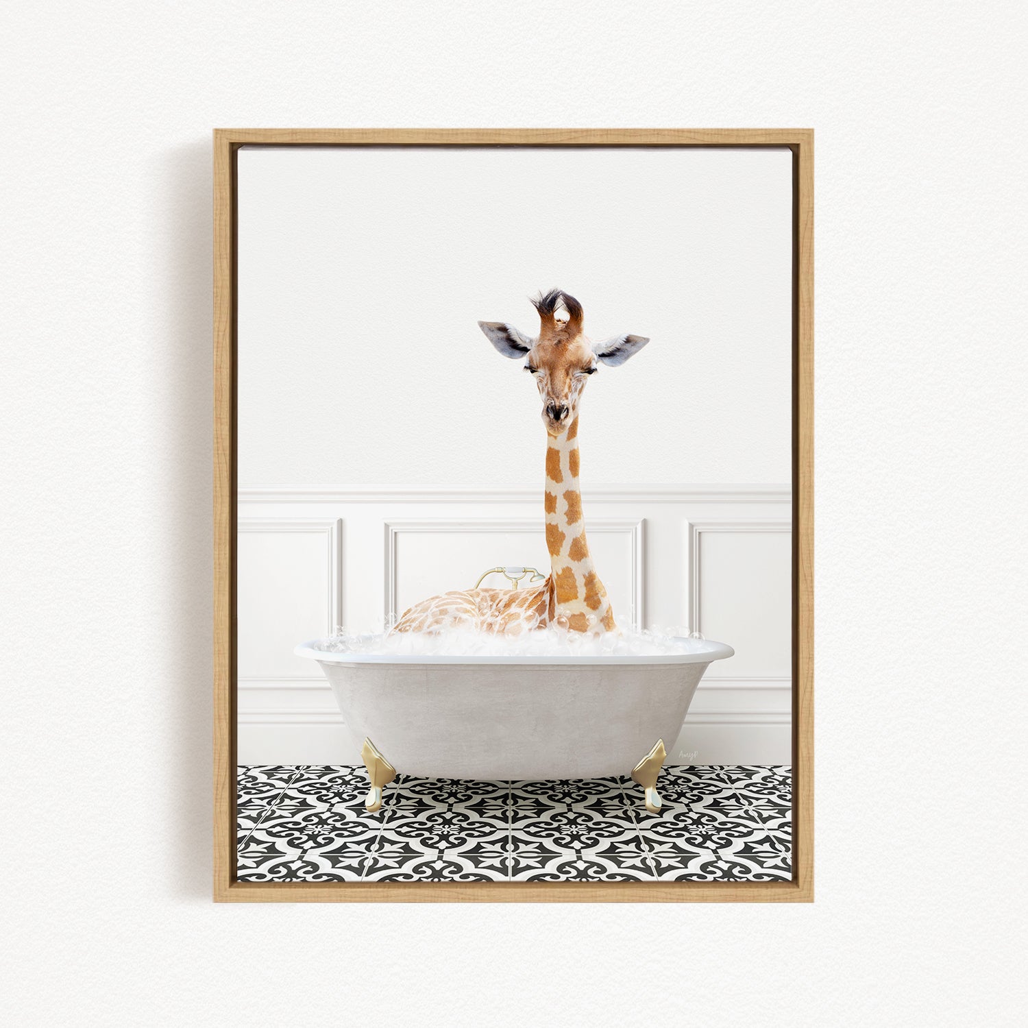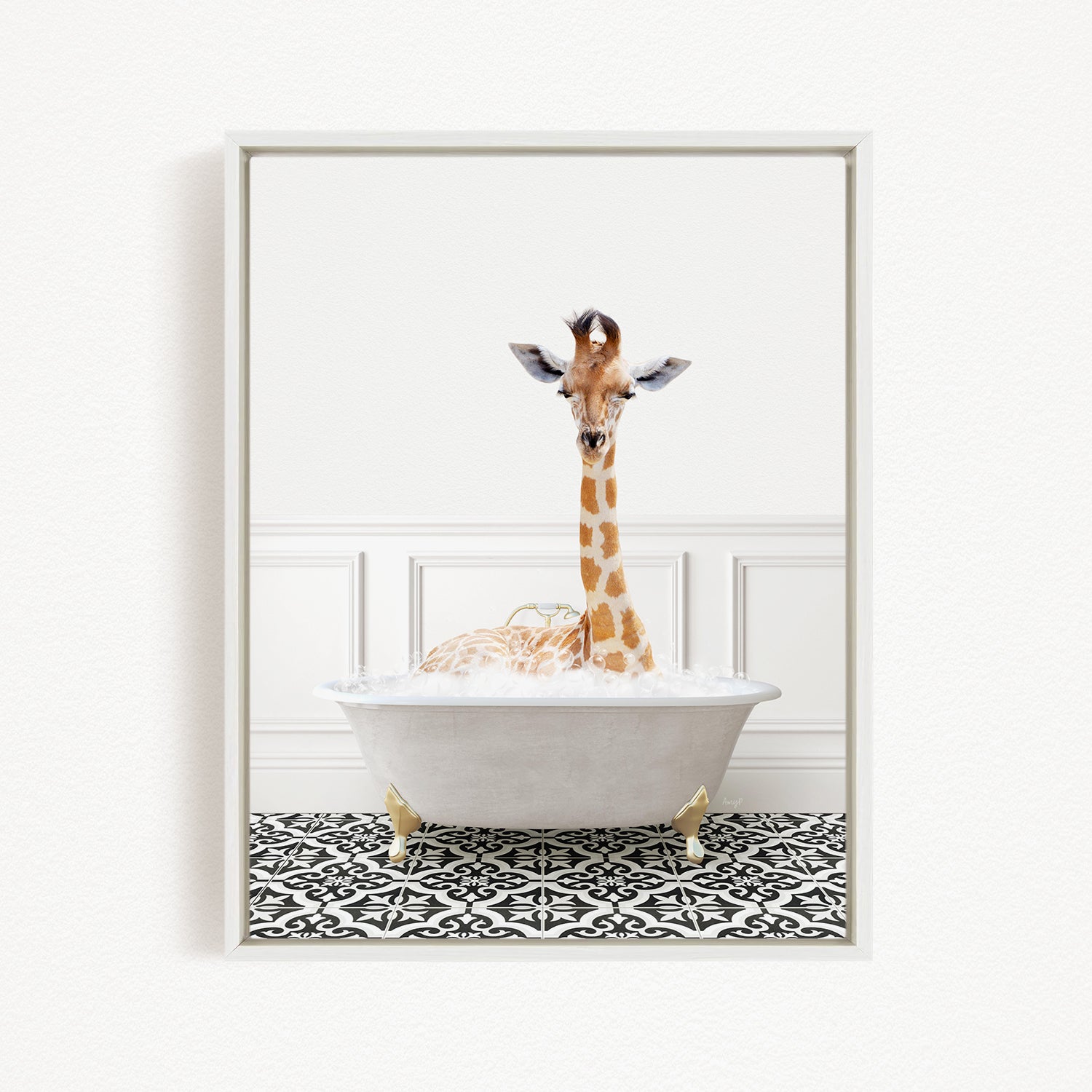 A giraffe is sitting in a white bathtub filled with water, creating a whimsical and playful scene.