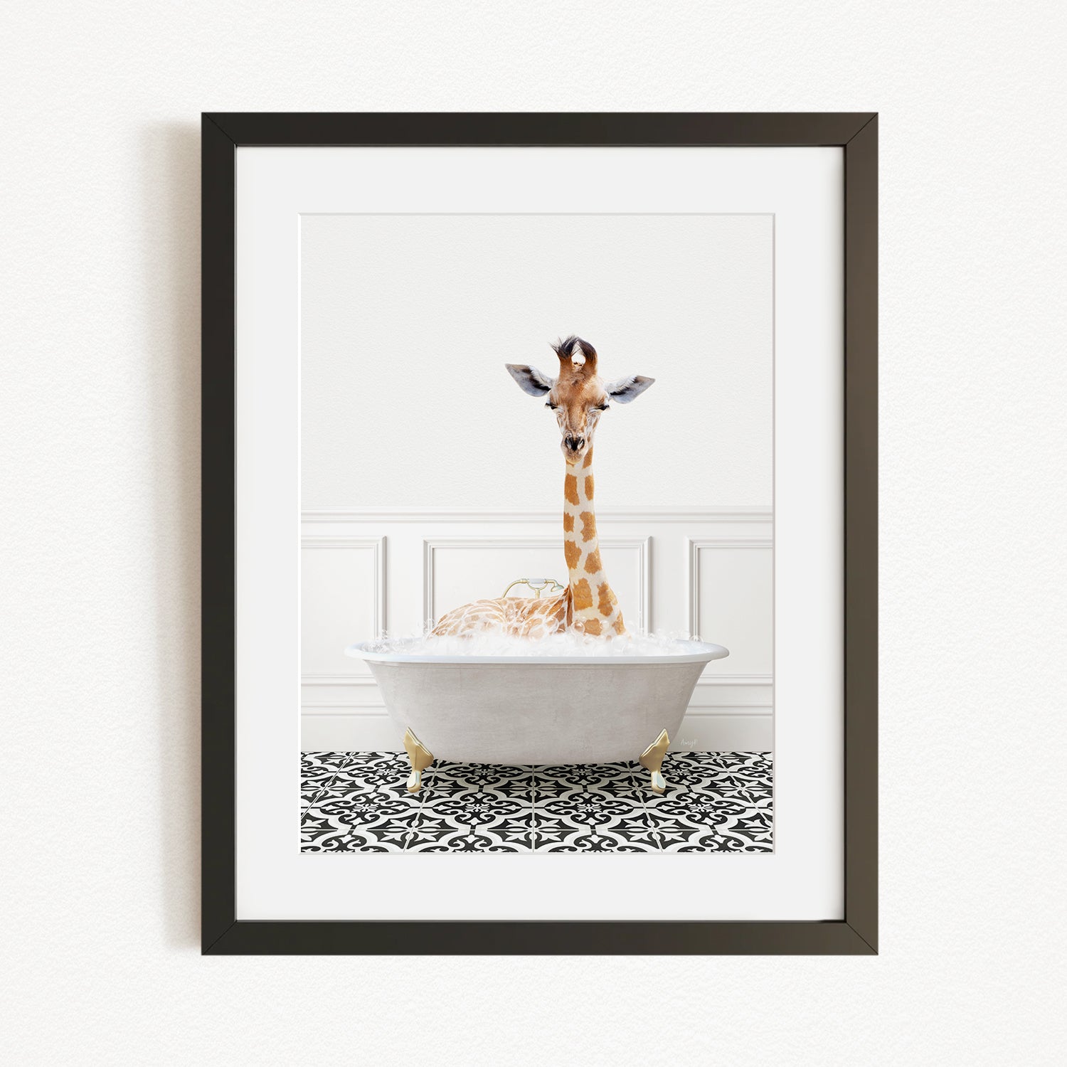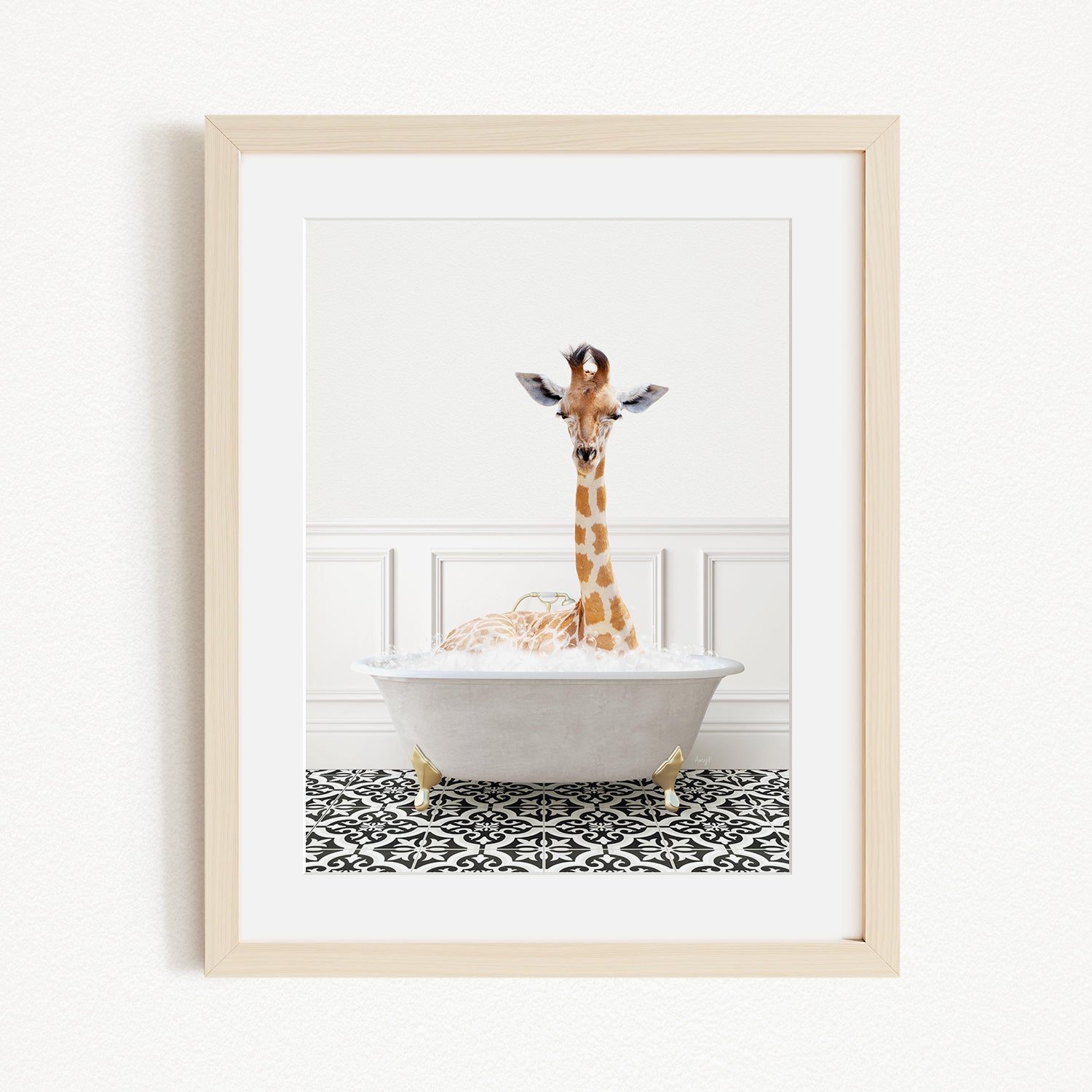 A giraffe is sitting in a white bathtub filled with bubbles, creating a whimsical and playful scene.