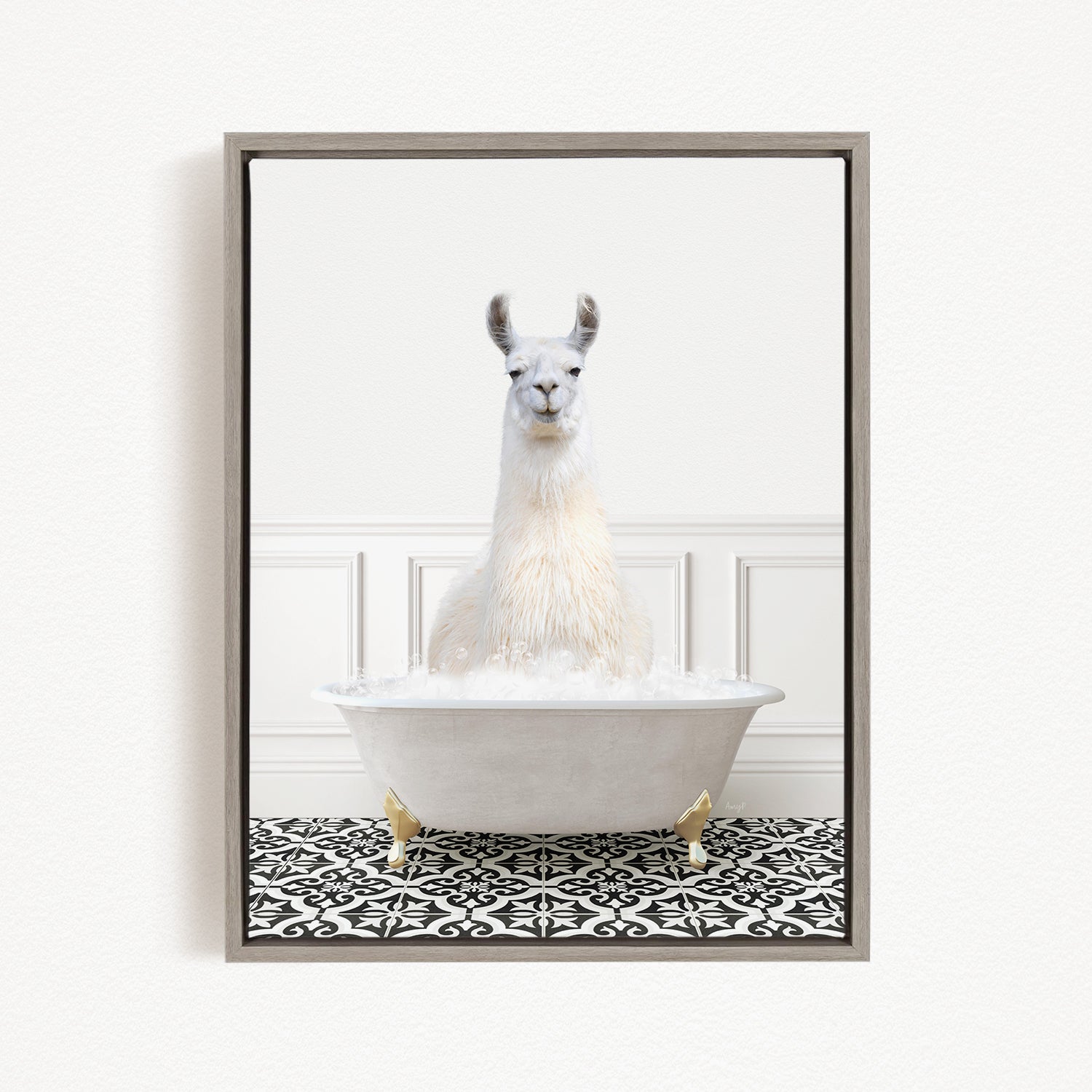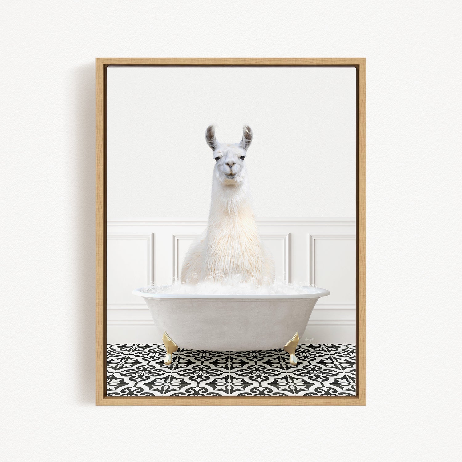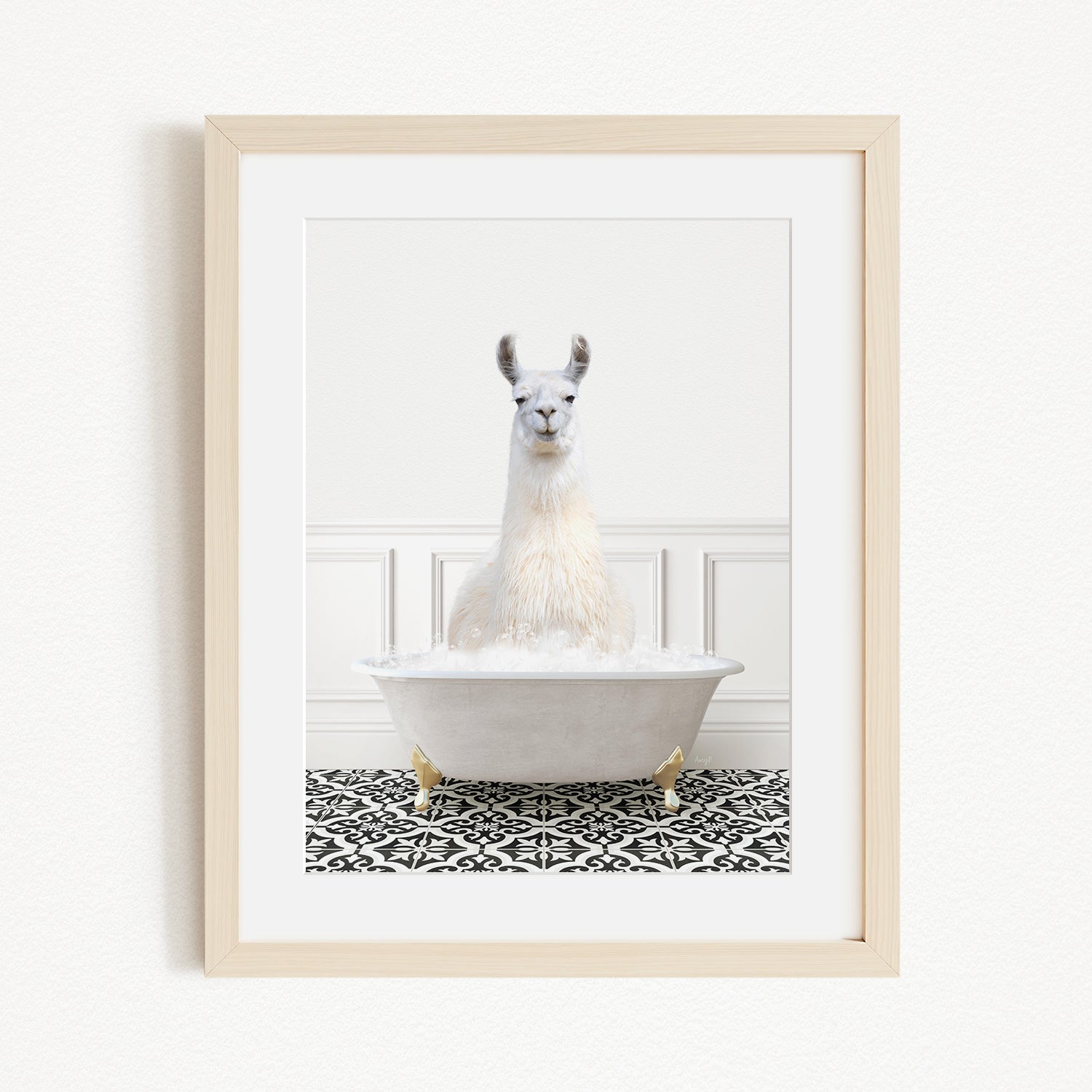 A white llama sitting in a white bathtub filled with bubbles, with a black and white patterned floor in the background.