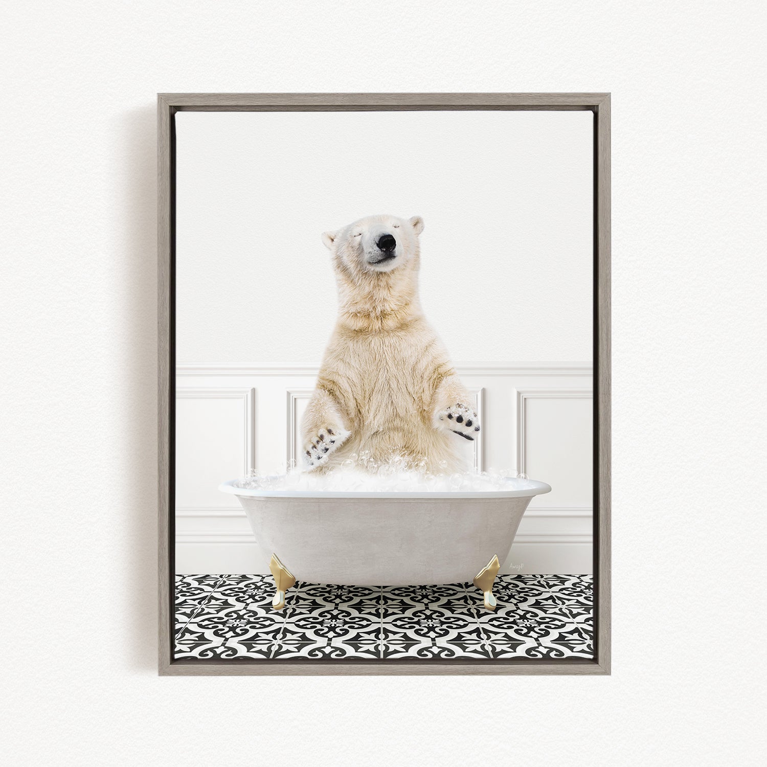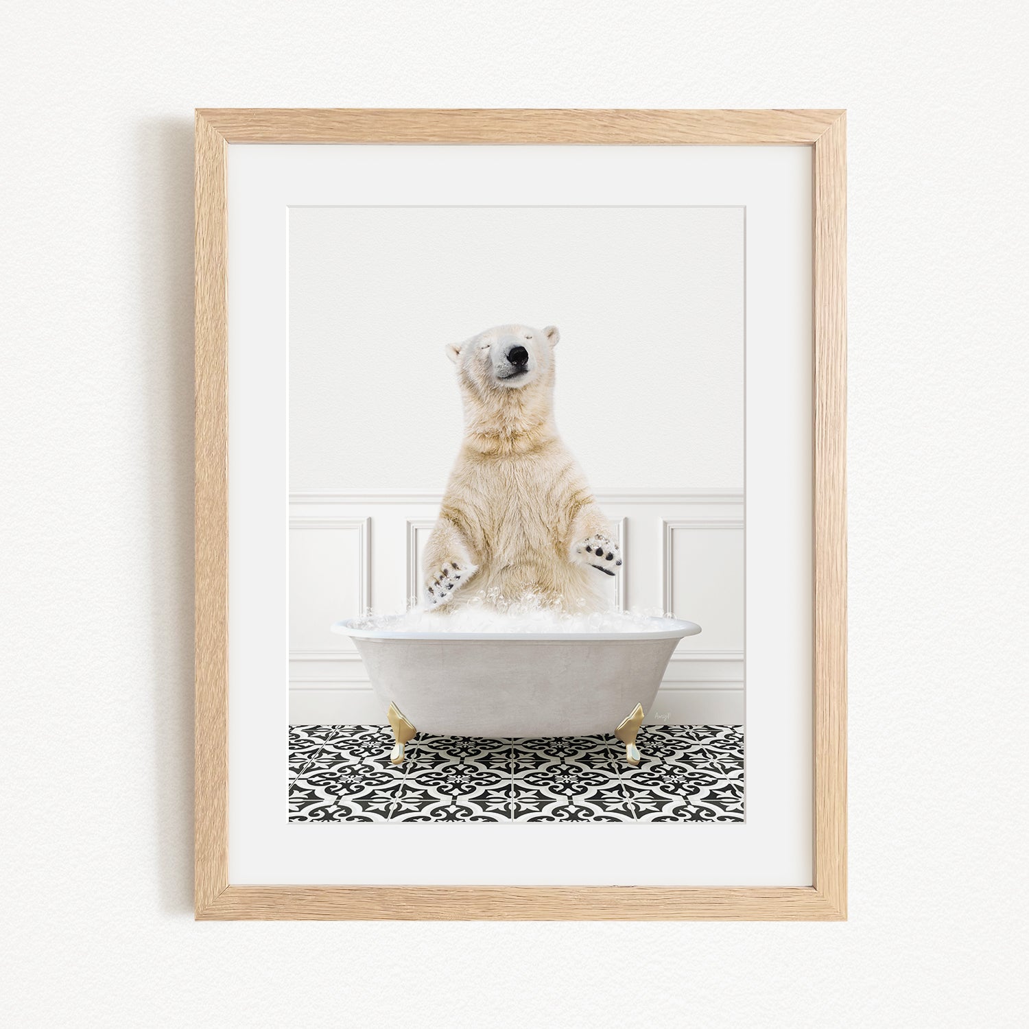 A polar bear standing in a white bathtub filled with bubbles, with a black and white patterned floor beneath it.