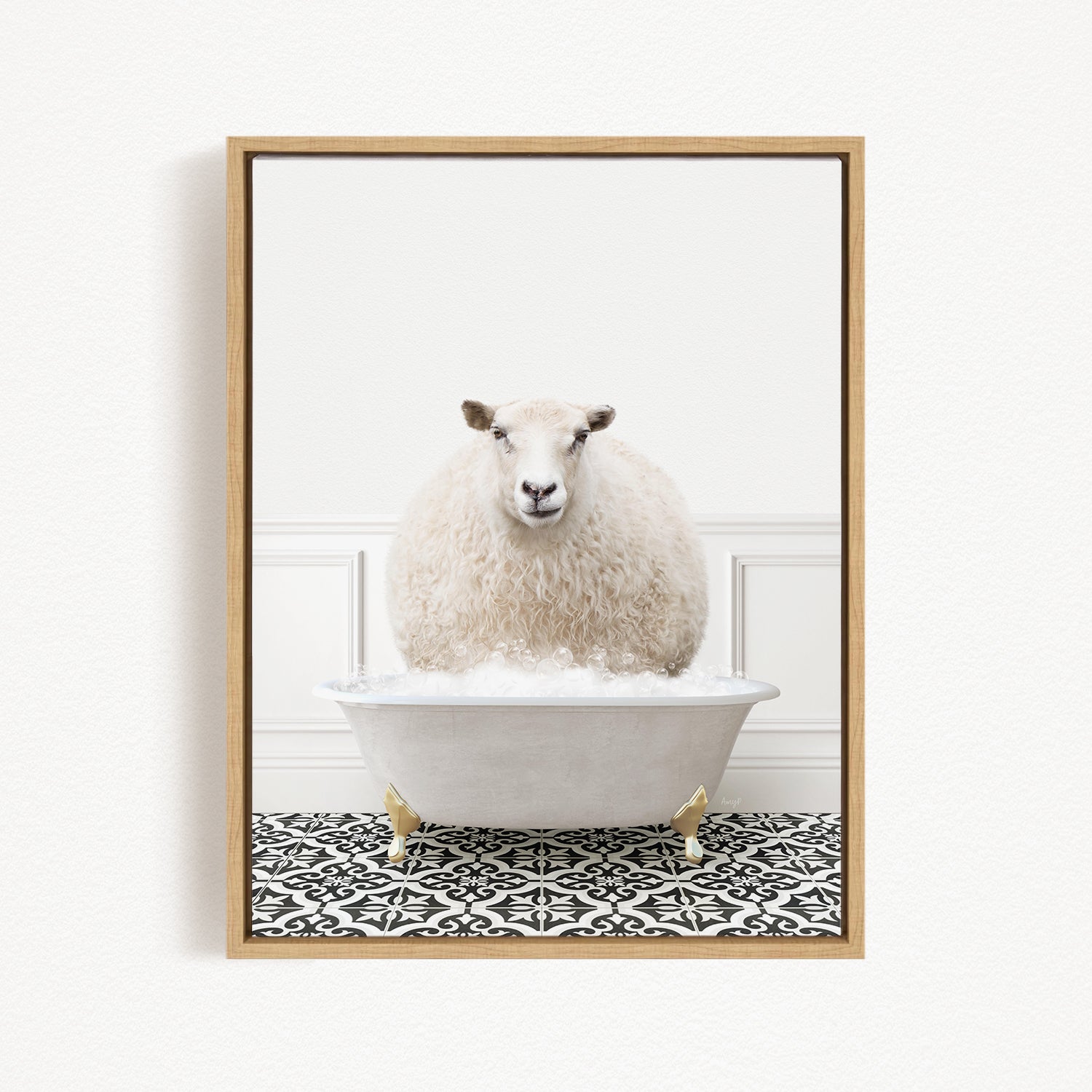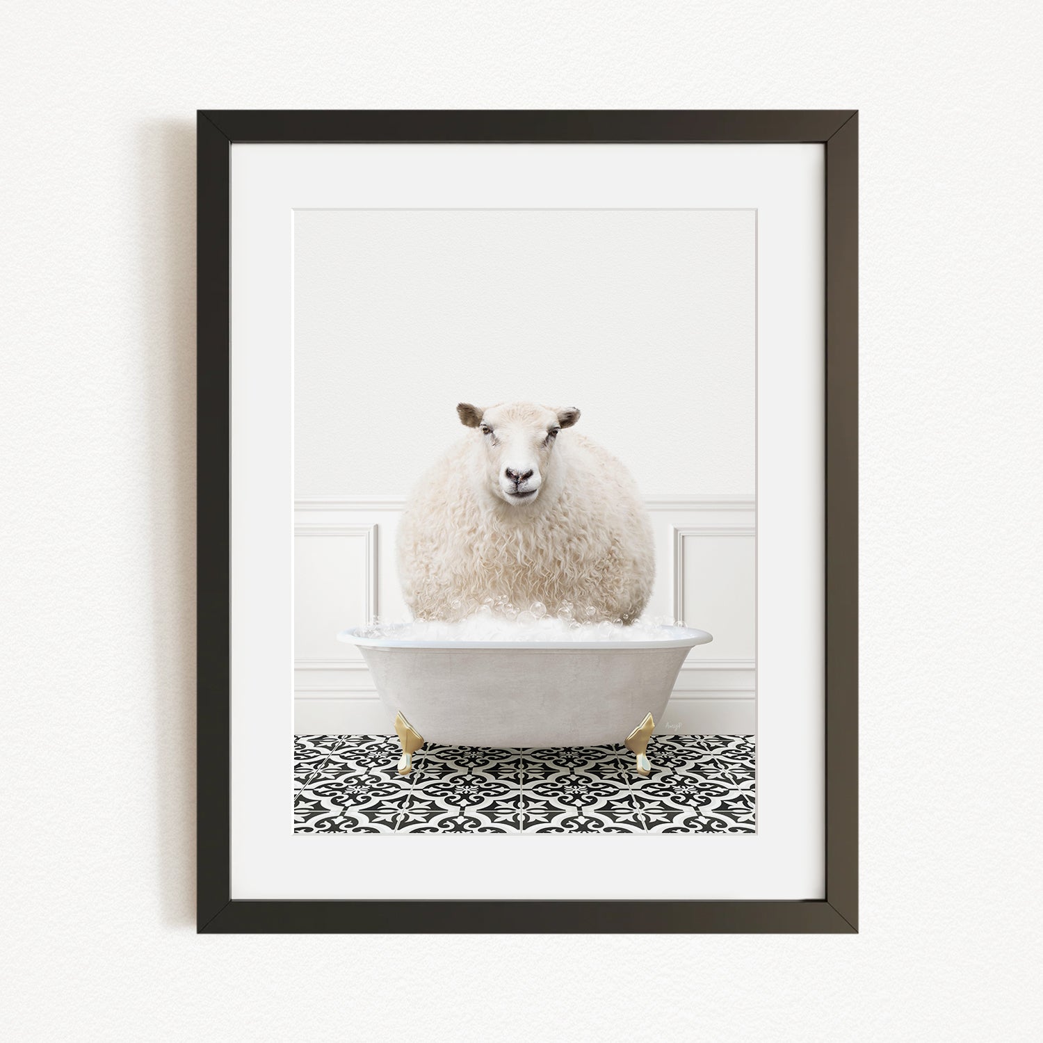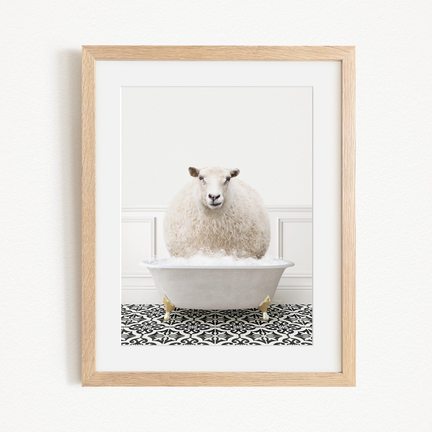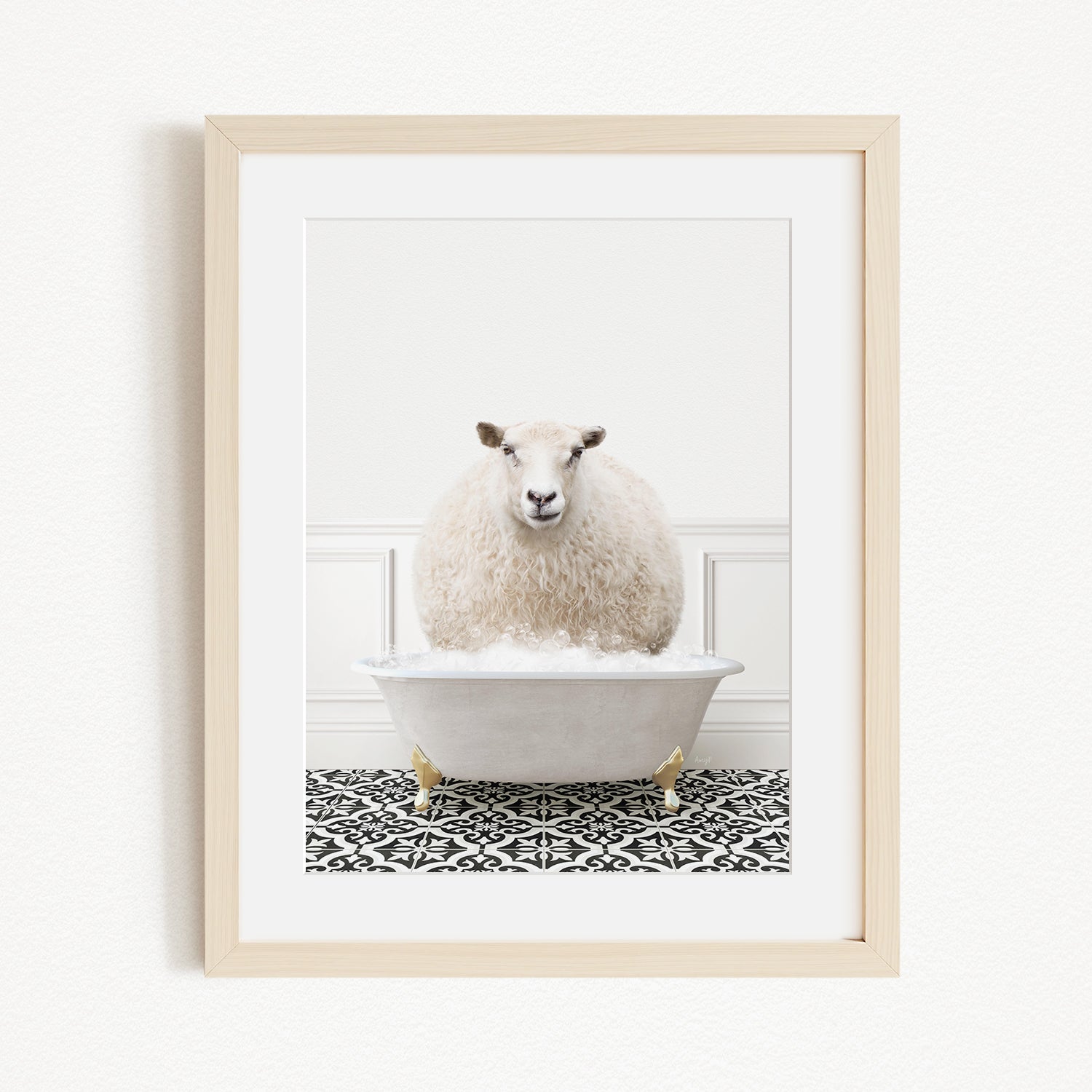 A fluffy white sheep sits in a white bathtub filled with bubbles, surrounded by a black and white patterned floor.