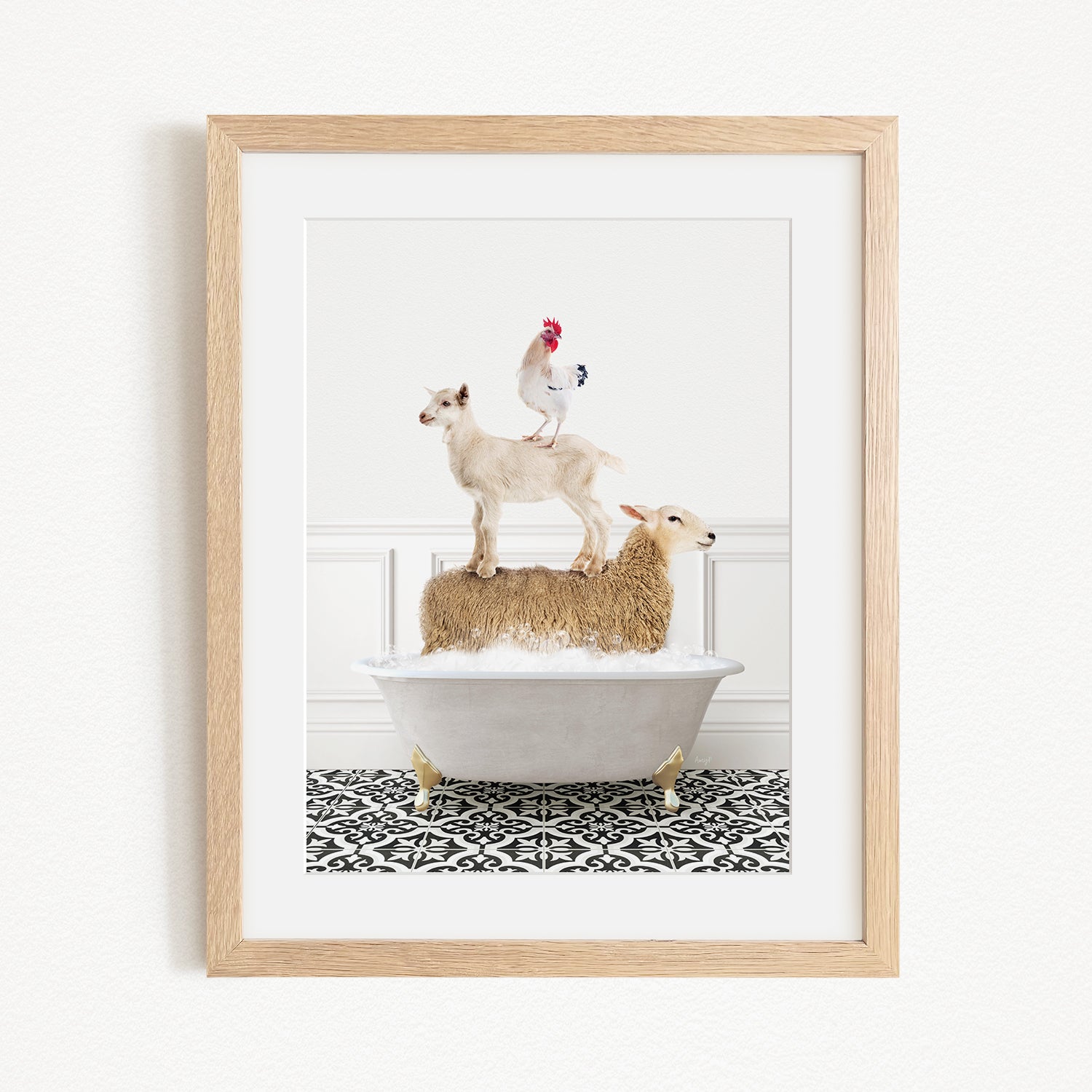 A framed image depicting a goat standing on a sheep's back while a rooster stands on top of the sheep, all in a white bathtub.