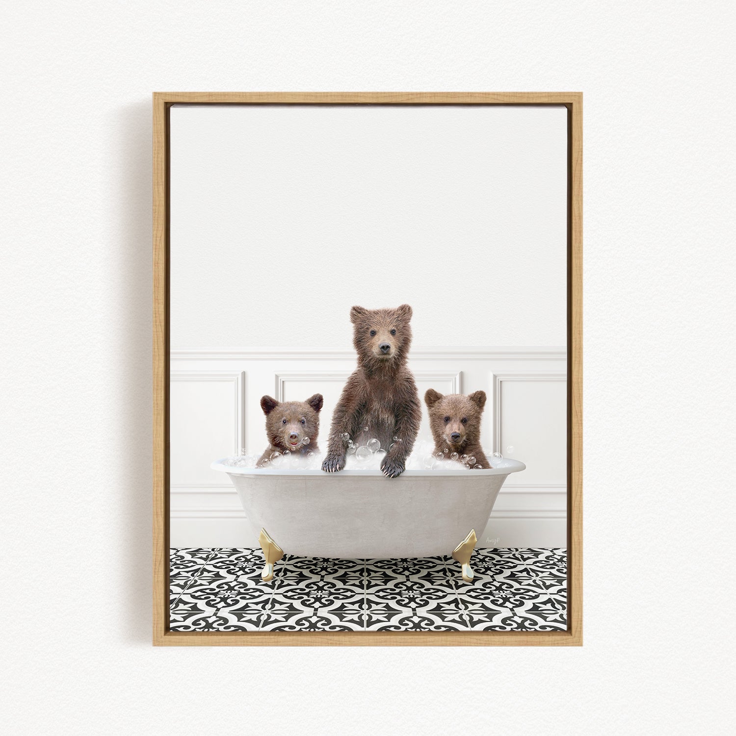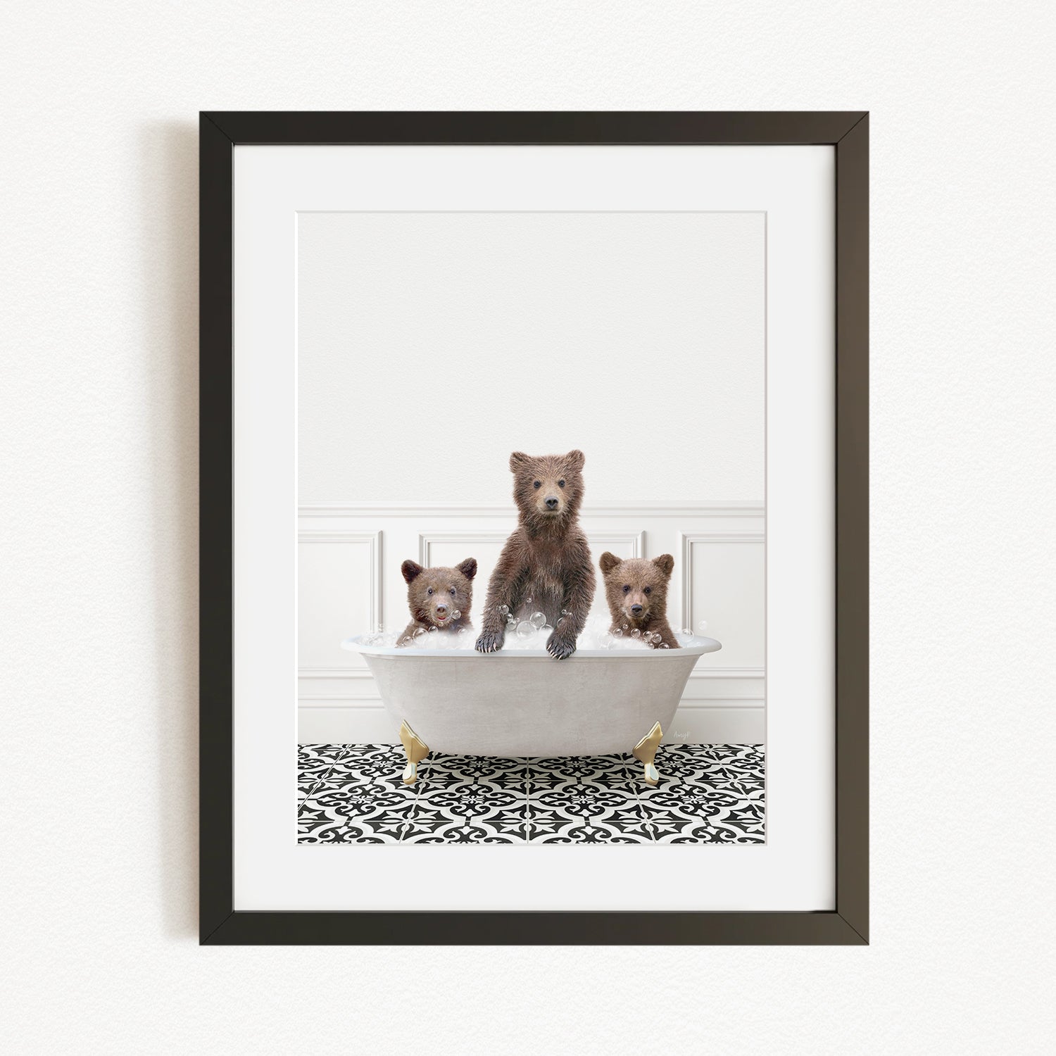 A framed image depicting three brown bears sitting in a white bathtub, with a black and white patterned floor beneath them.