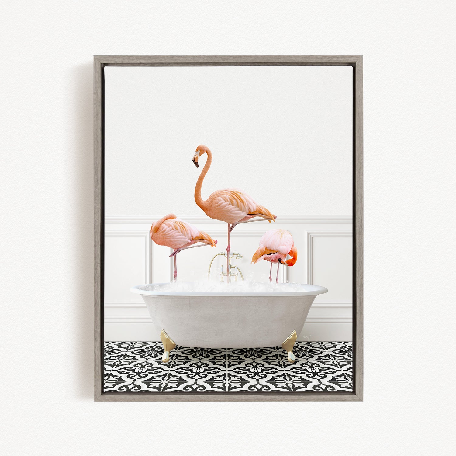 A framed image depicting three flamingos standing in a white bathtub filled with water, set against a white wall and black and white patterned floor.