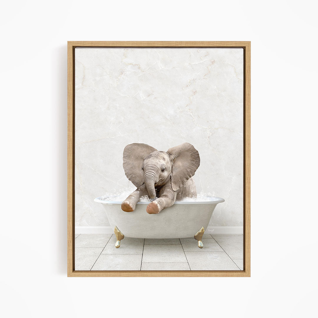 A hand holds up a framed image of a baby elephant sitting in a bathtub filled with water, with its large ears spread out.