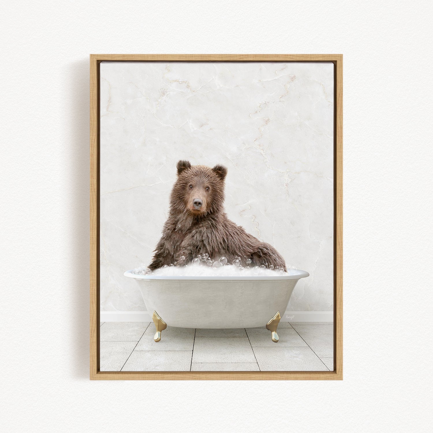A brown bear sitting in a white bathtub filled with bubbles, looking directly at the camera.