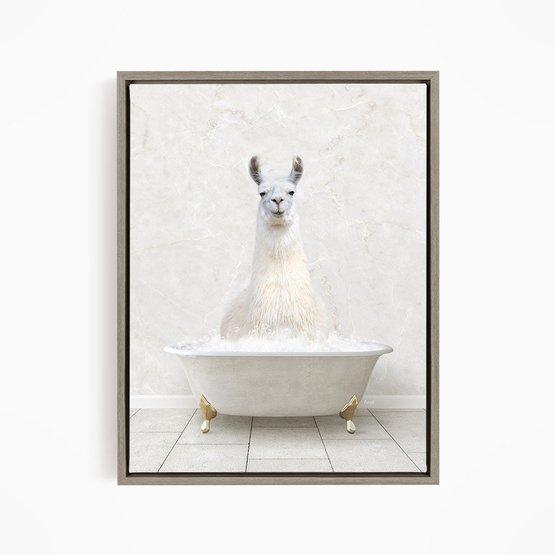 A white llama sitting in a white bathtub filled with bubbles, with a blurred background suggesting a bathroom setting.
