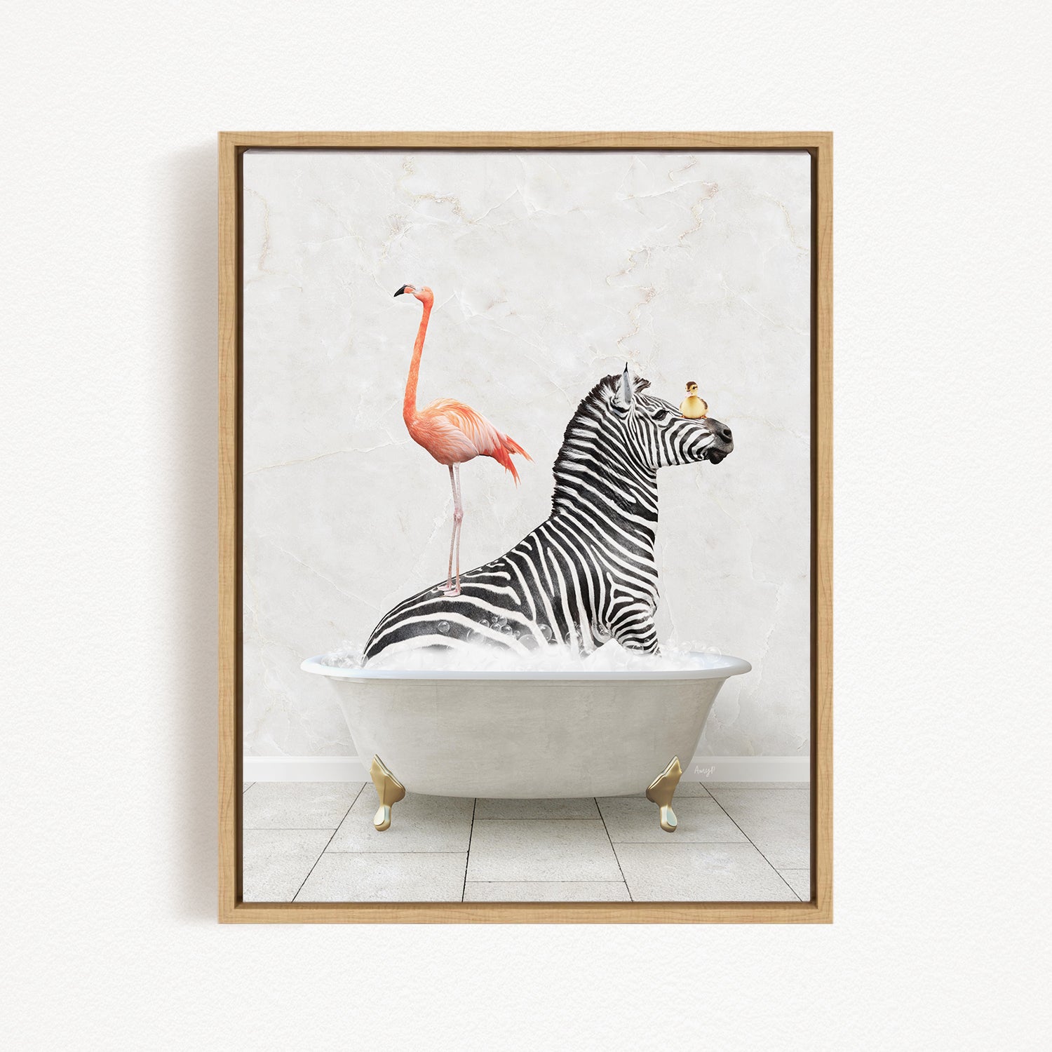 A framed image depicting a zebra sitting in a bathtub, with a flamingo standing on its back and a bird perched on its head.