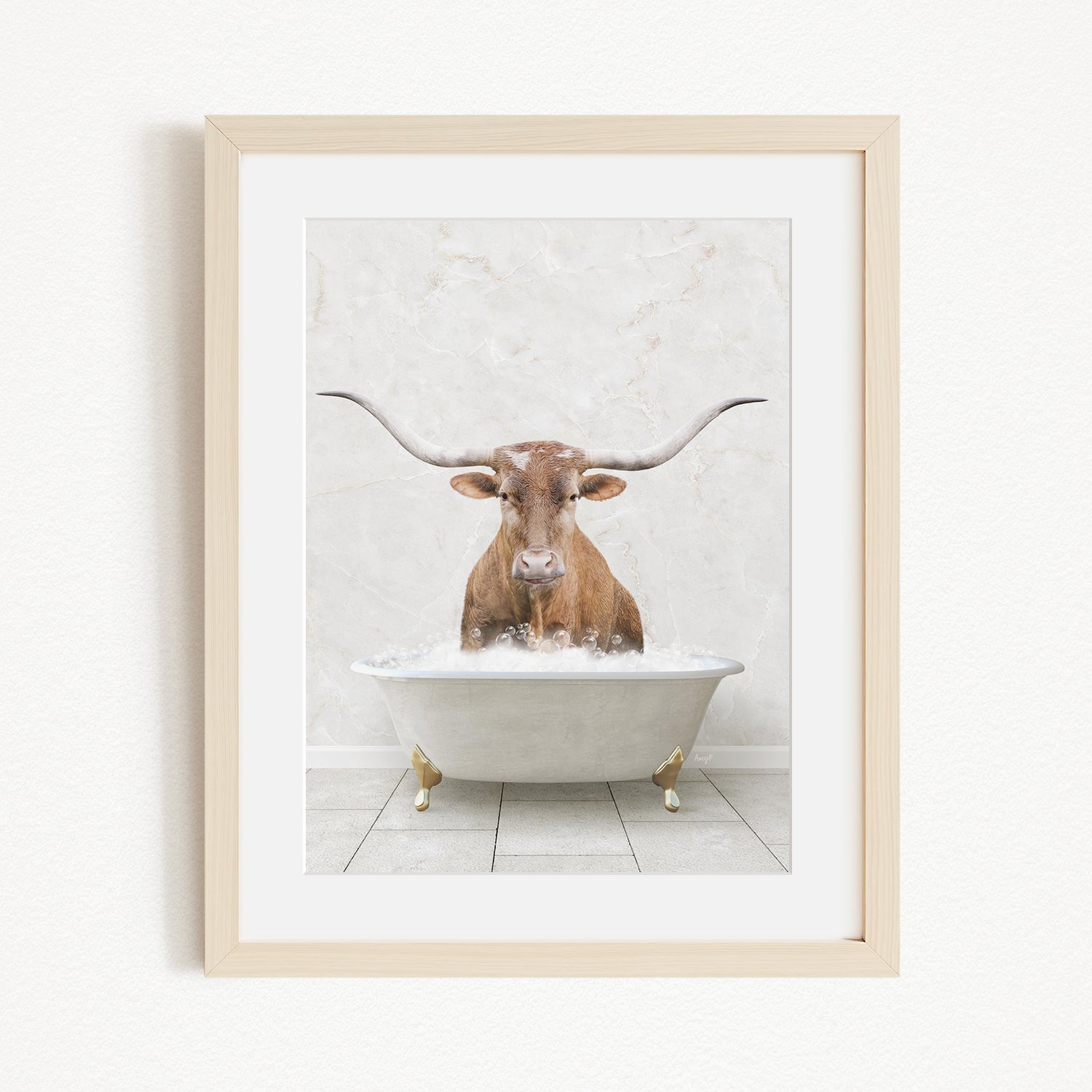 A framed image depicting a bull with long horns sitting in a bathtub filled with water.