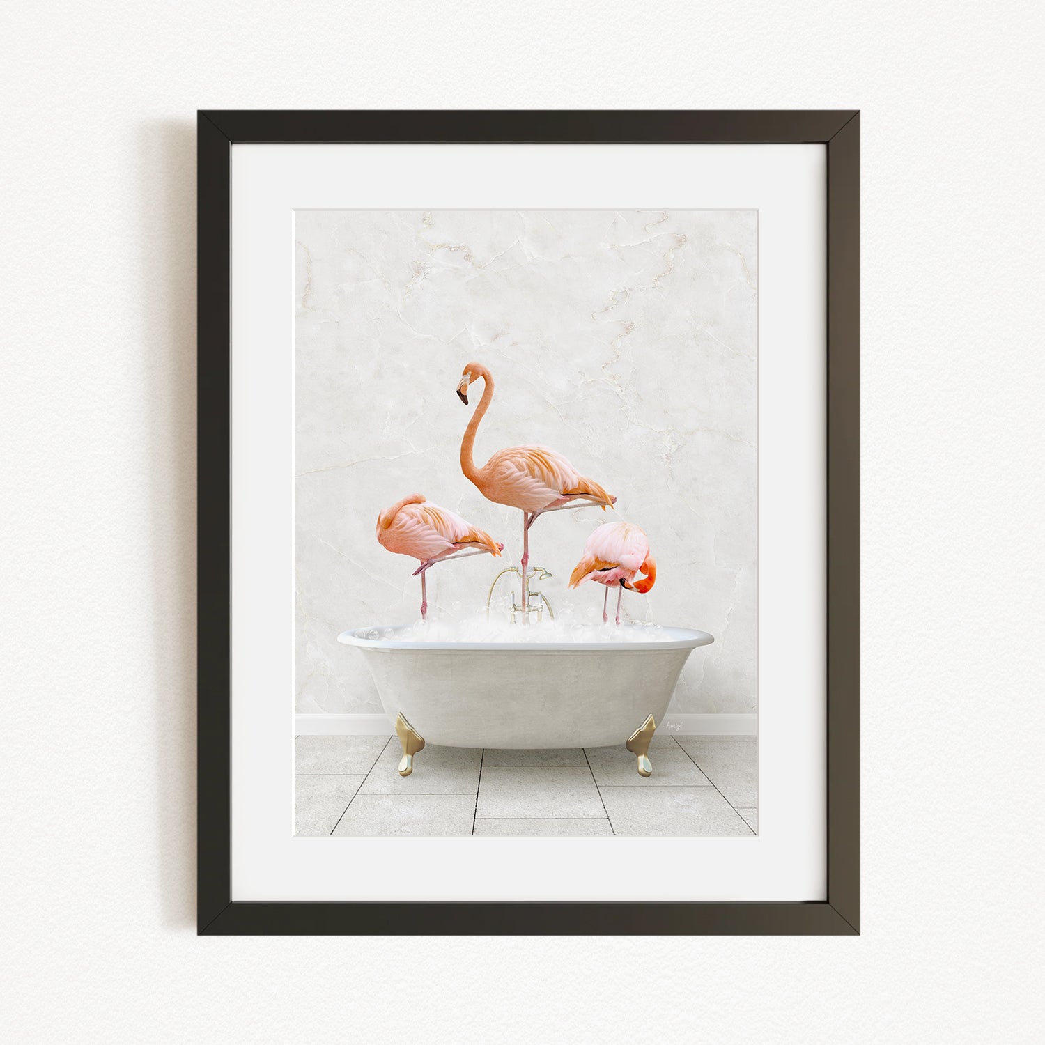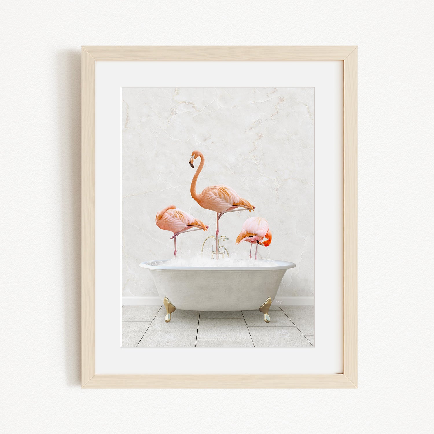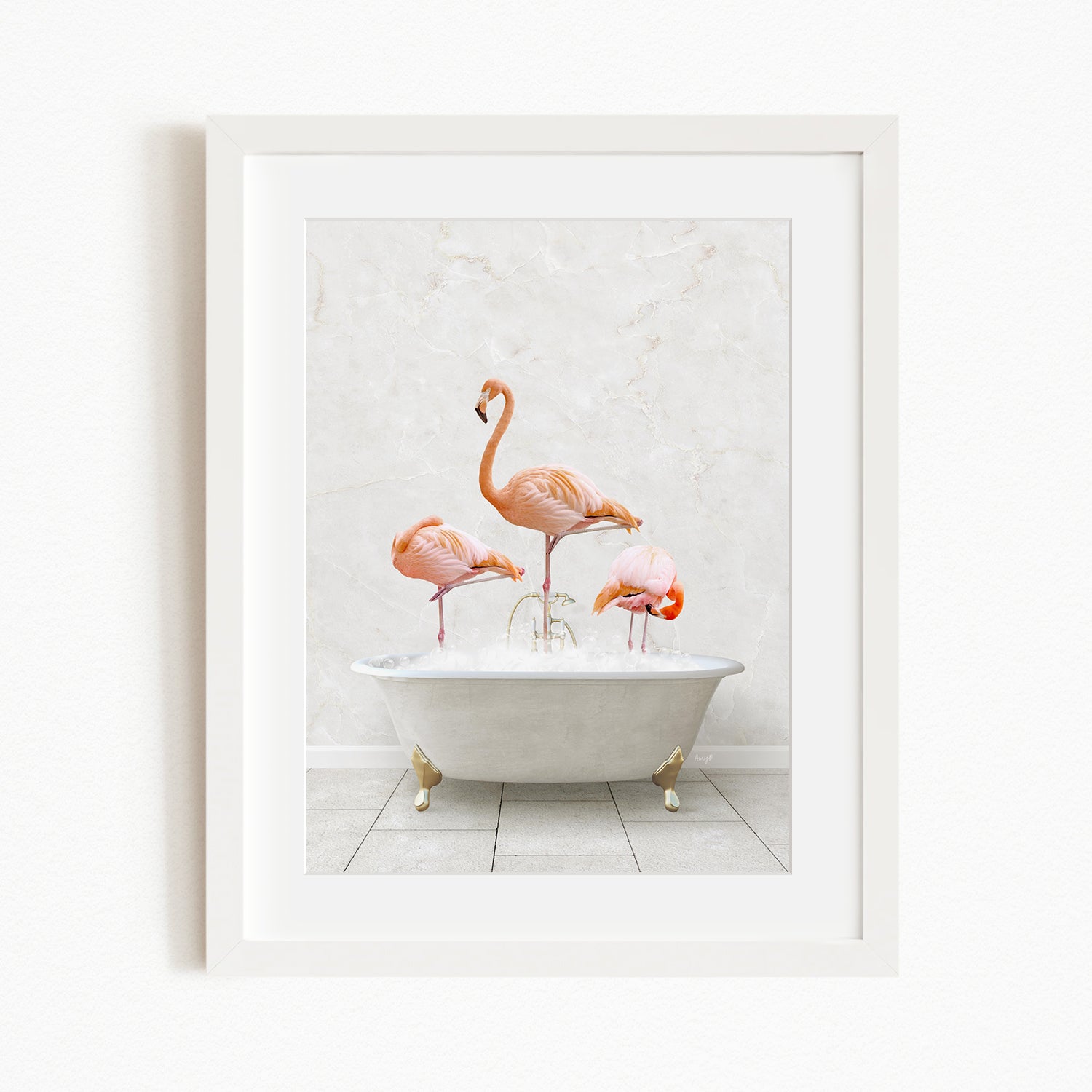 A framed image depicting three flamingos standing in a white bathtub, with one flamingo standing on the edge of the tub and the other two standing inside the tub.