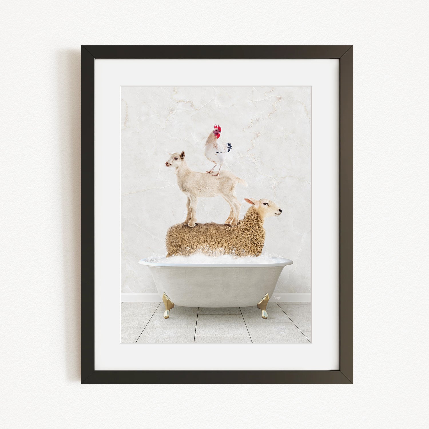 A framed image depicting a sheep standing on a goat's back while a rooster stands on top of a sheep in a bathtub.