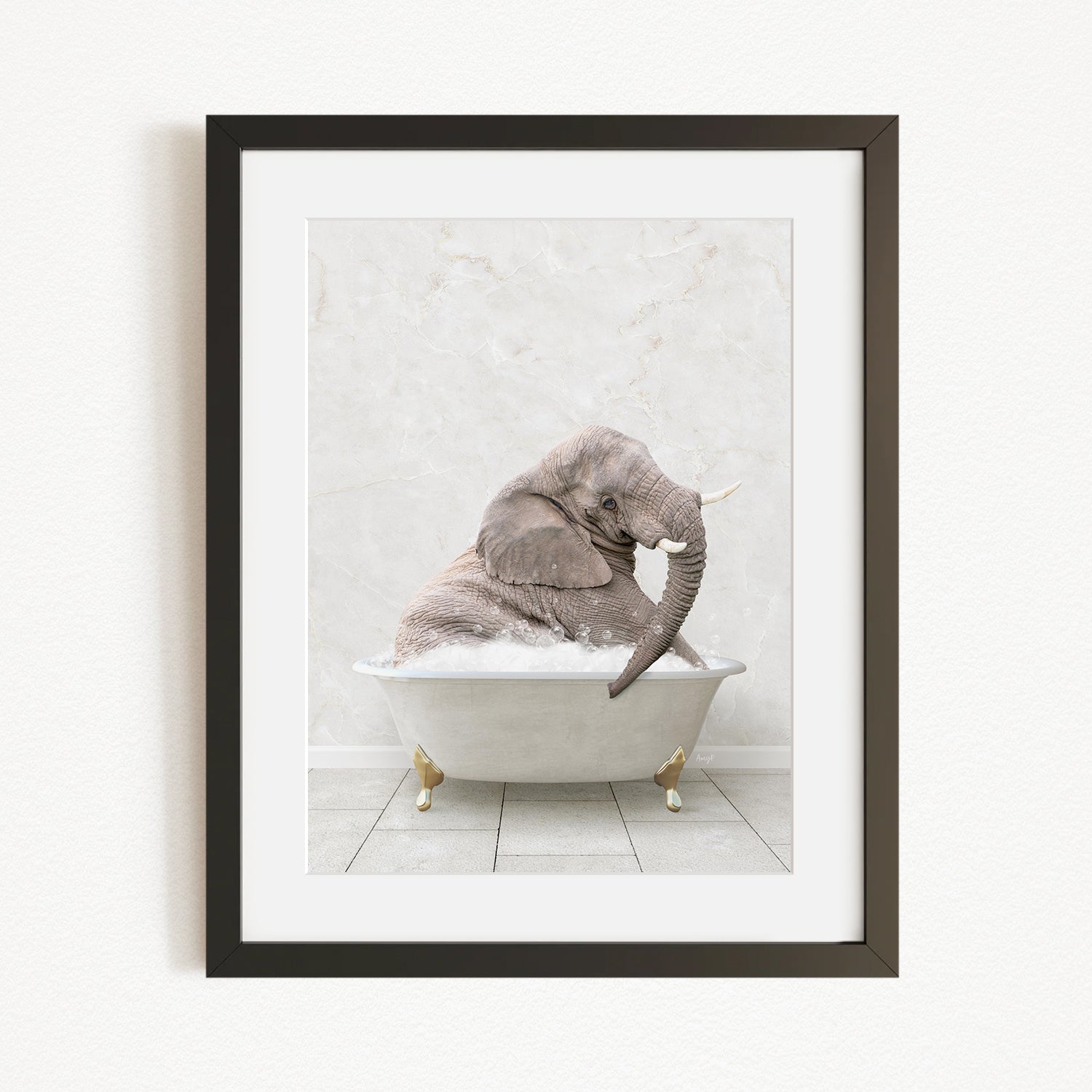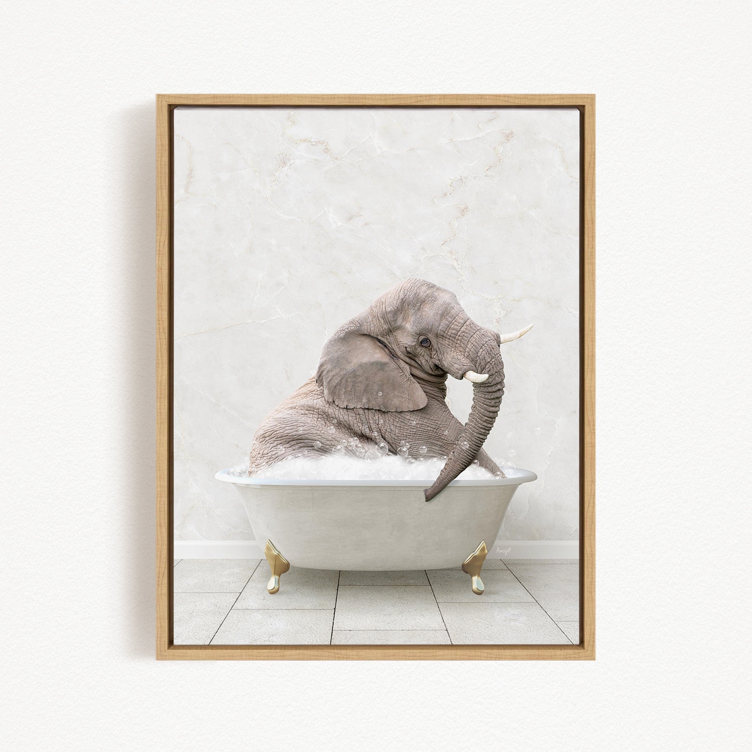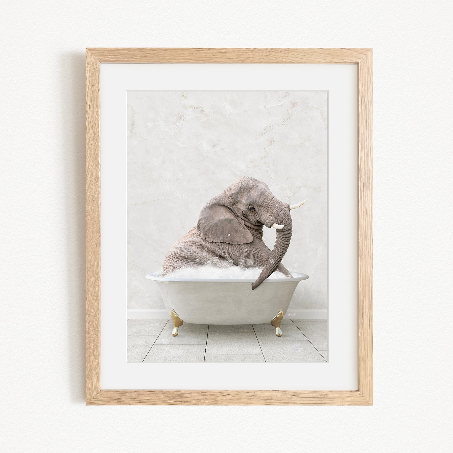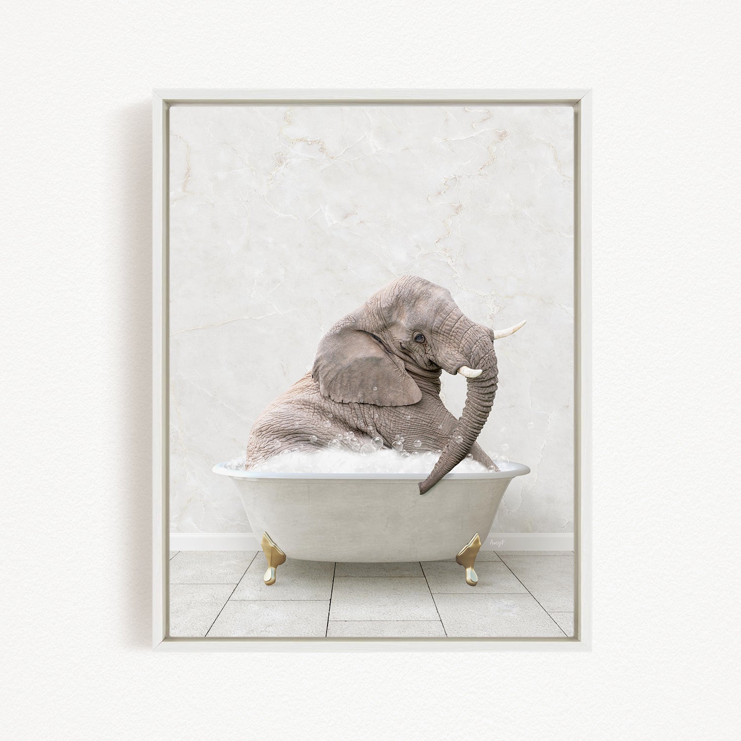 A gray elephant is sitting in a white bathtub, with its trunk raised and appearing to be enjoying the bath.