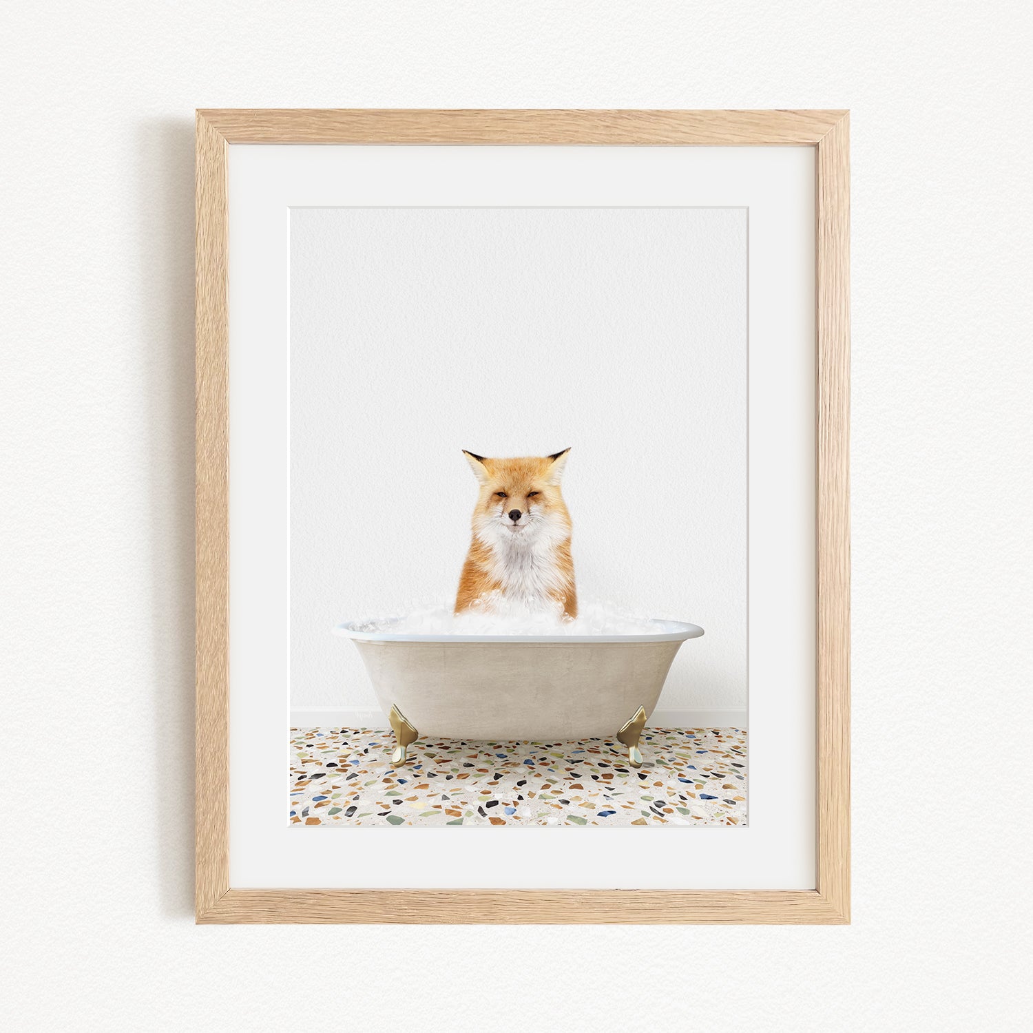 A red fox sitting in a white bathtub filled with bubbles, looking directly at the camera.