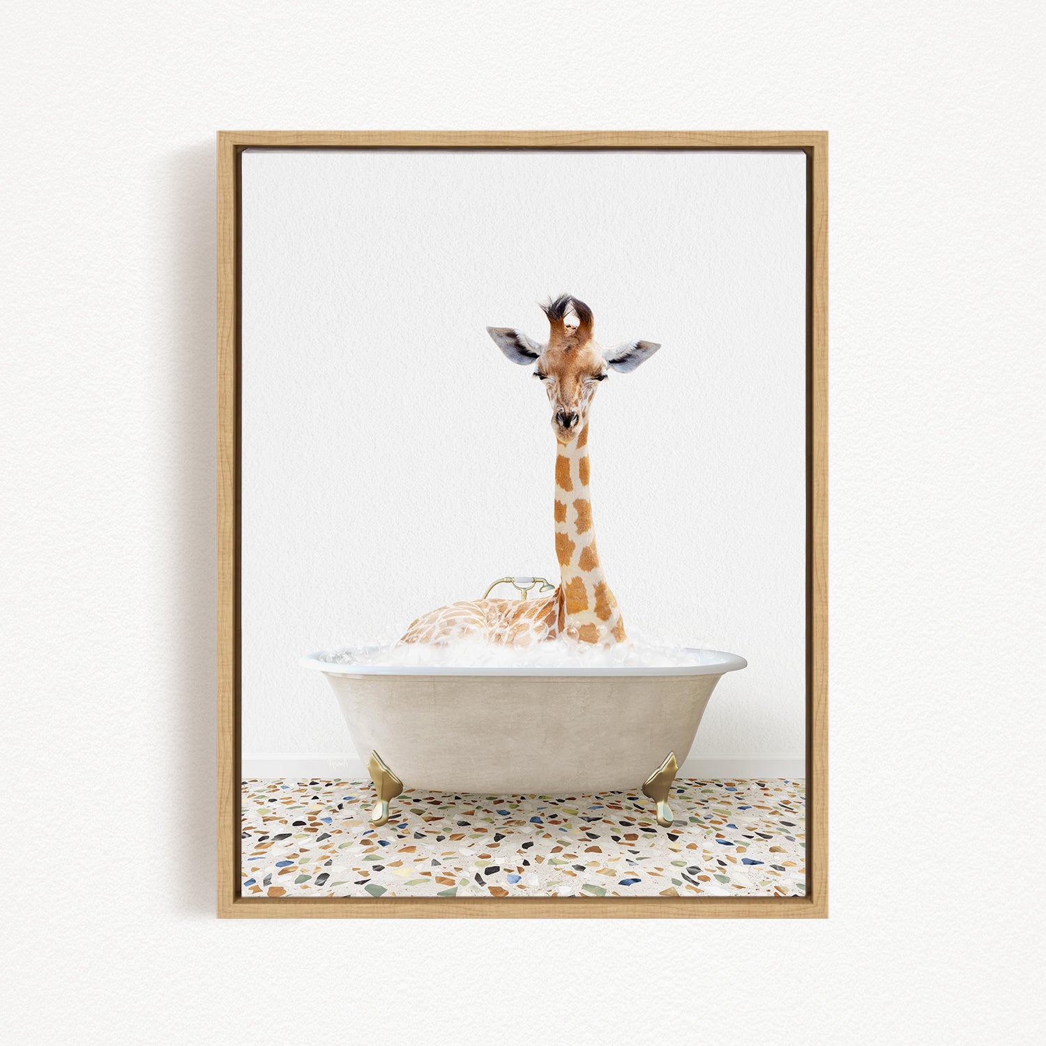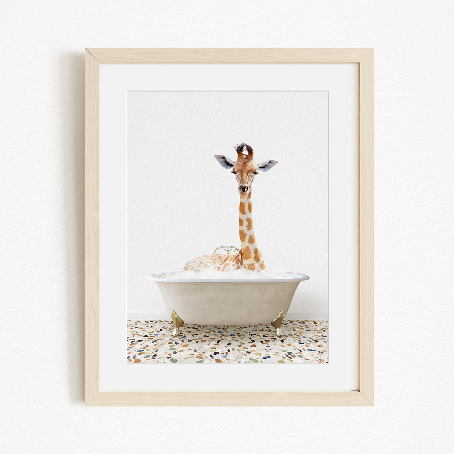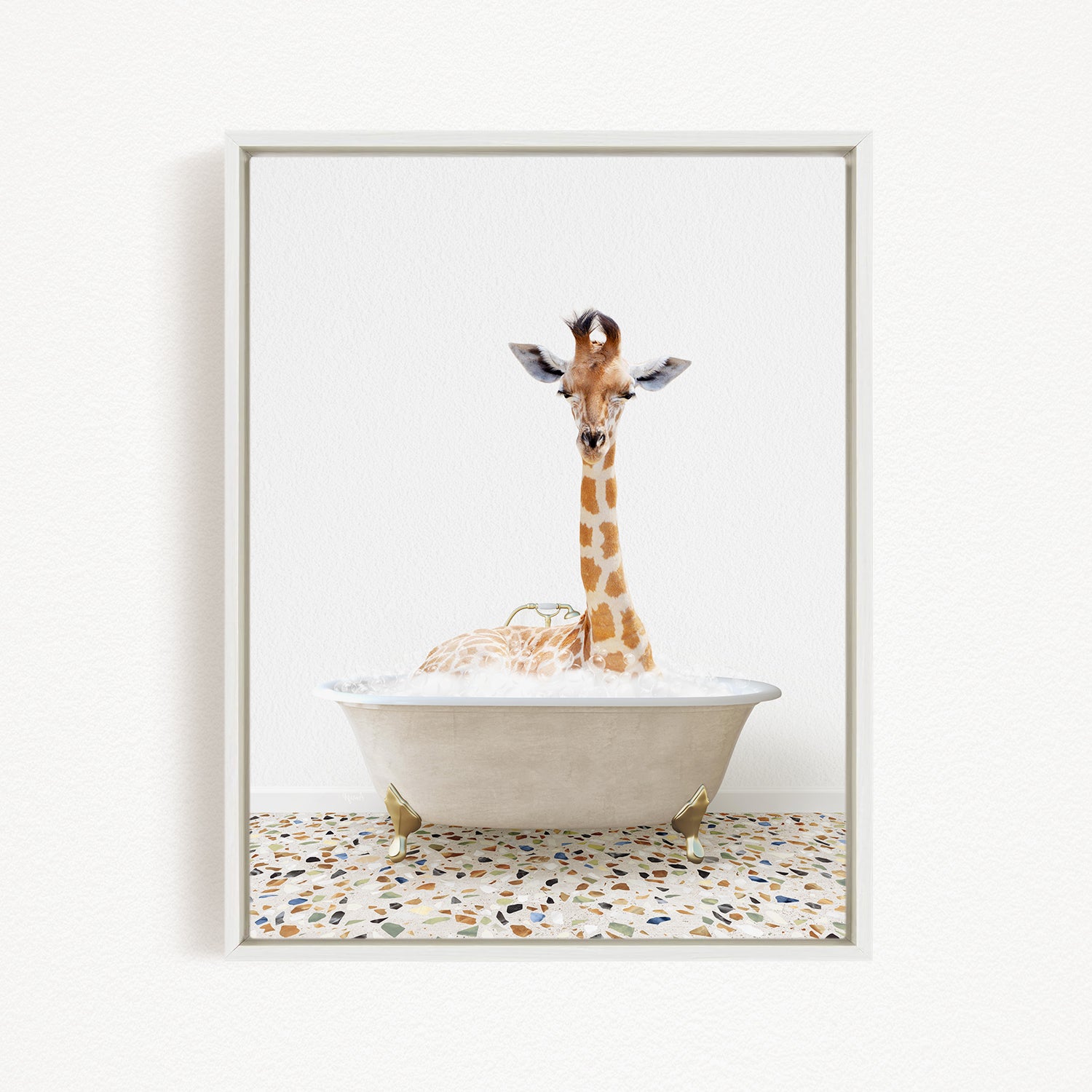 A giraffe is sitting in a white bathtub filled with water, creating a whimsical and playful scene.