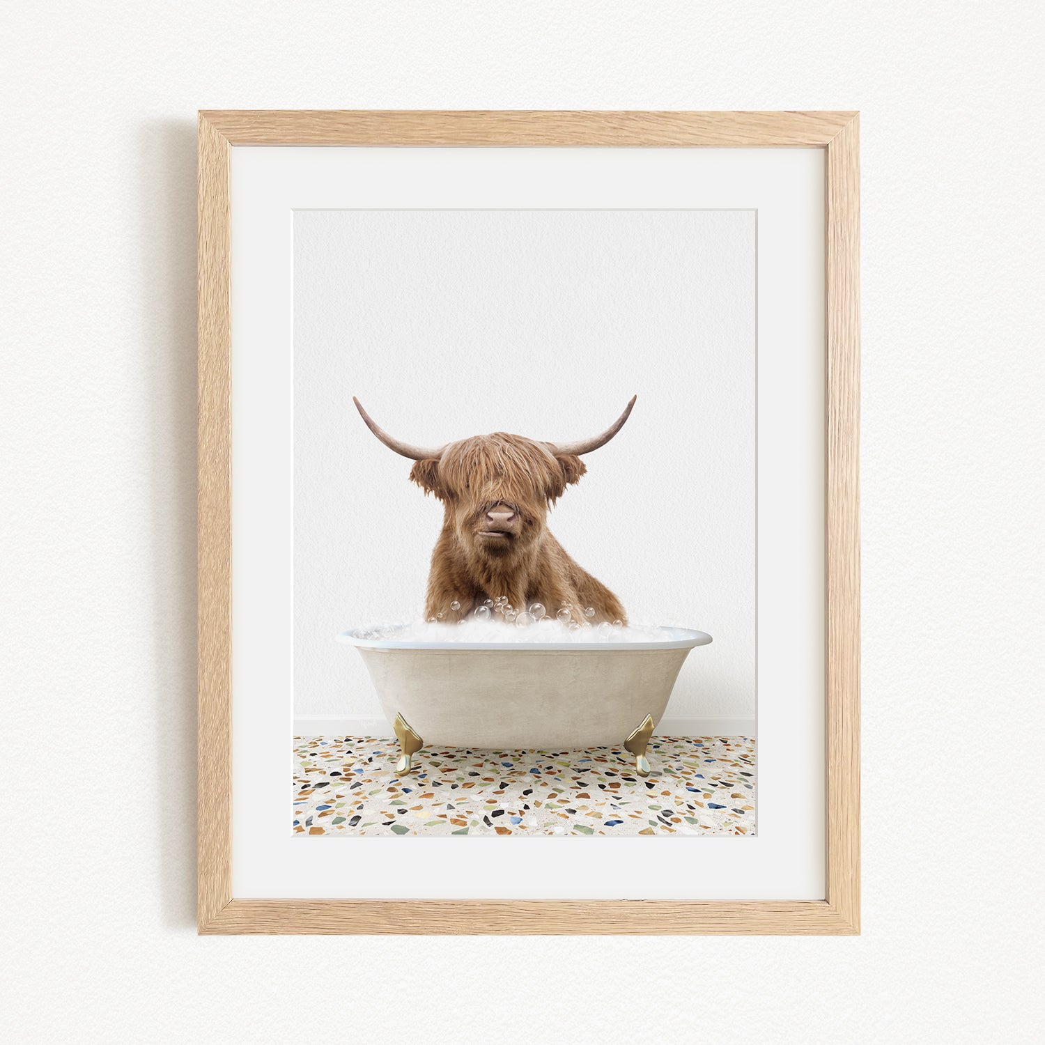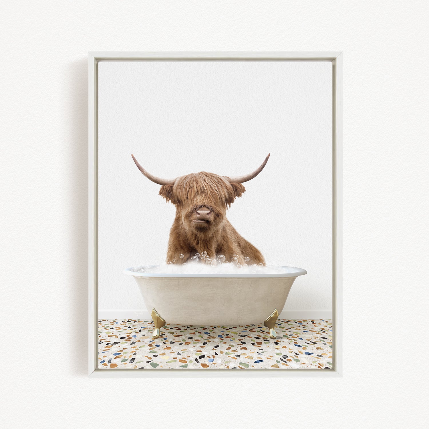 A brown Highland cow with large horns is sitting in a white bathtub filled with water, creating a whimsical and playful scene.