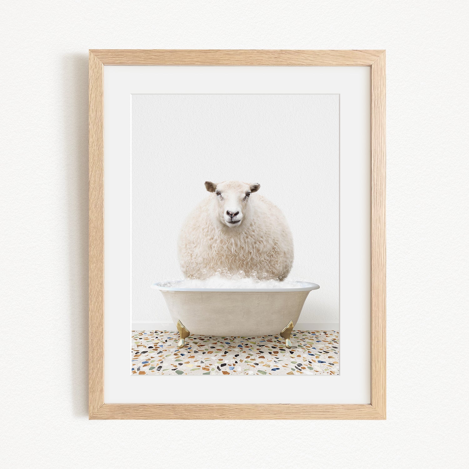 A fluffy white sheep sits in a white bathtub filled with bubbles, creating a whimsical and playful scene.