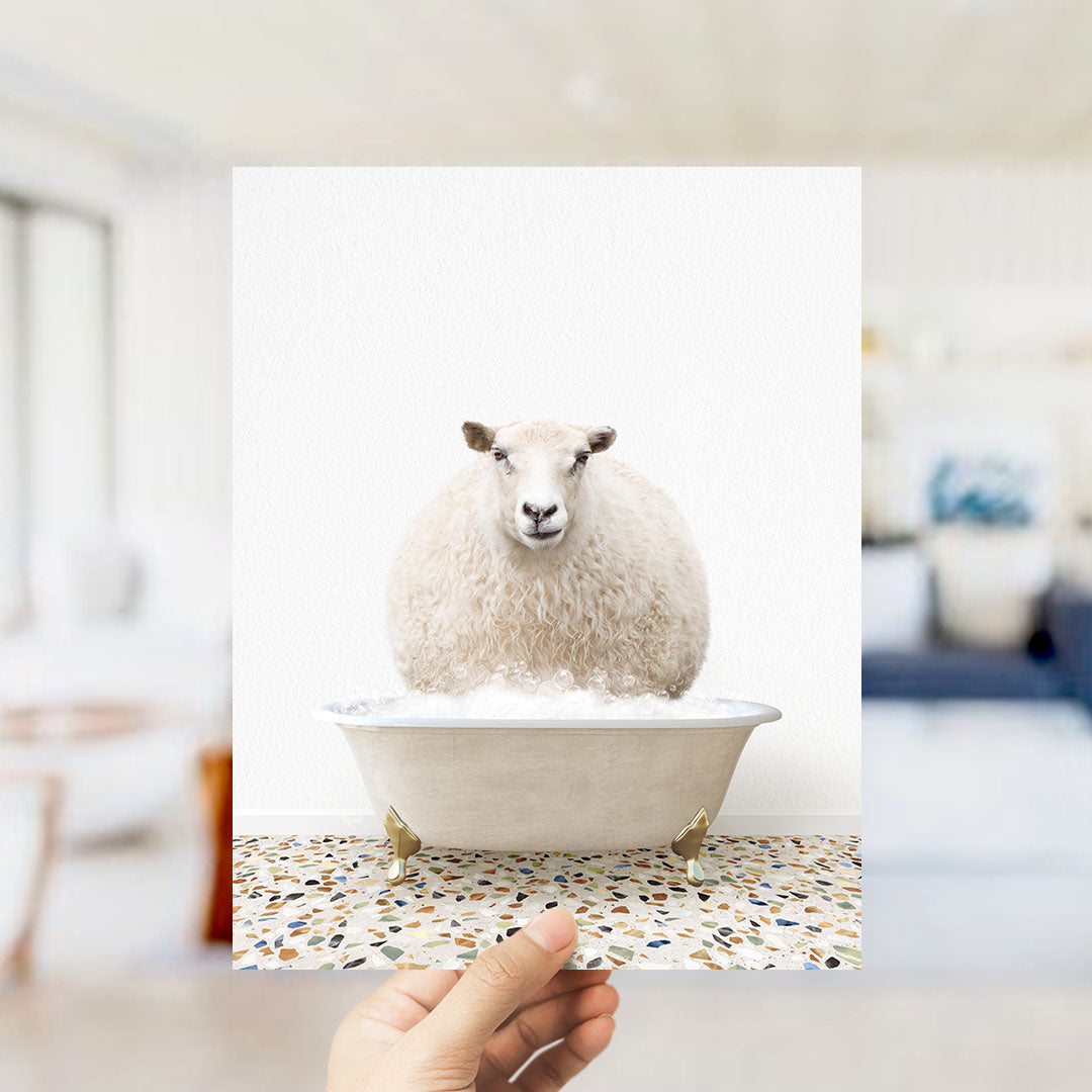 A fluffy white sheep sitting in a white bathtub filled with bubbles, with a hand holding the image up to the camera.