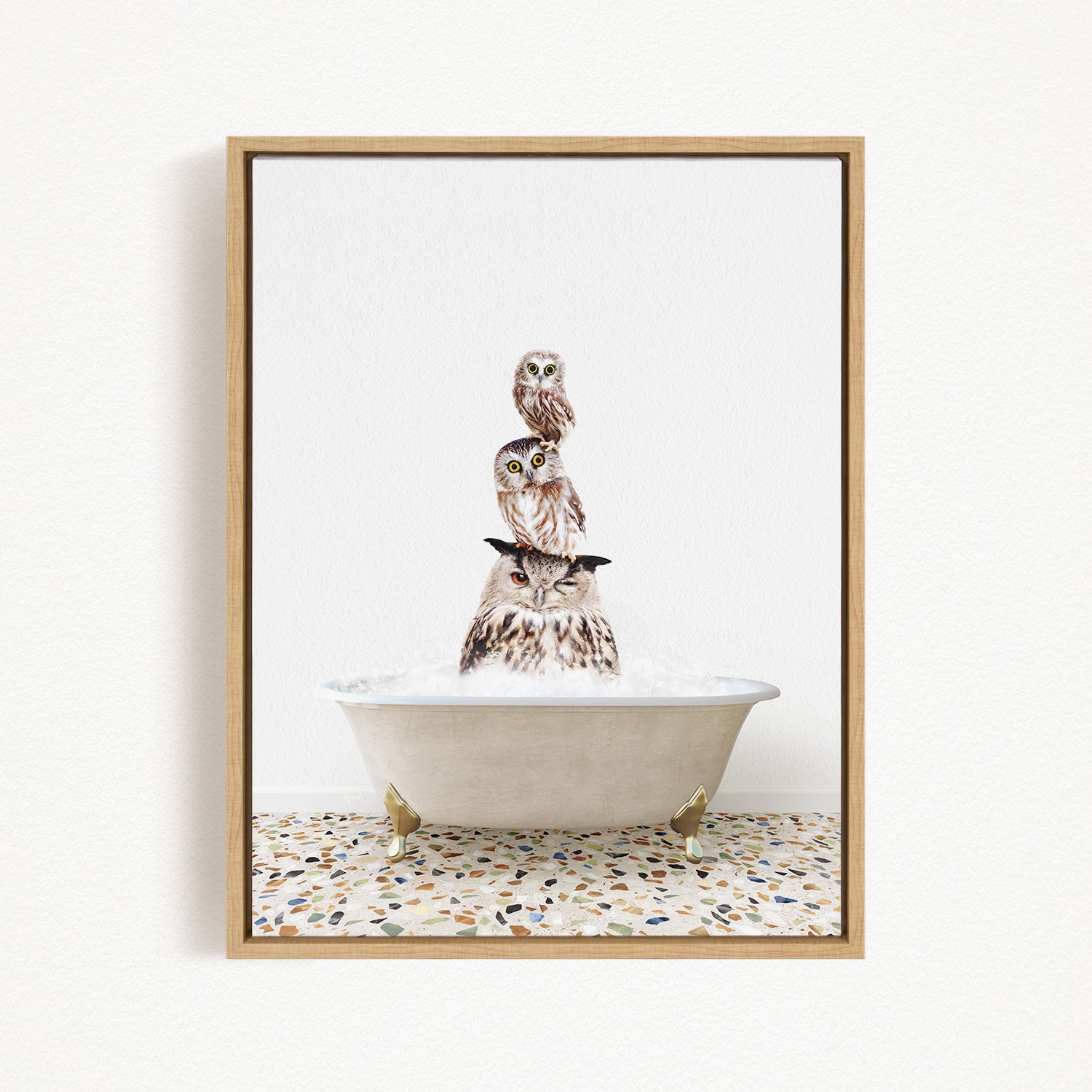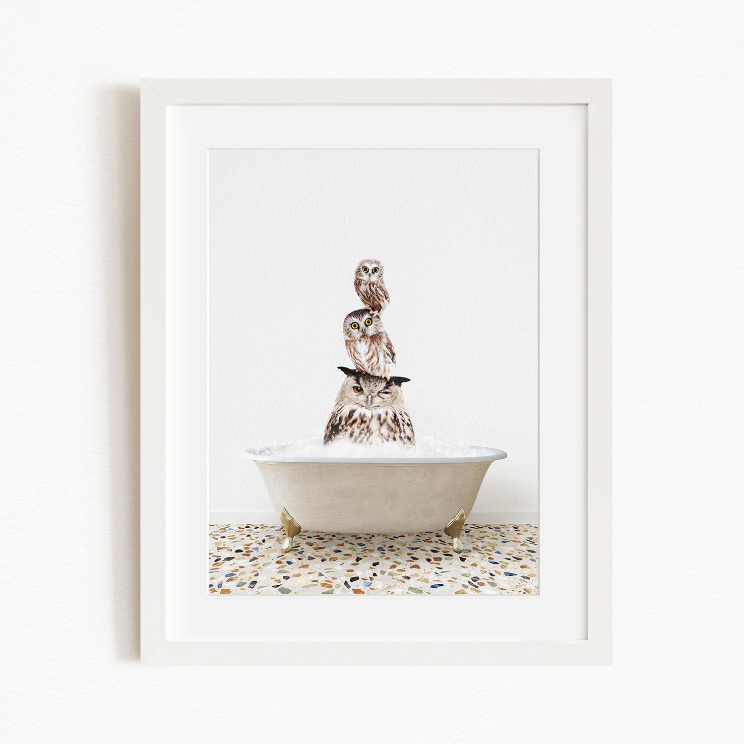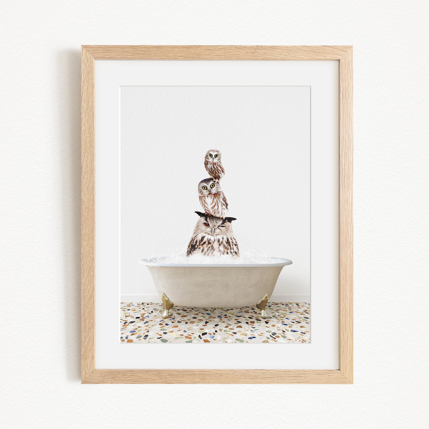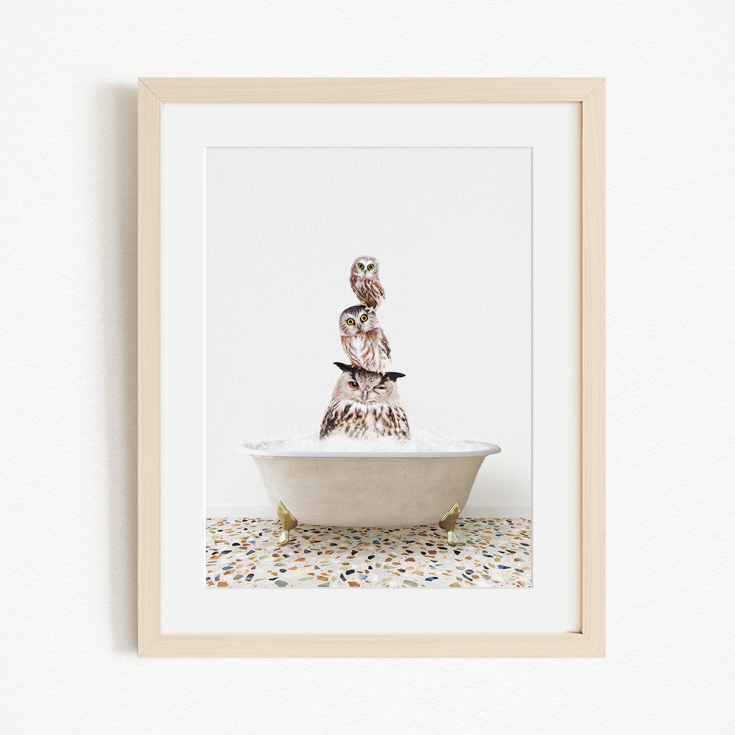 A framed image depicting three owls sitting in a bathtub, with the largest owl sitting at the bottom and the two smaller ones perched on top.