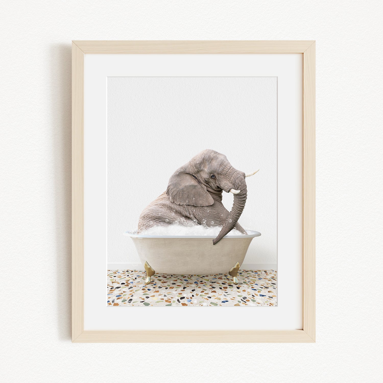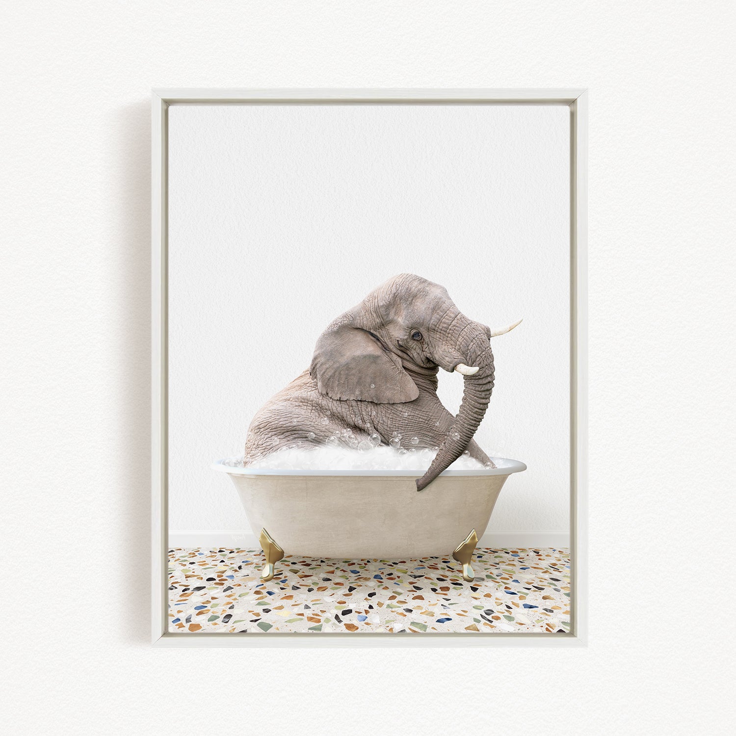 A gray elephant sitting in a white bathtub filled with water, with its trunk raised and appearing to be enjoying the bath.
