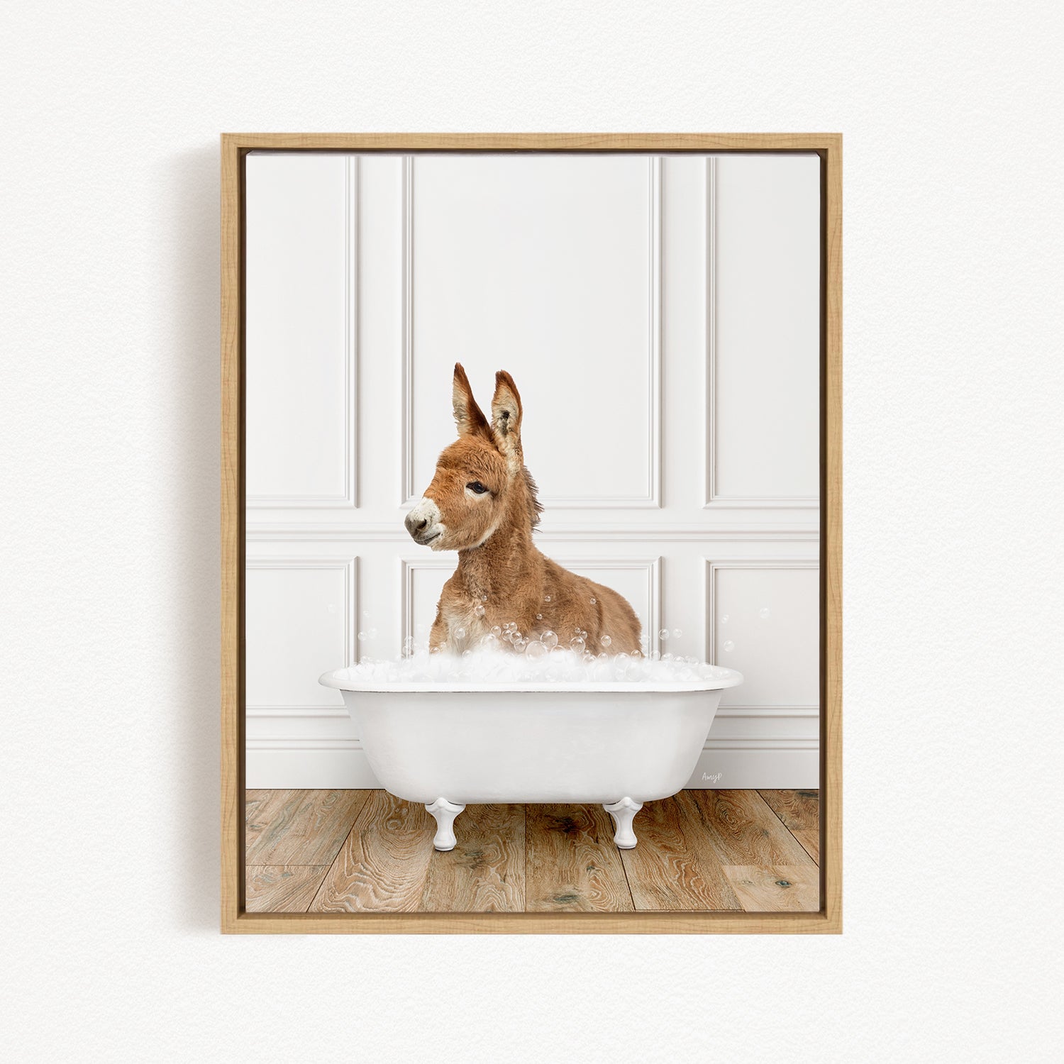 A donkey is sitting in a white bathtub filled with water, creating a playful and whimsical scene.