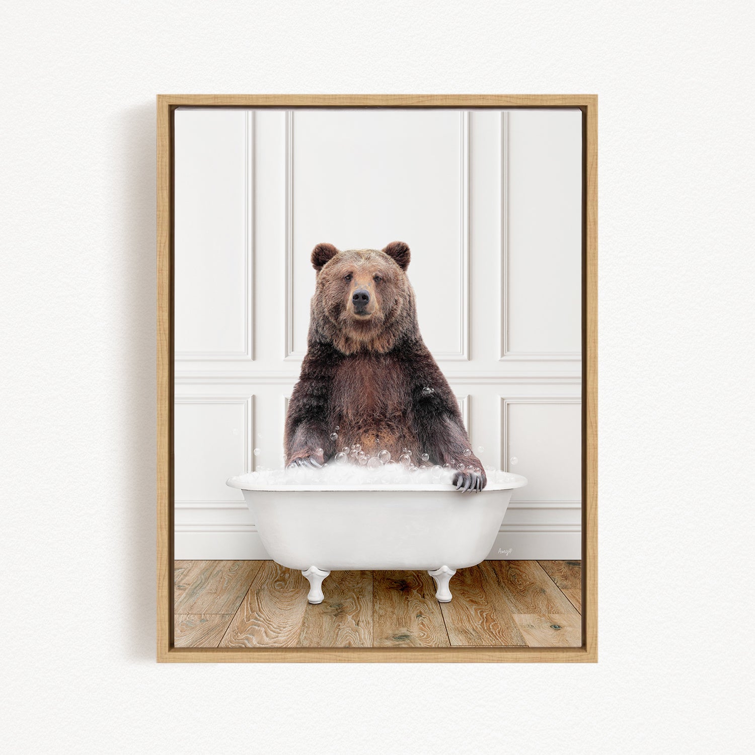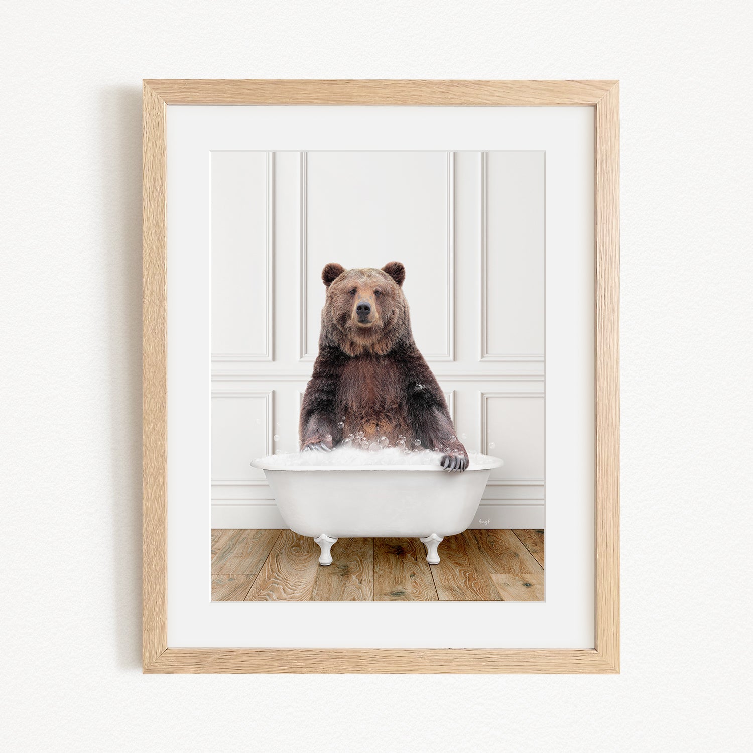 A brown bear sitting in a white bathtub filled with bubbles, looking directly at the camera.
