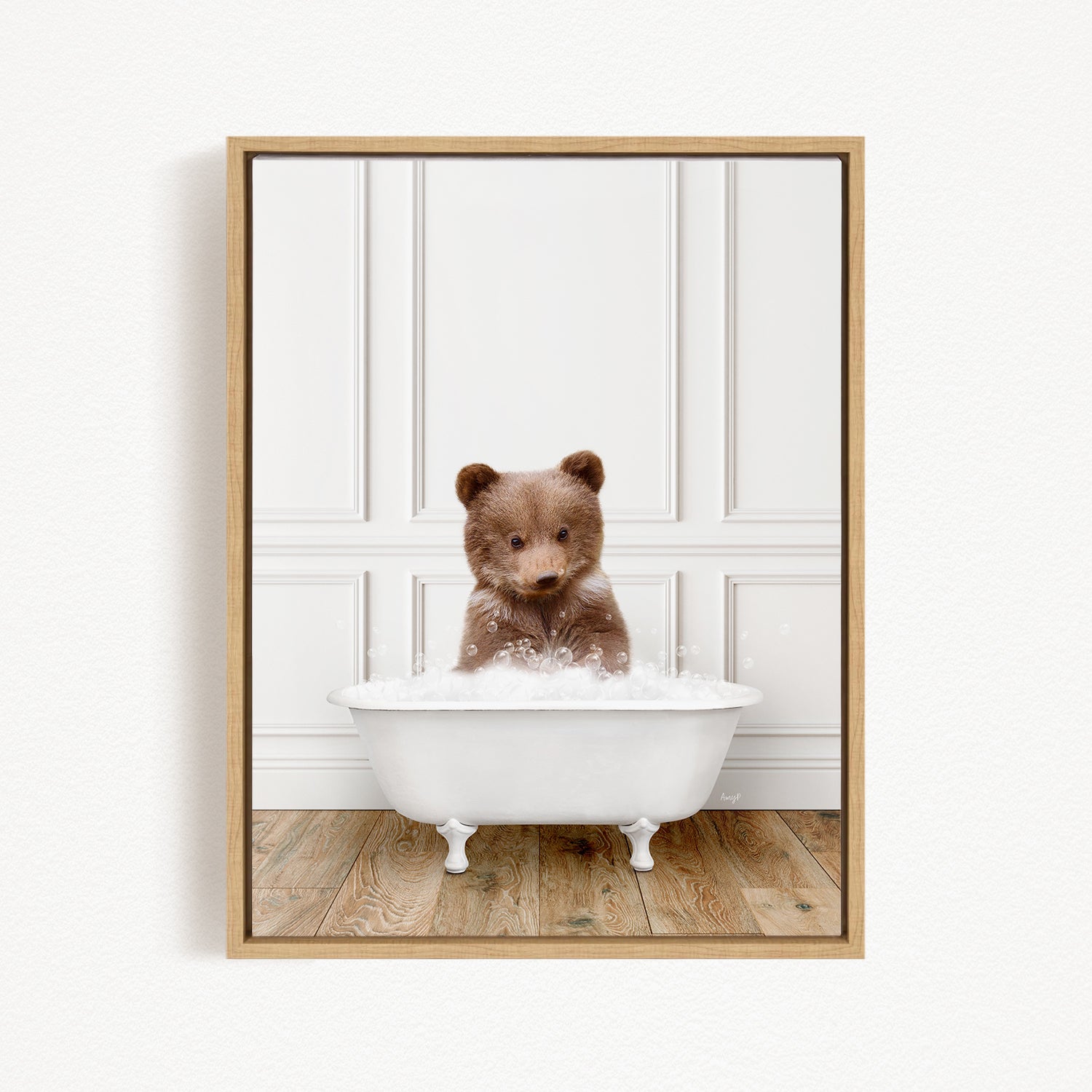 A cute brown bear sitting in a white bathtub filled with bubbles, creating a playful and whimsical scene.