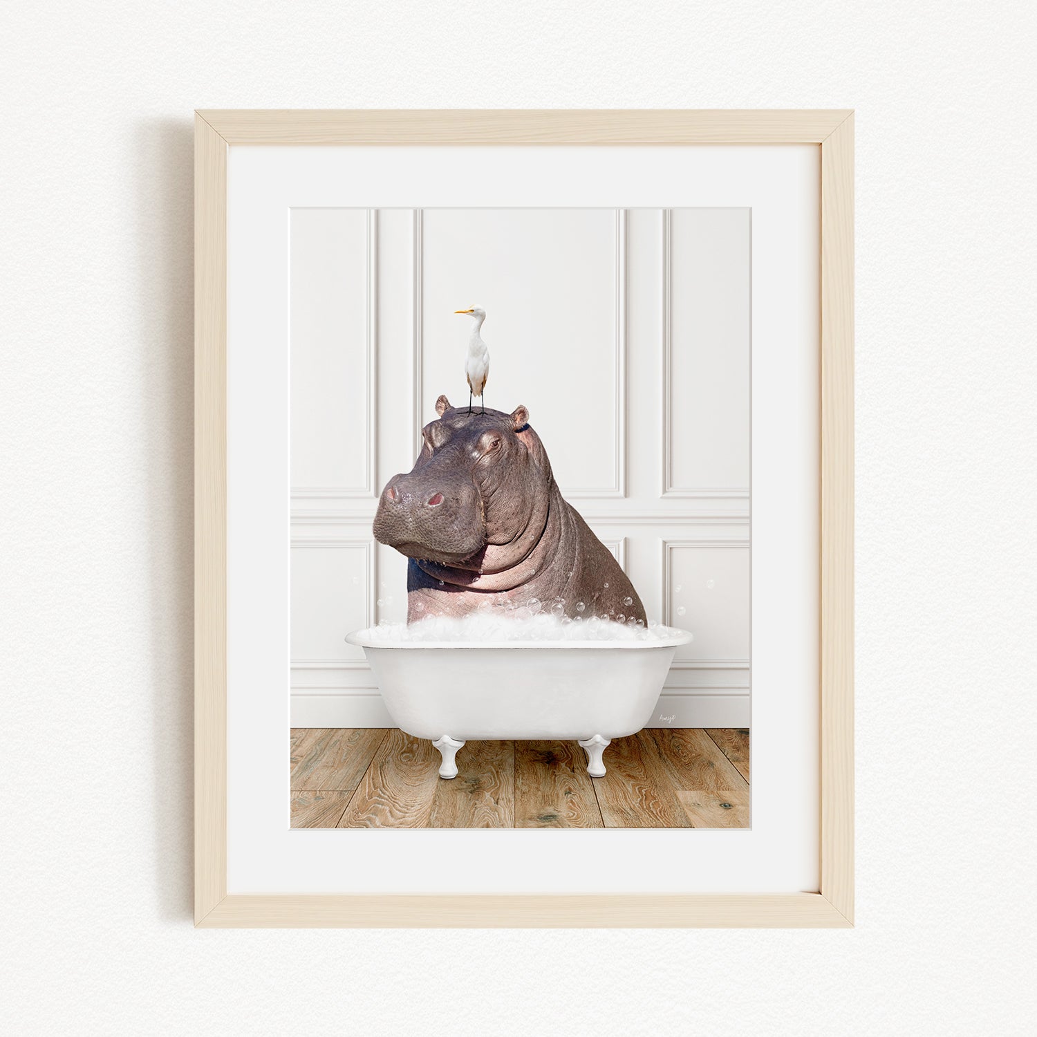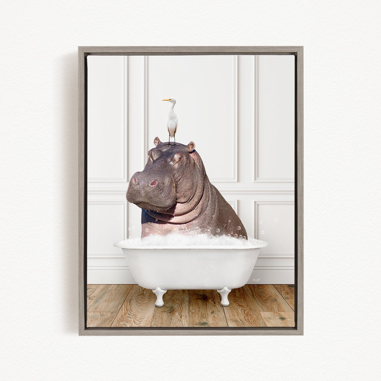 A framed image depicting a hippopotamus sitting in a bathtub, with a seagull perched on its head.