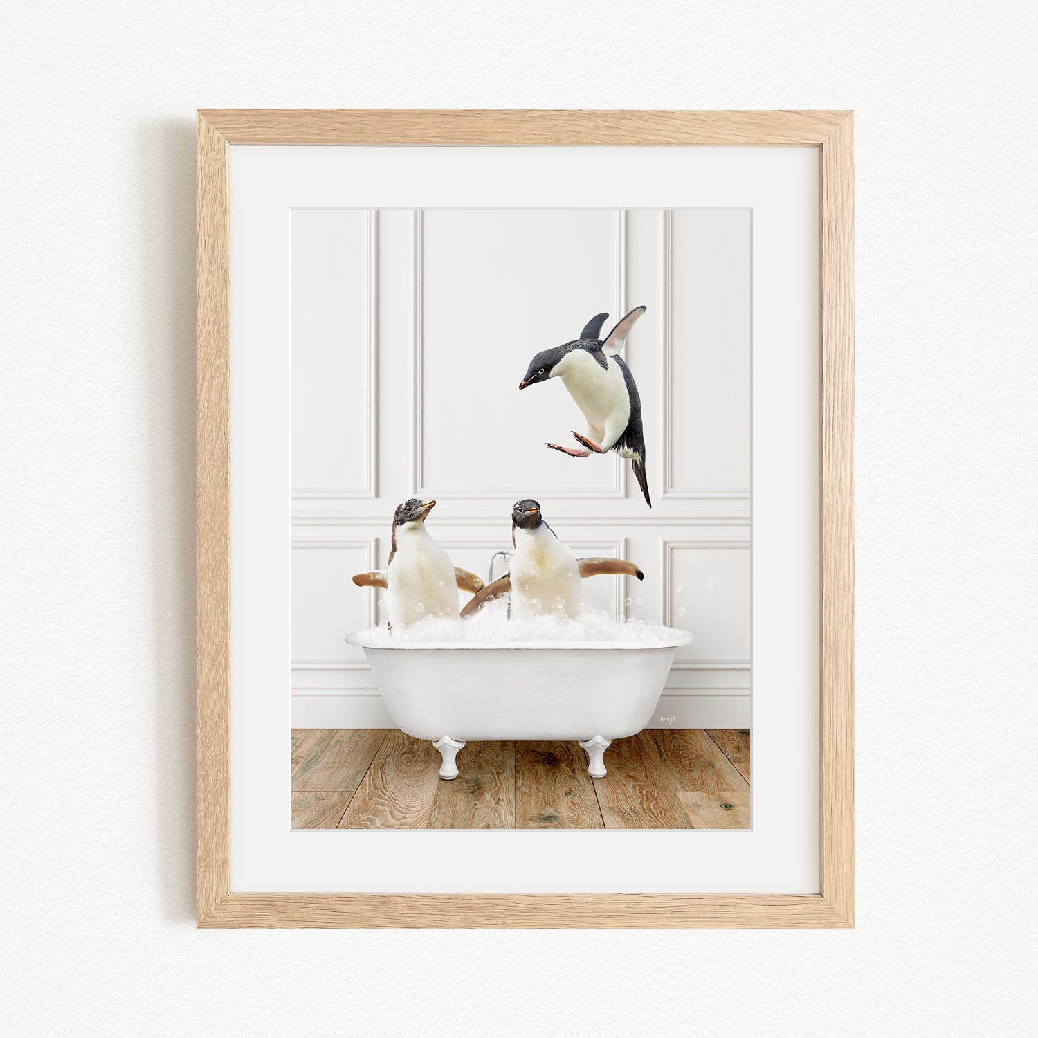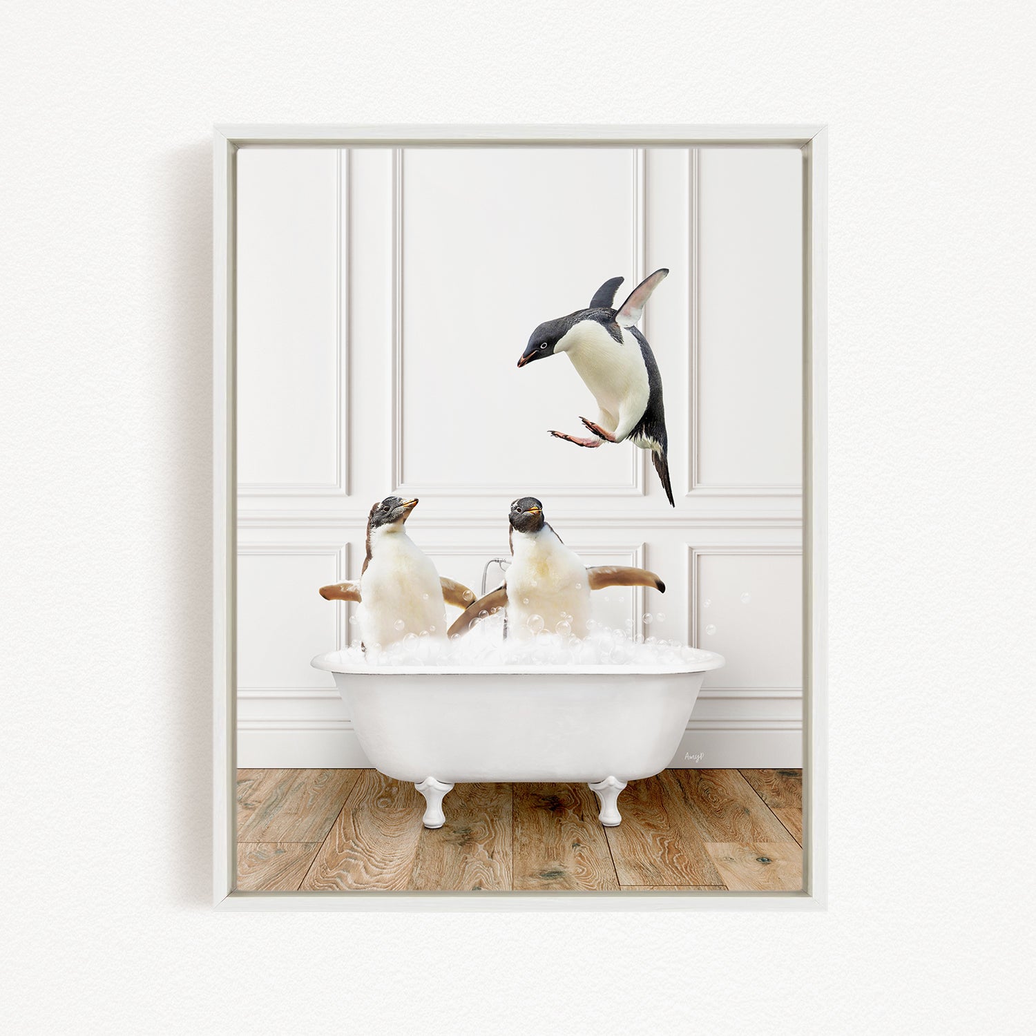 A framed image depicting three penguins sitting in a white bathtub, with one penguin flying towards the others.
