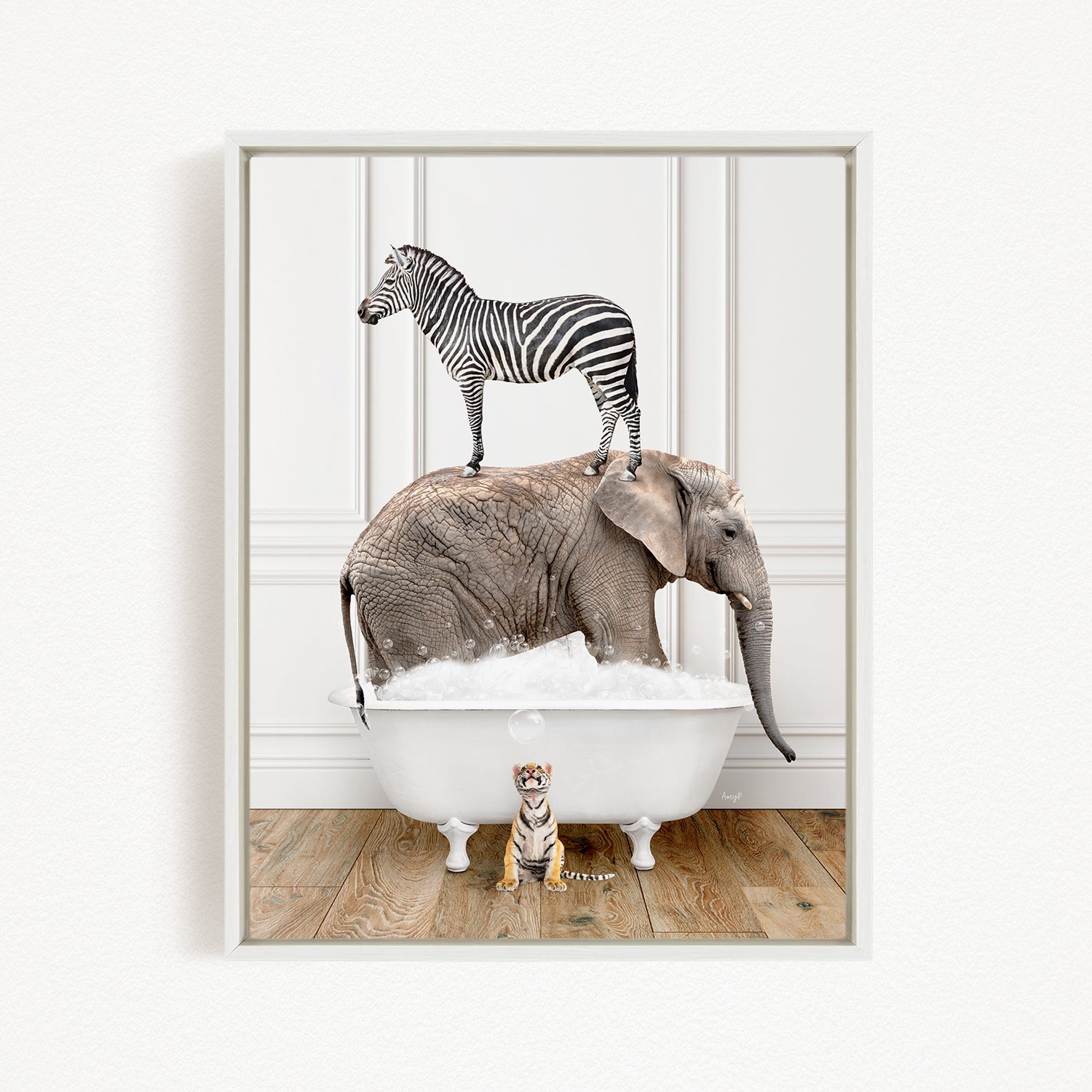 A zebra stands on an elephant's back, while a small tiger sits in a bathtub, creating a whimsical and playful scene.