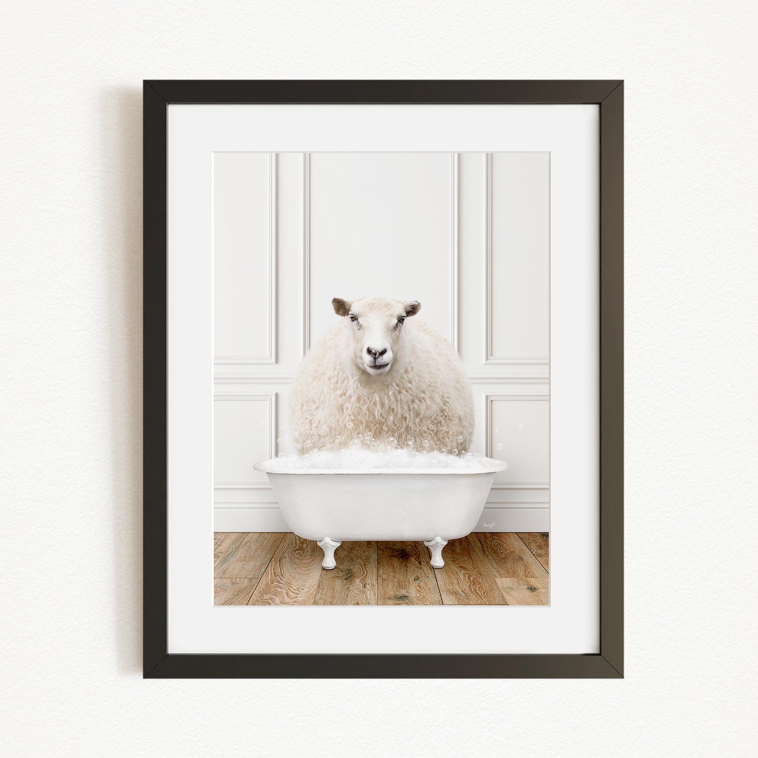 A fluffy white sheep sits in a white bathtub filled with bubbles, creating a whimsical and playful scene.