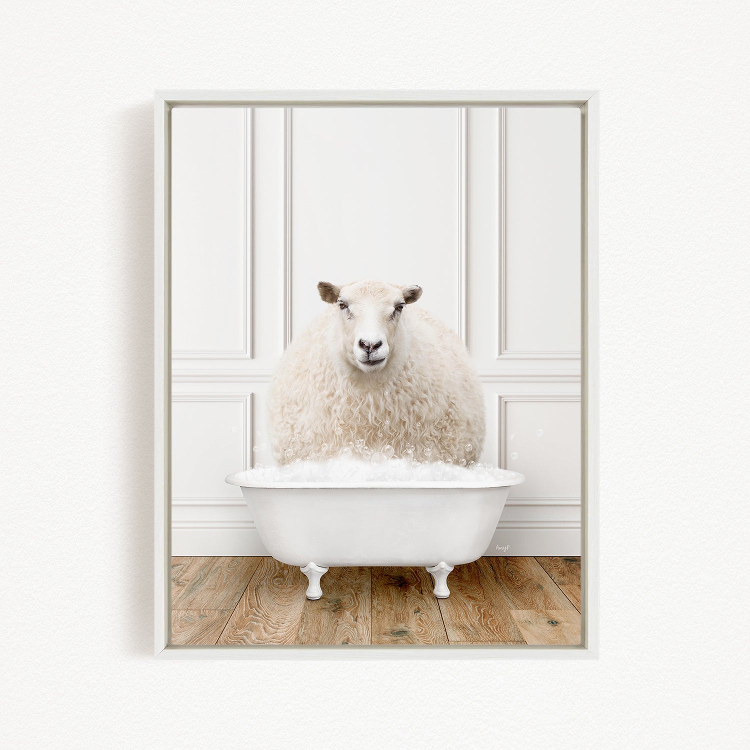 A fluffy white sheep sits in a white bathtub, surrounded by a wooden floor and white walls.