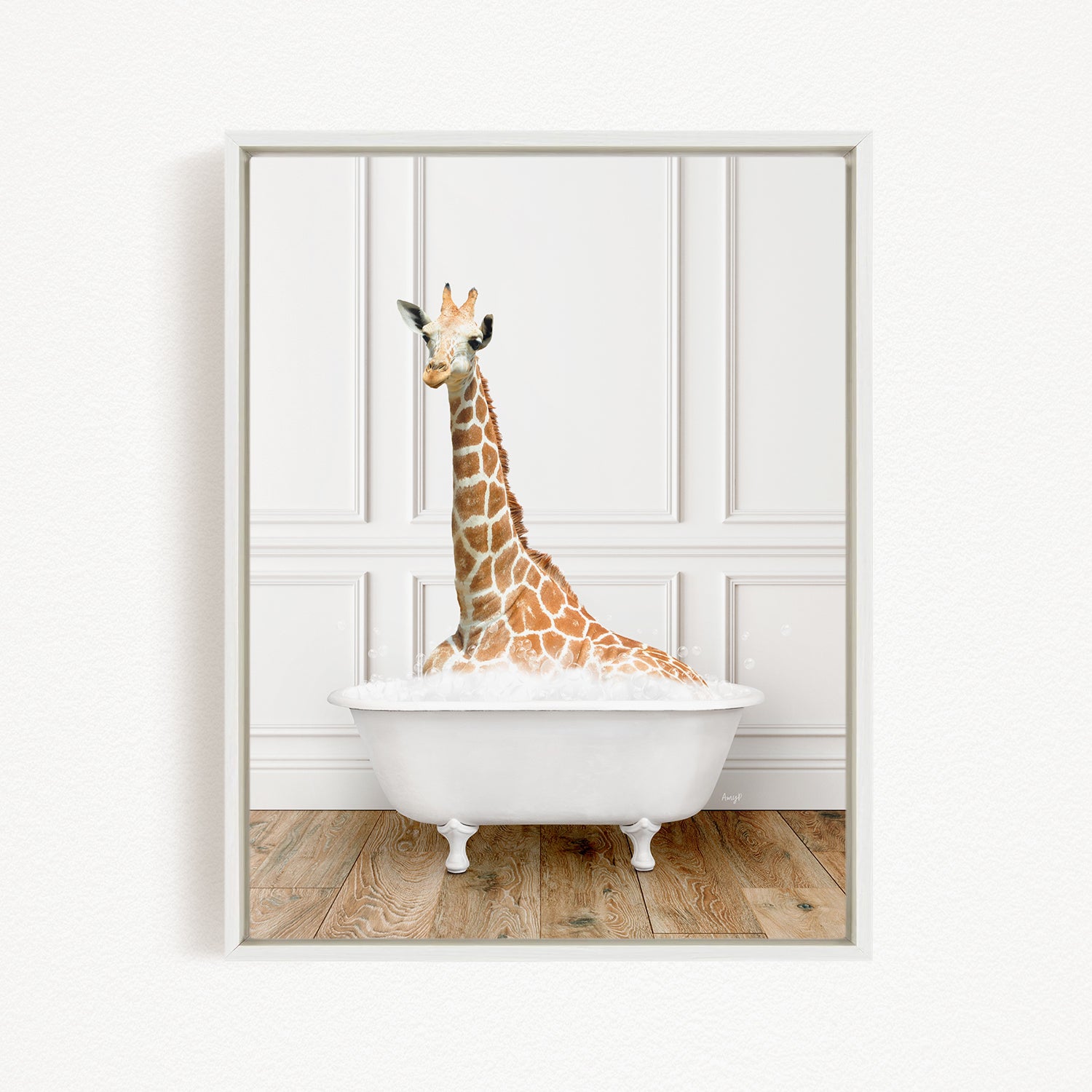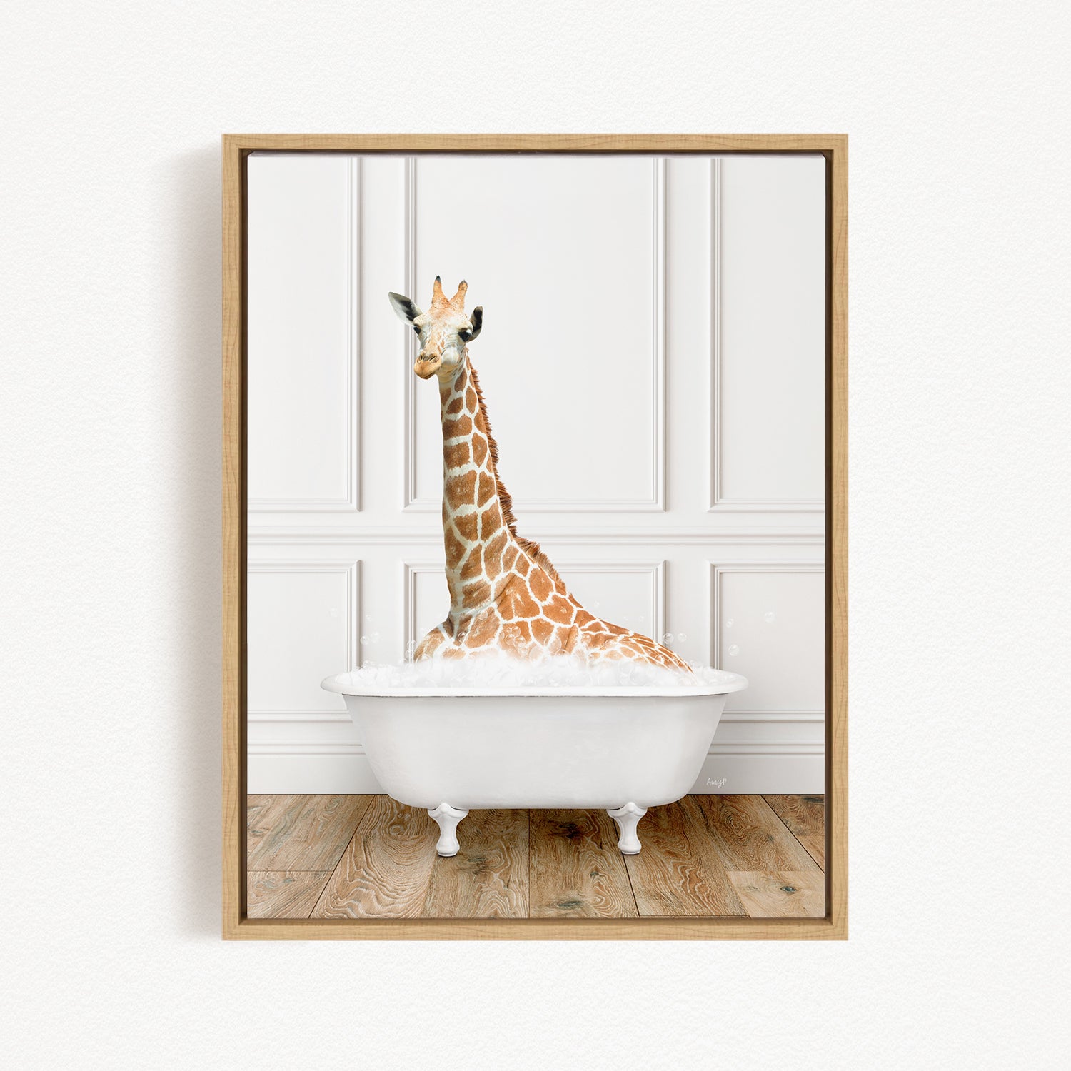 A giraffe sitting in a white bathtub filled with water, creating a whimsical and playful scene.