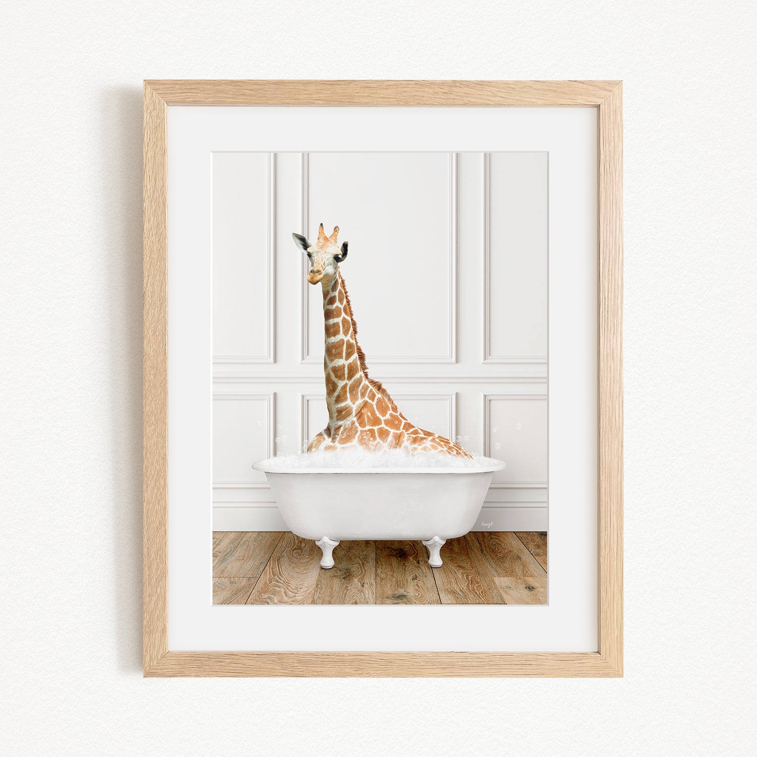 A giraffe sitting in a white bathtub filled with bubbles, creating a whimsical and playful scene.