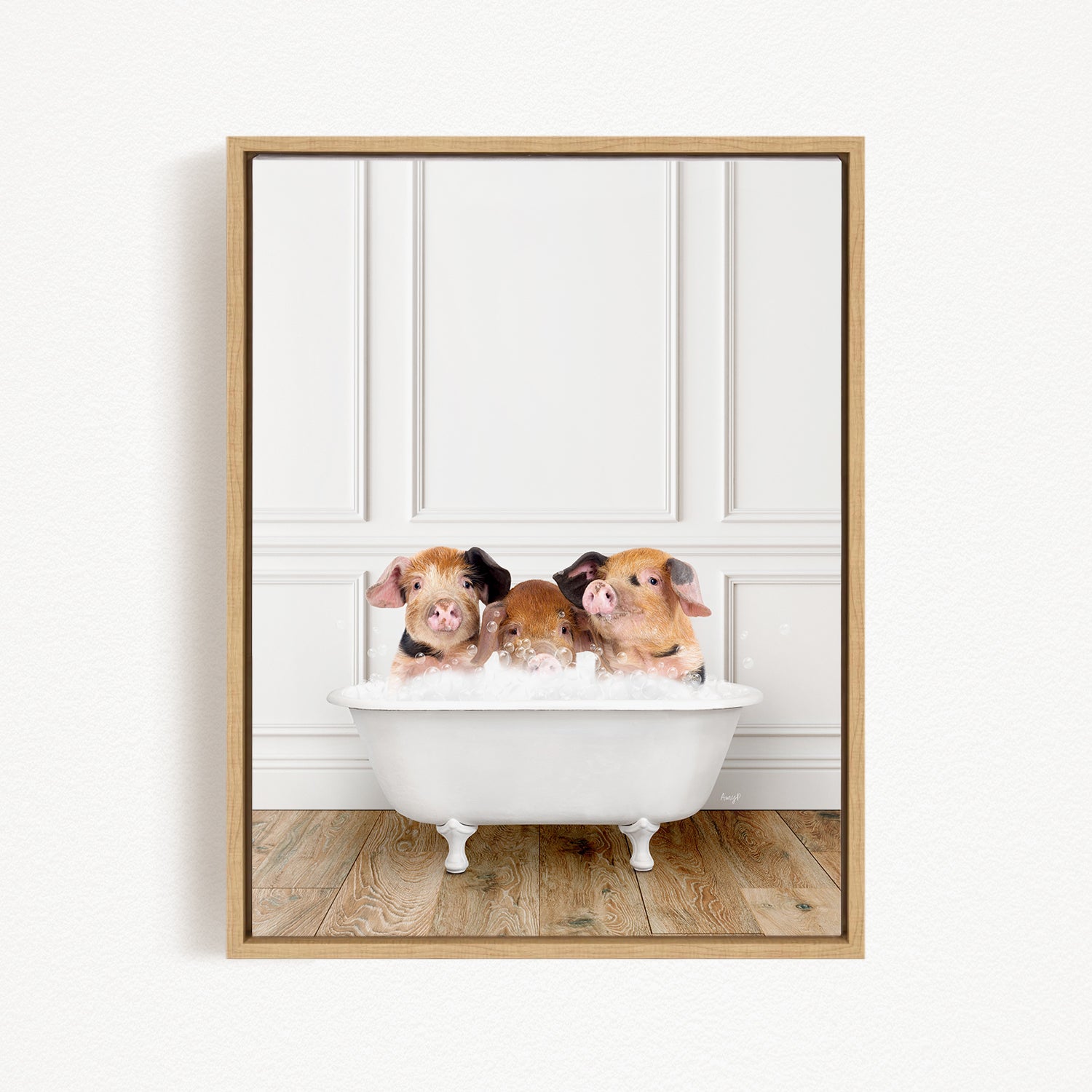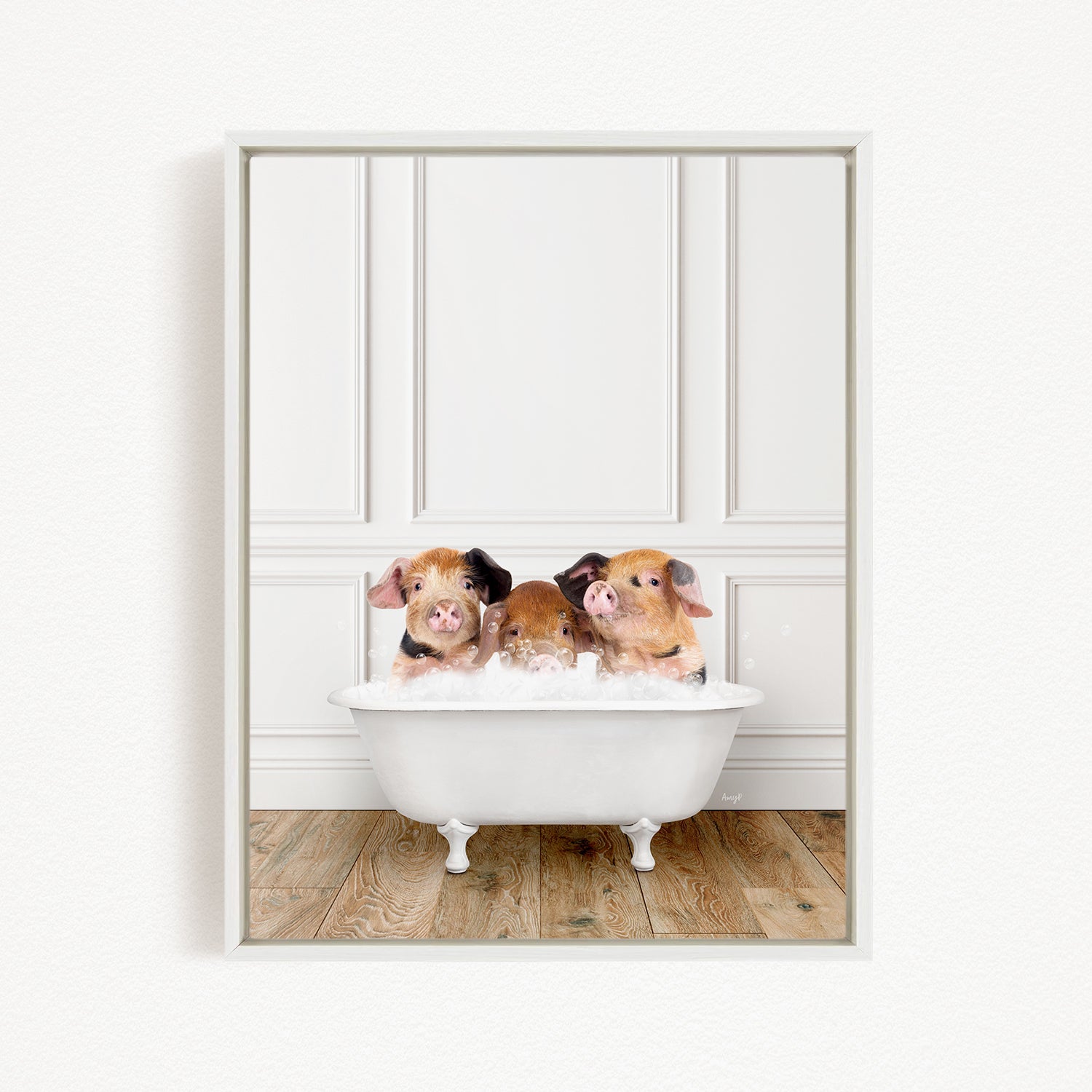 A framed image of three adorable pigs sitting in a white bathtub, enjoying a relaxing bath.