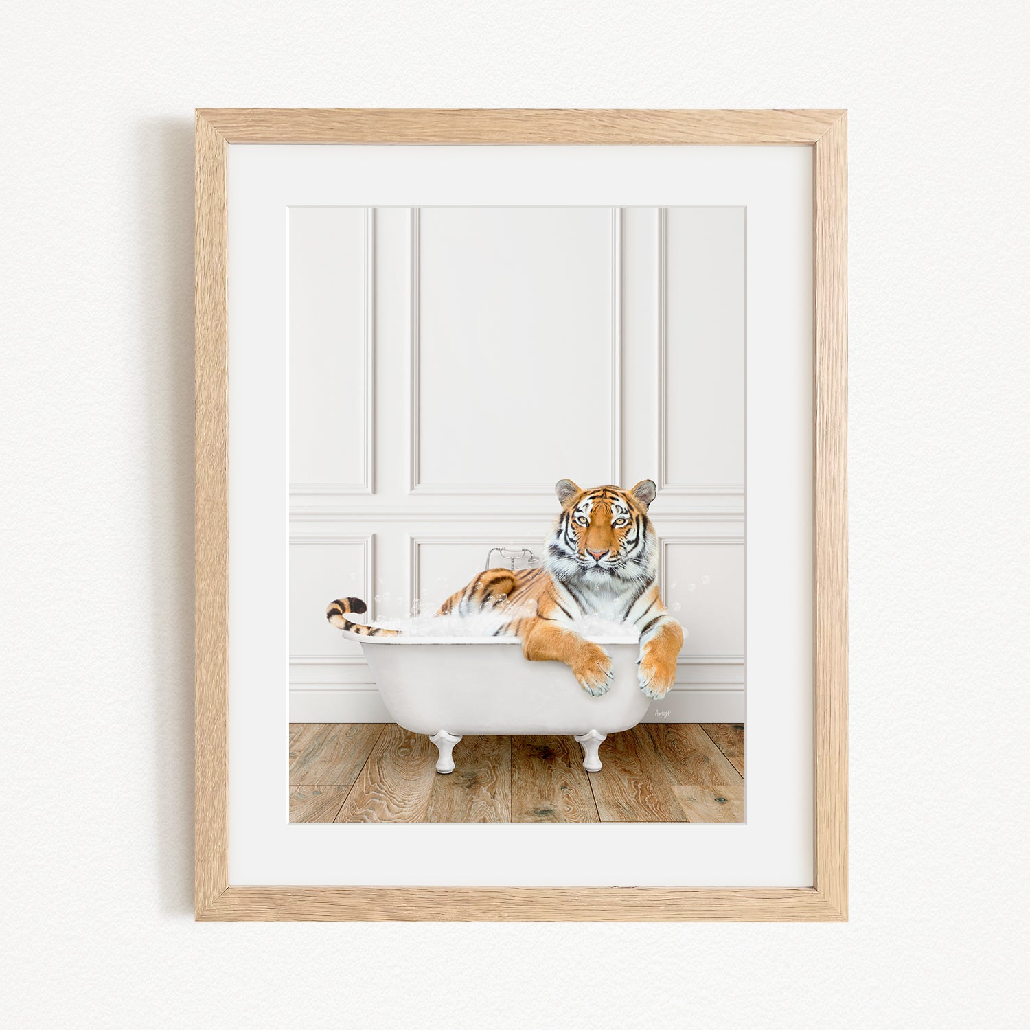 A tiger is sitting in a white bathtub, appearing relaxed and enjoying the bath.