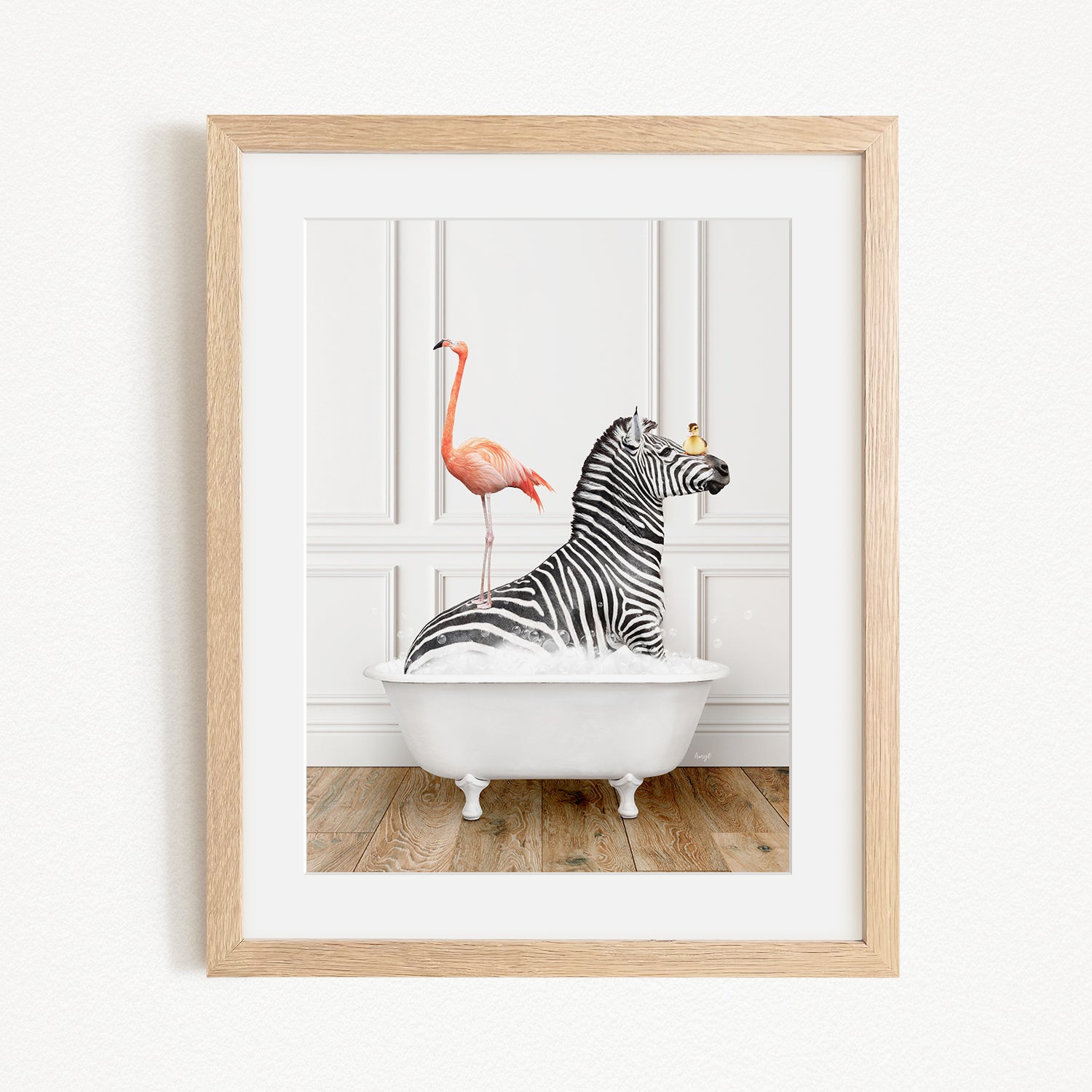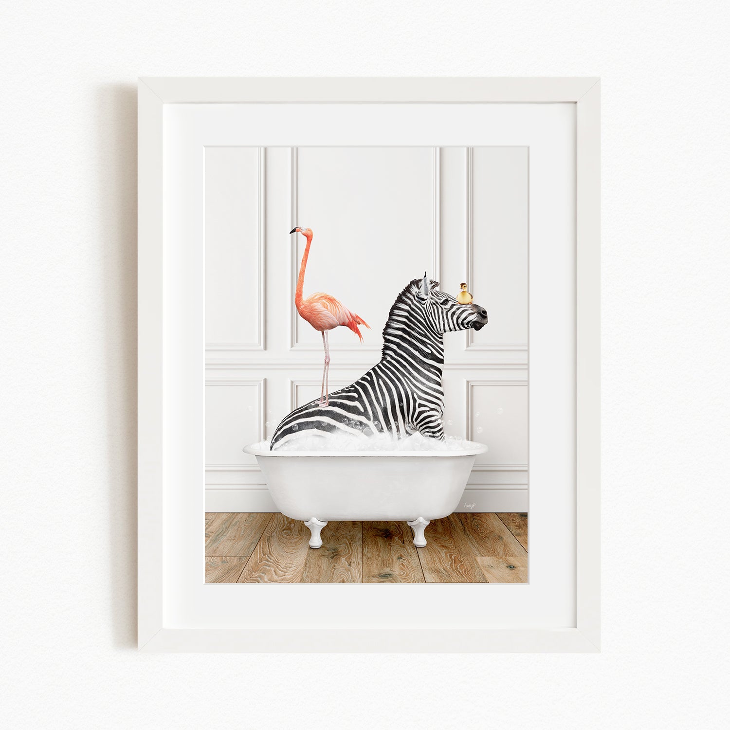 A framed image depicting a zebra sitting in a white bathtub, with a pink flamingo standing on its back.