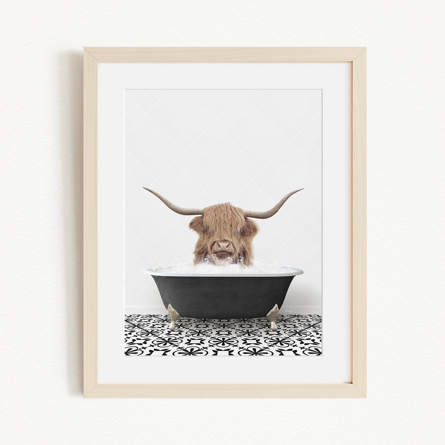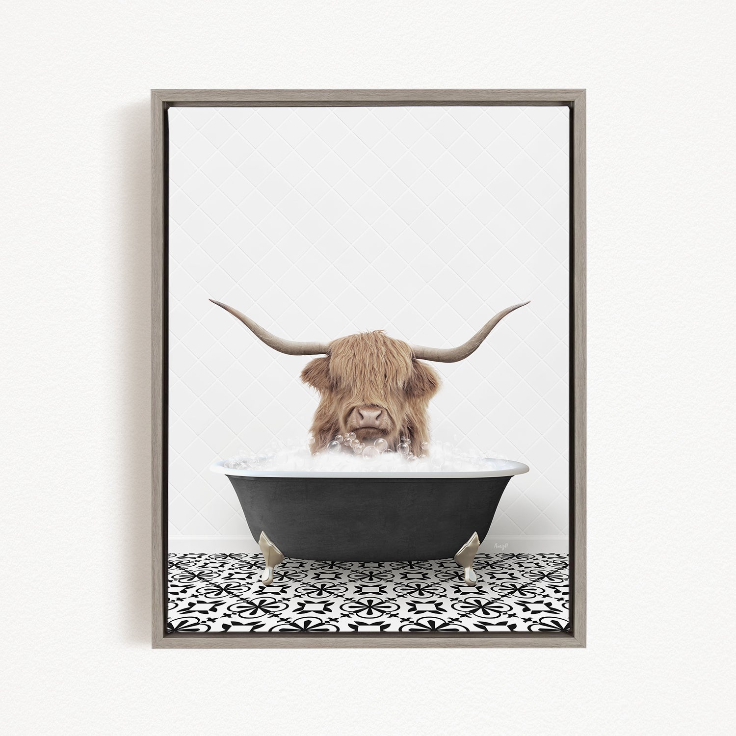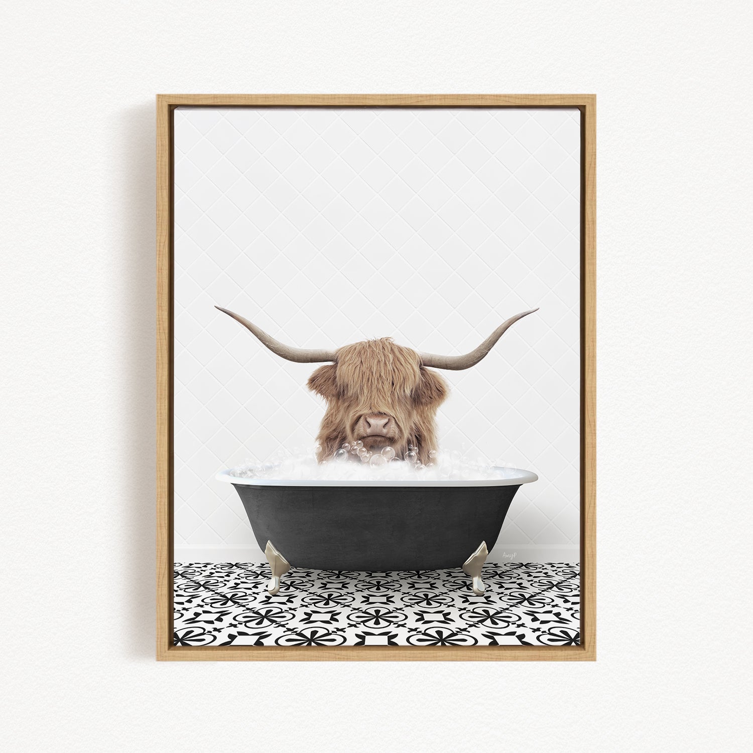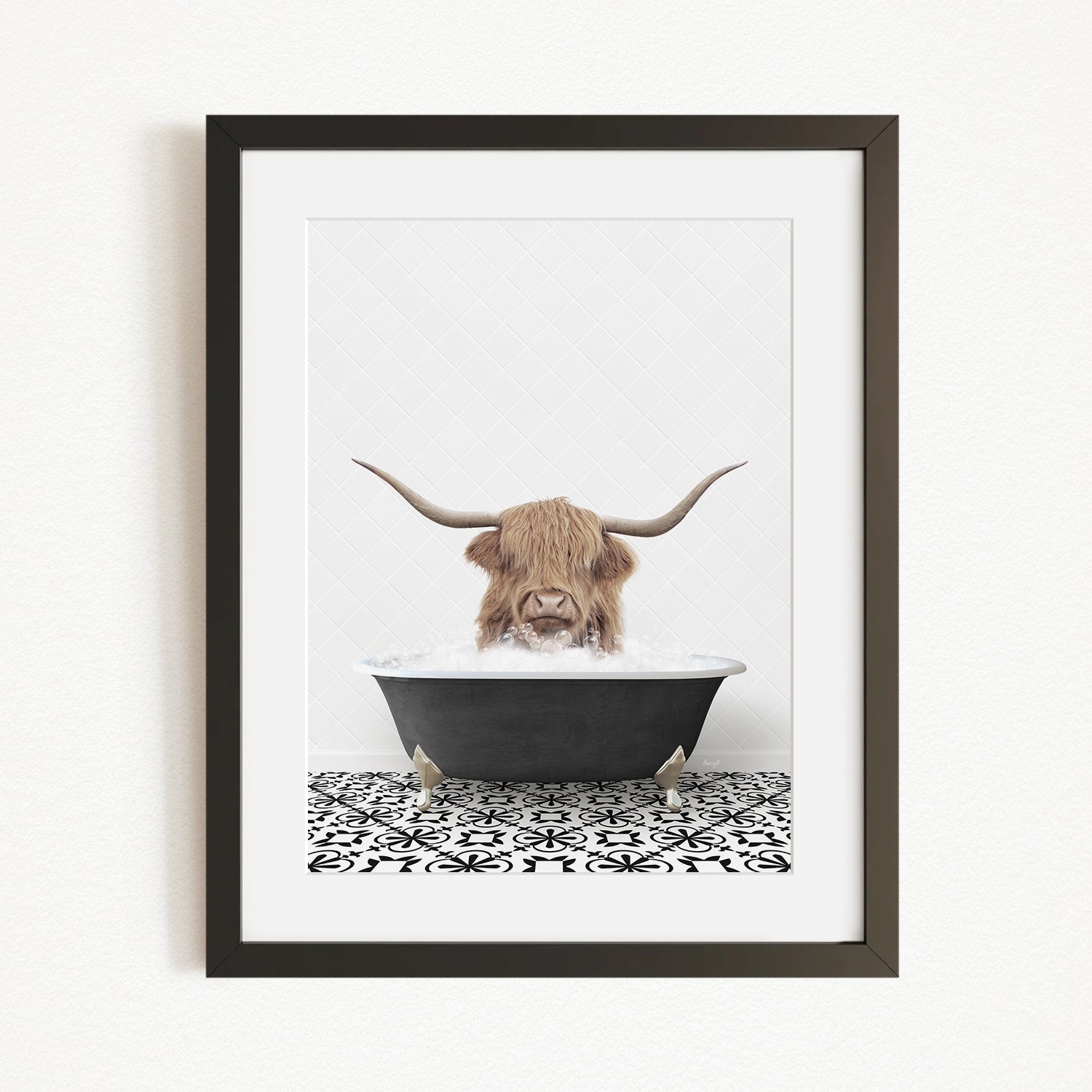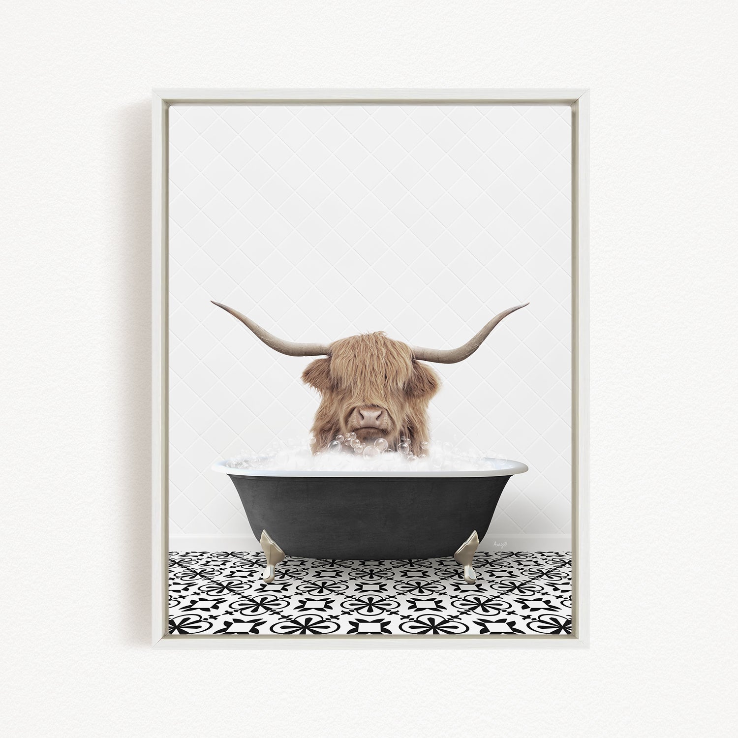 A framed image depicting a Highland cow with long horns sitting in a bathtub filled with water.