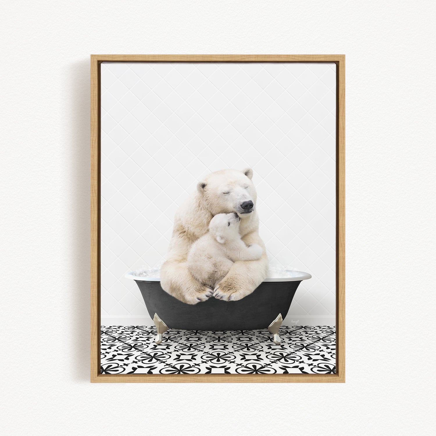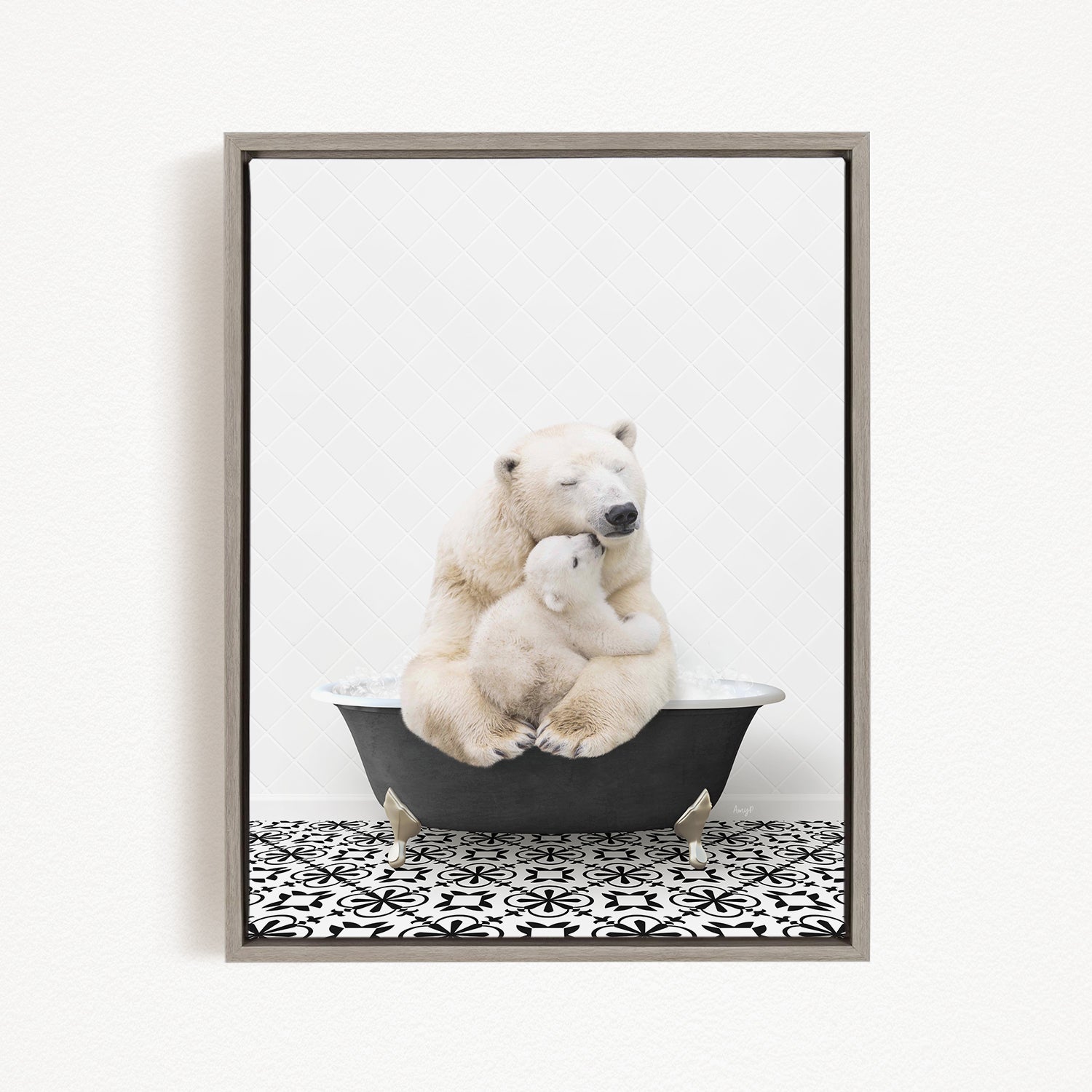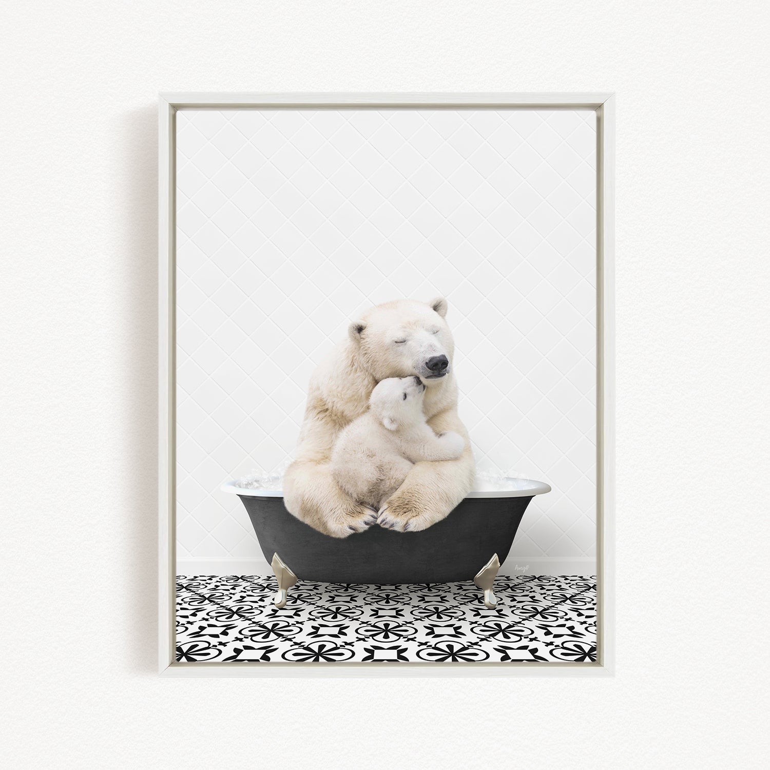 A framed image depicting two polar bears sitting in a bathtub, with one bear appearing to be hugging the other.