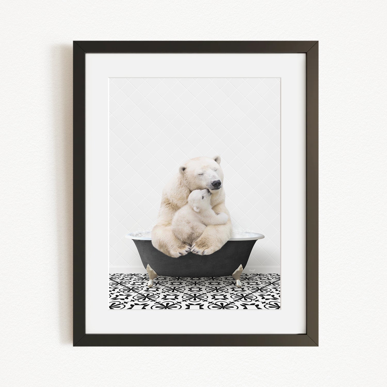 A mother polar bear tenderly embracing her cub in a black bathtub, set against a white background with a black and white patterned floor.
