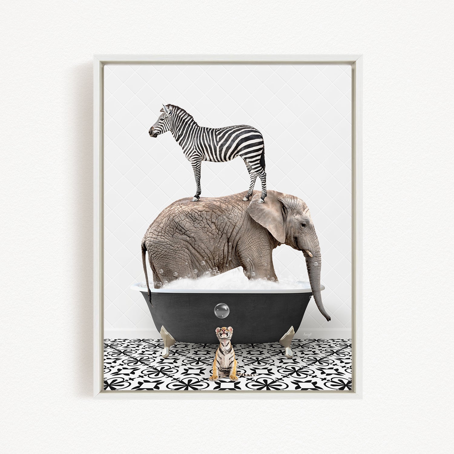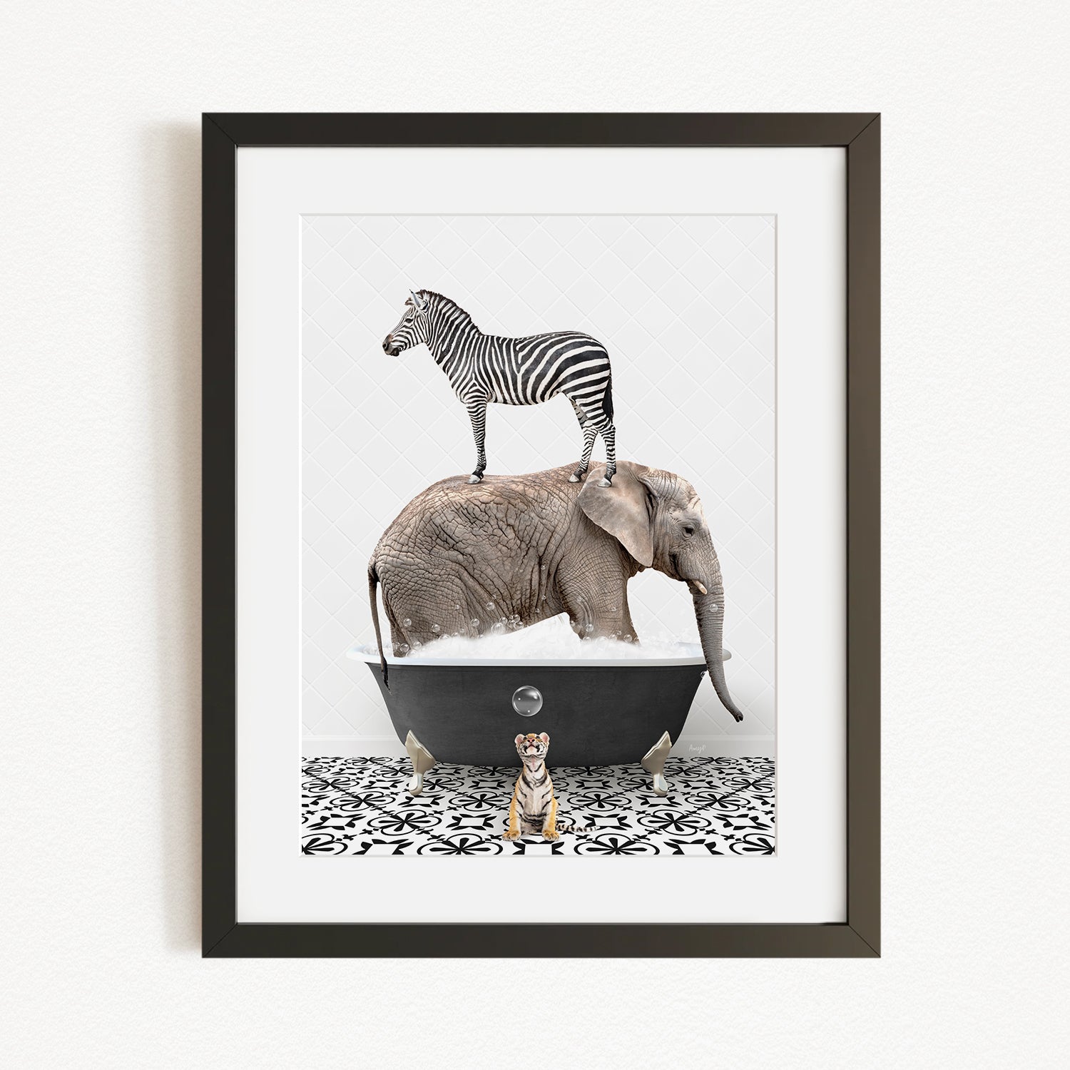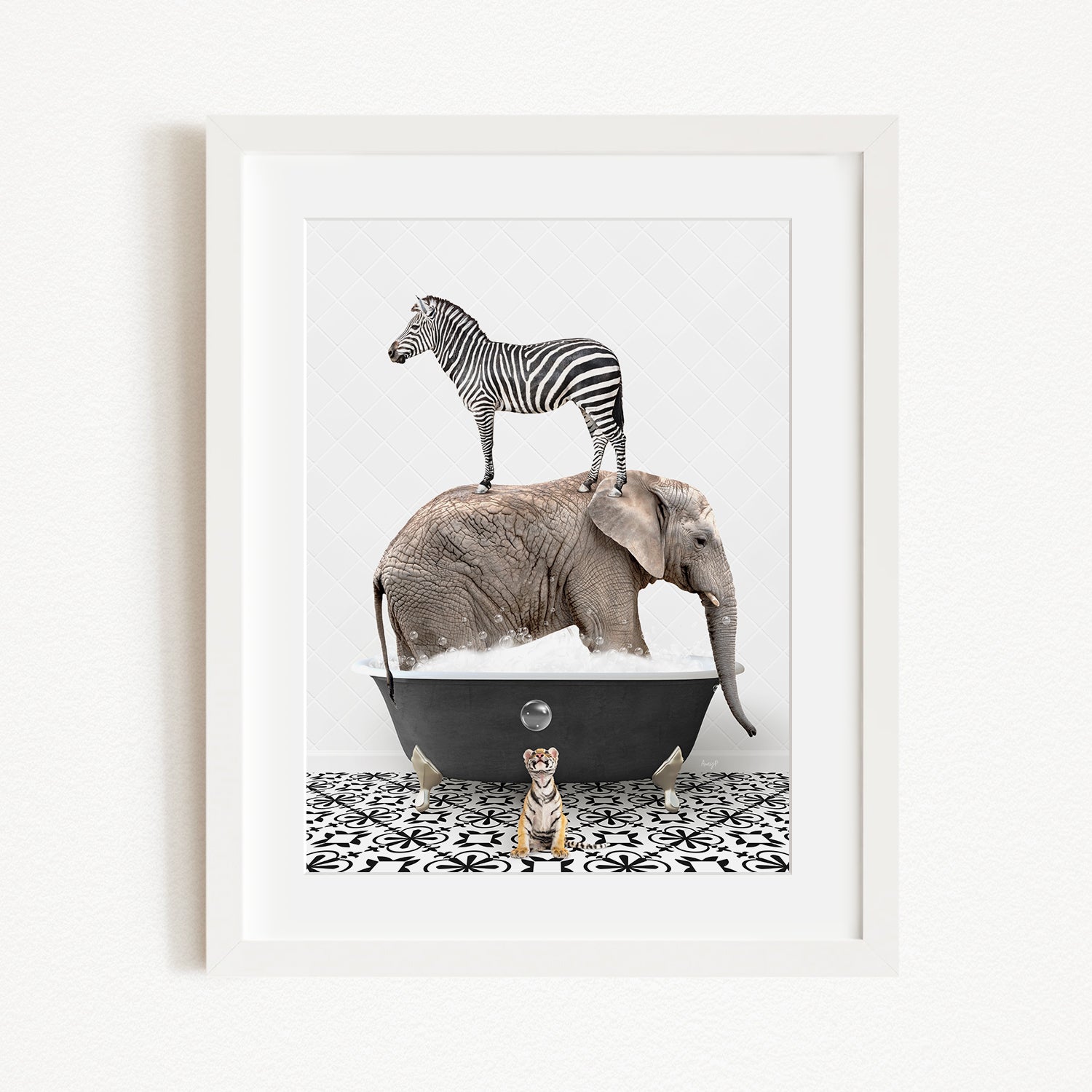 A framed image depicting a zebra standing on an elephant's back while an elephant is submerged in a bathtub, with a tiger sitting nearby.
