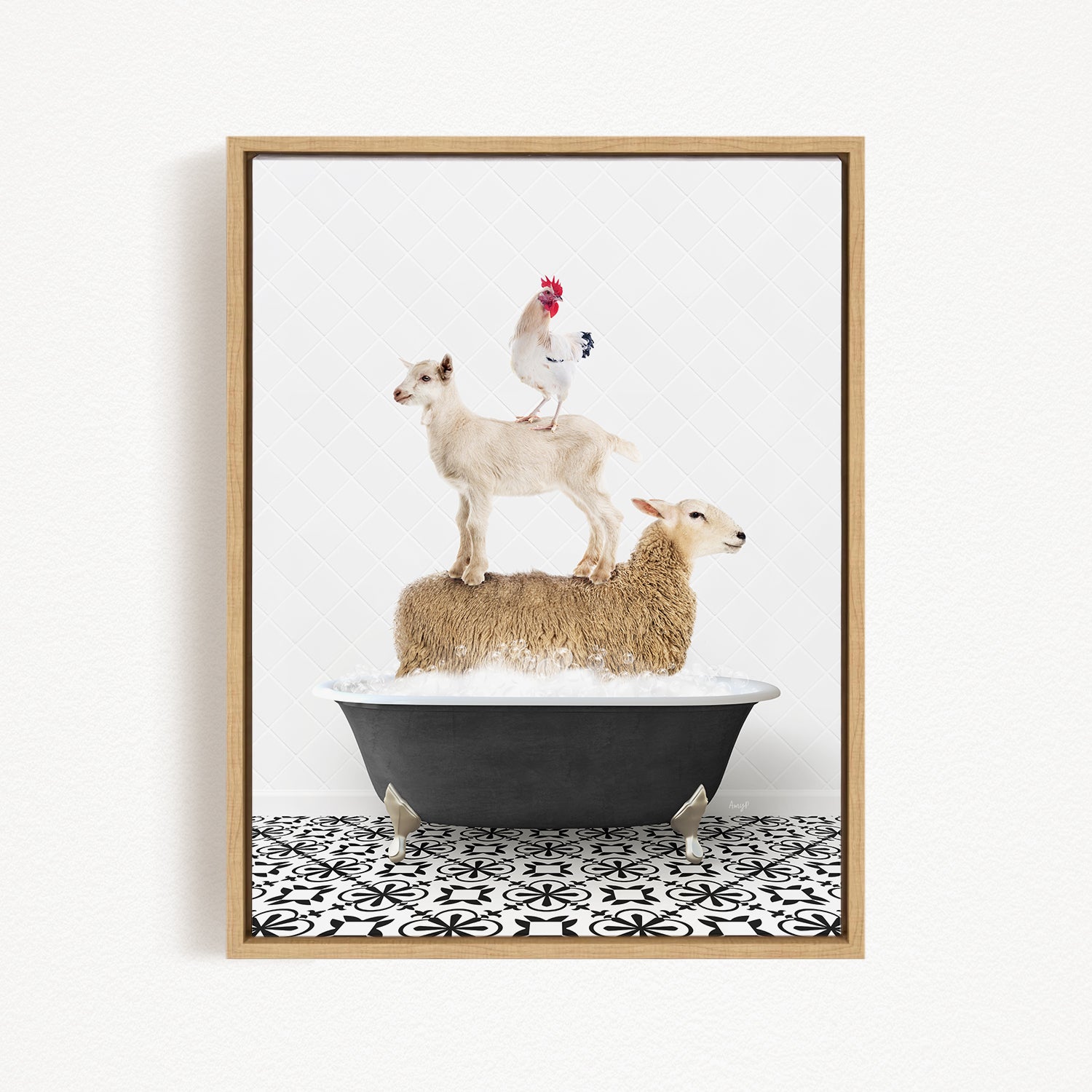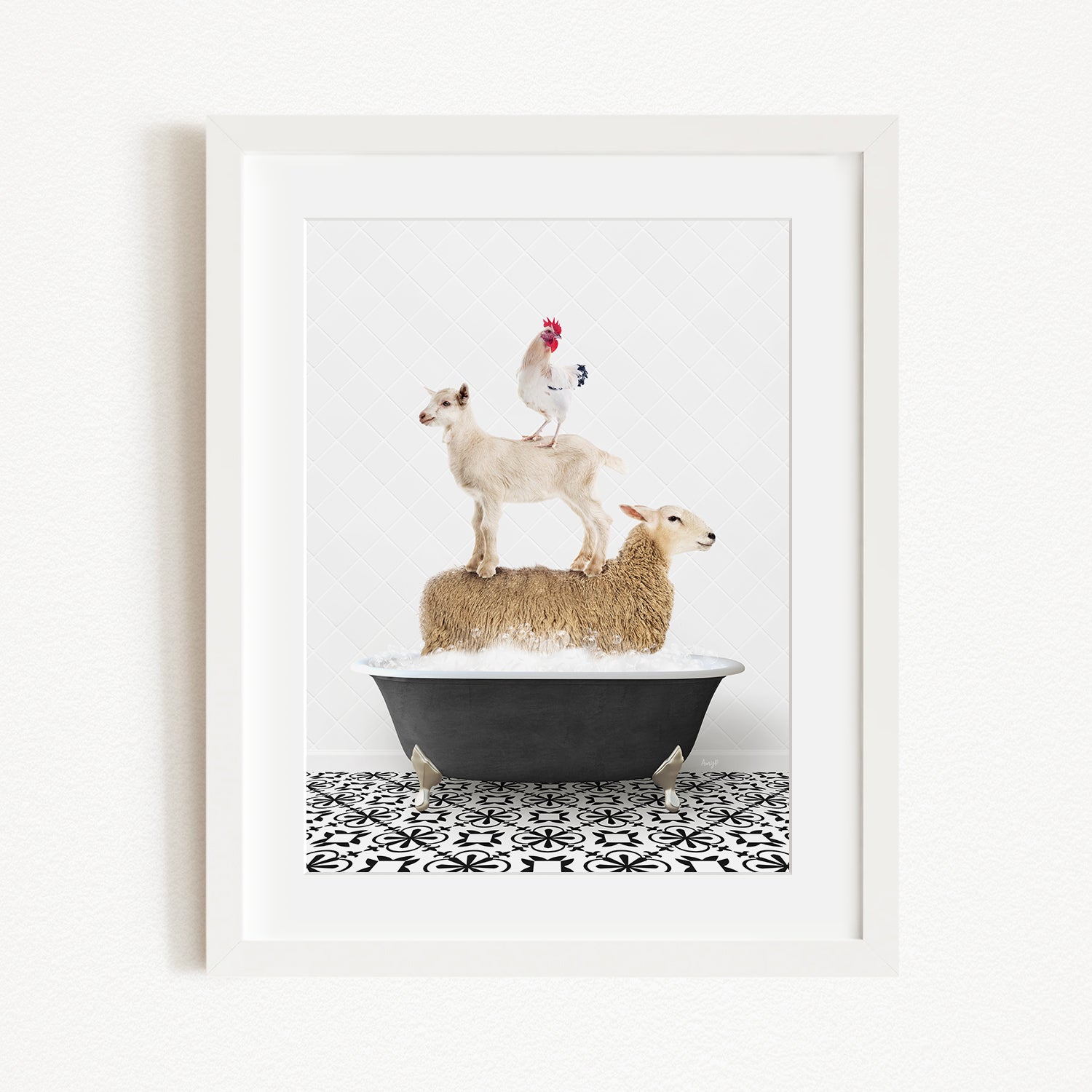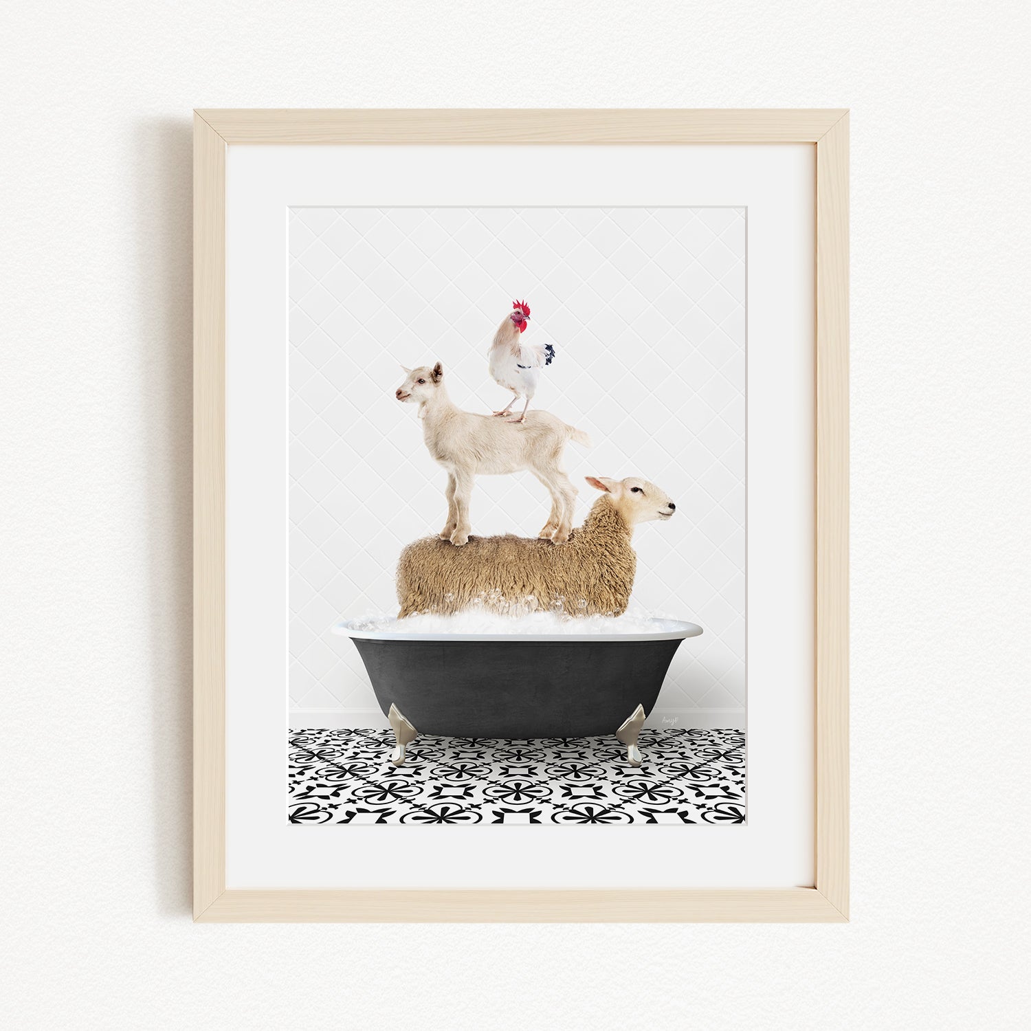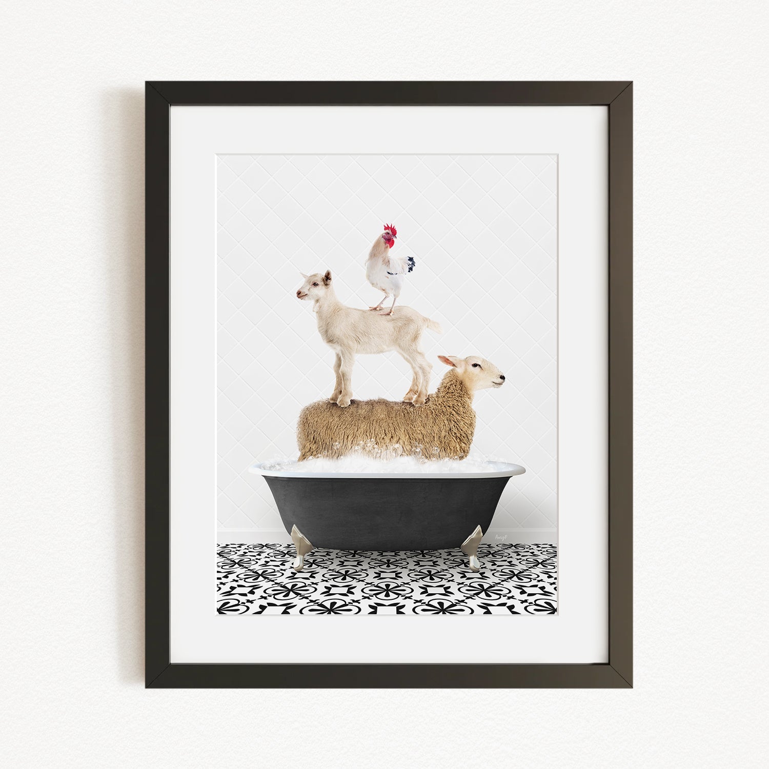 A framed image depicting a sheep standing on a goat's back while a chicken stands on top of a sheep in a bathtub.