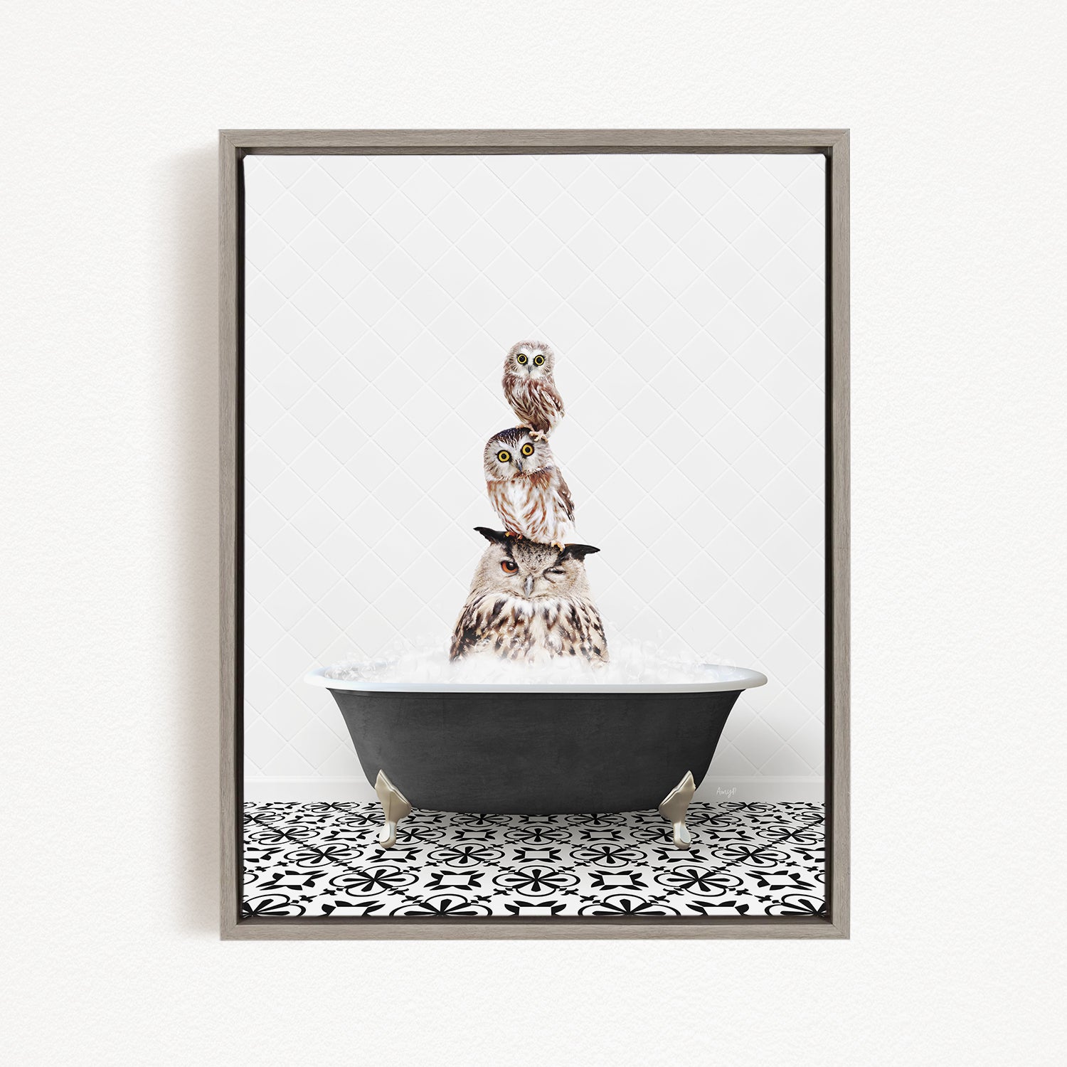 A framed image depicting three owls sitting in a bathtub filled with water, creating a whimsical and playful scene.