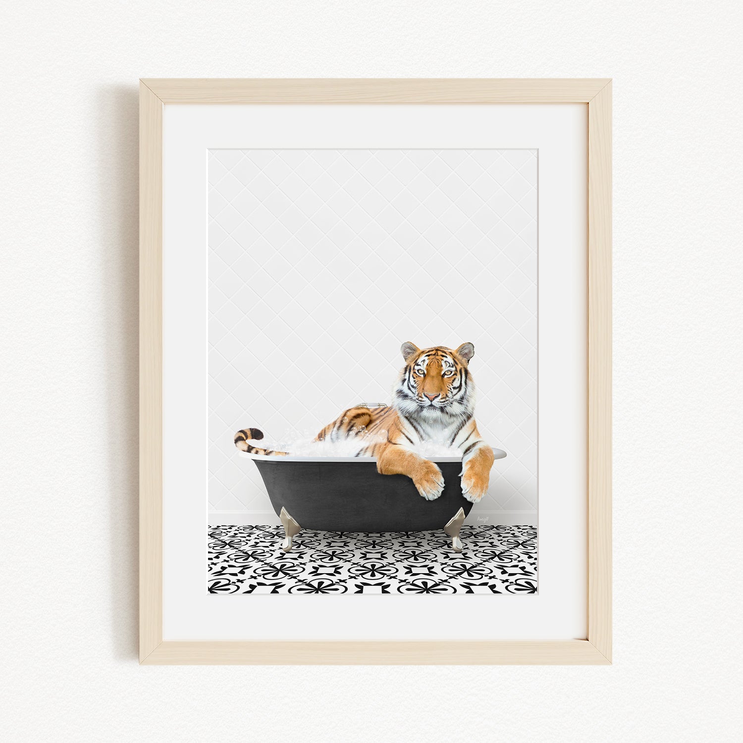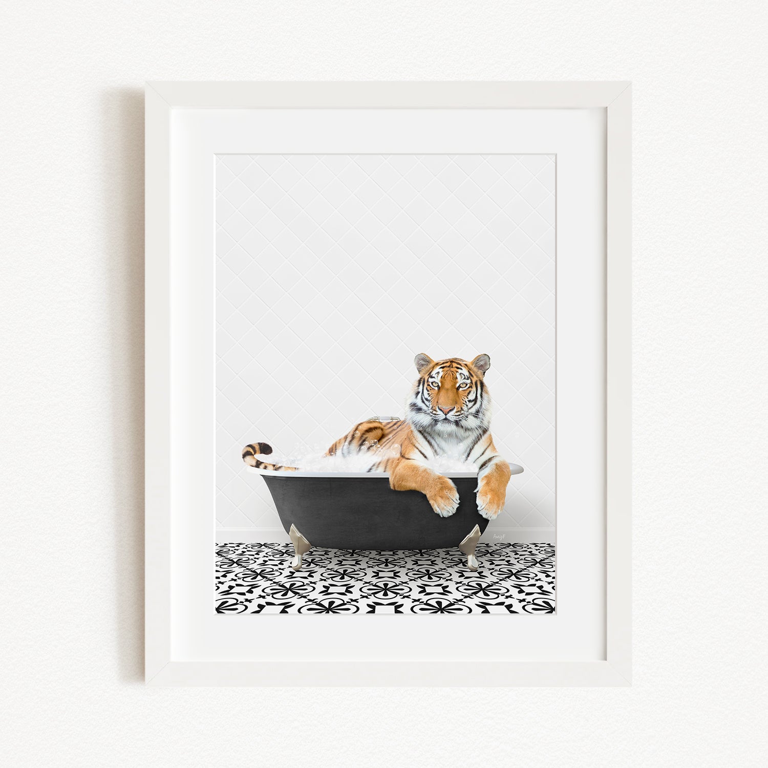 A tiger is sitting in a black bathtub, surrounded by a black and white patterned floor.