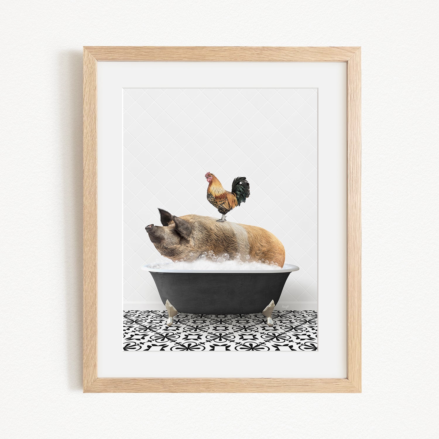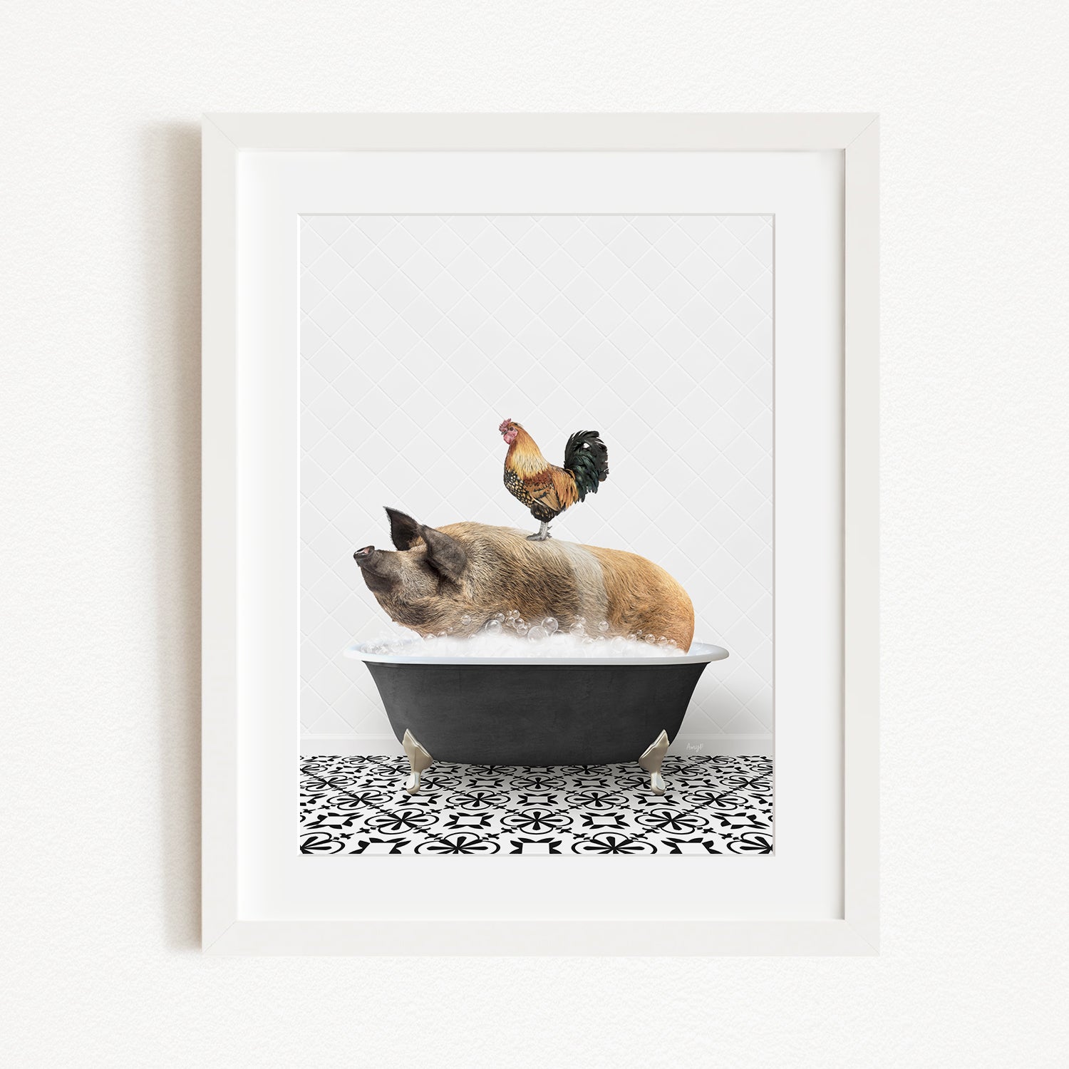 A rooster sits atop a pig in a black bathtub, with a black and white patterned floor beneath them.